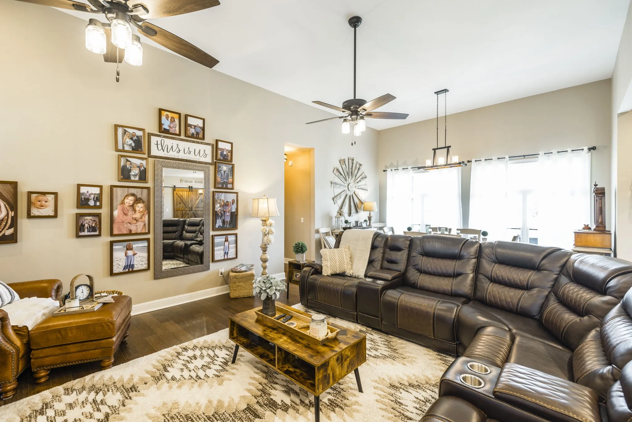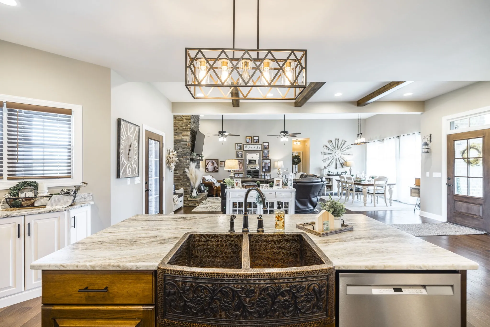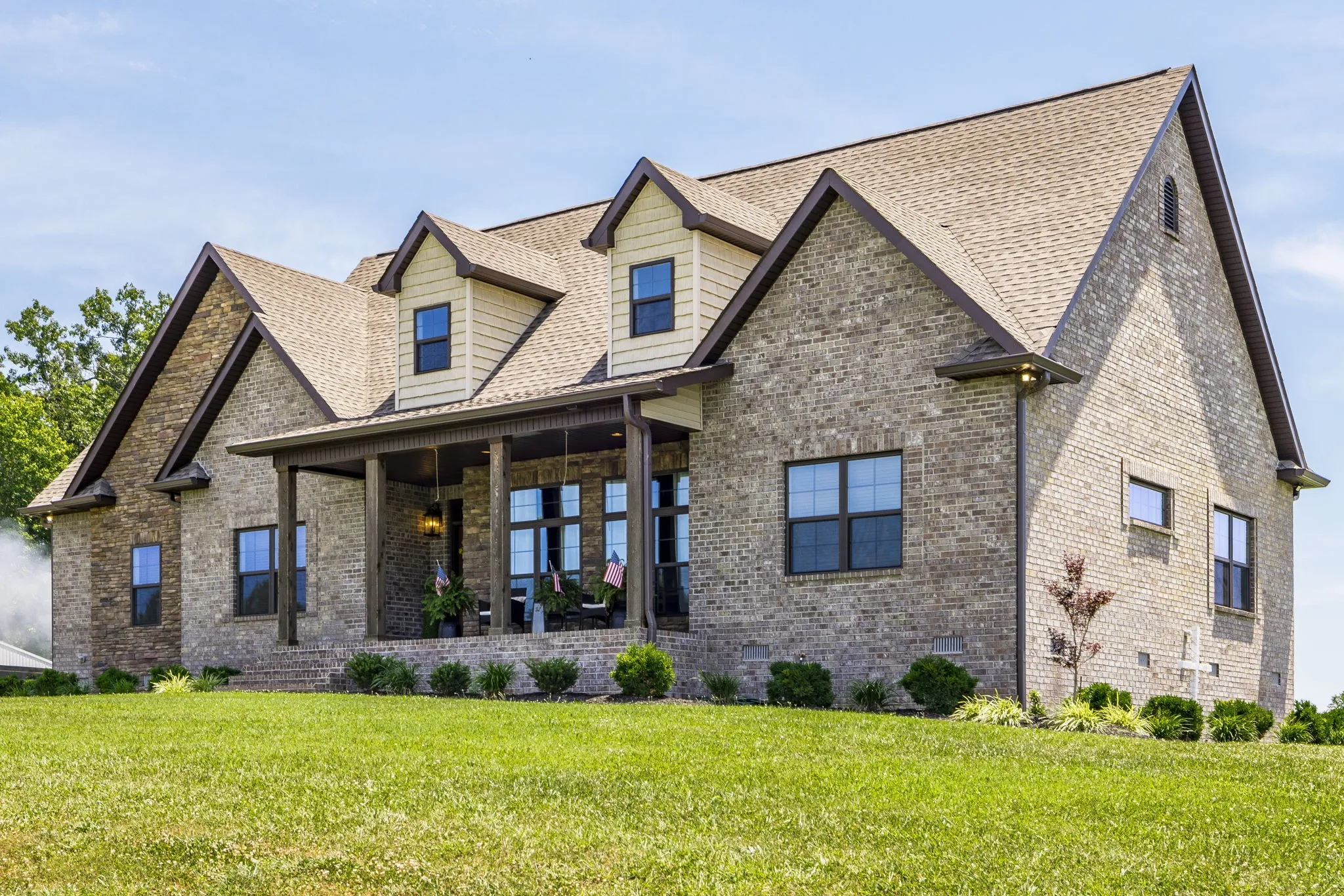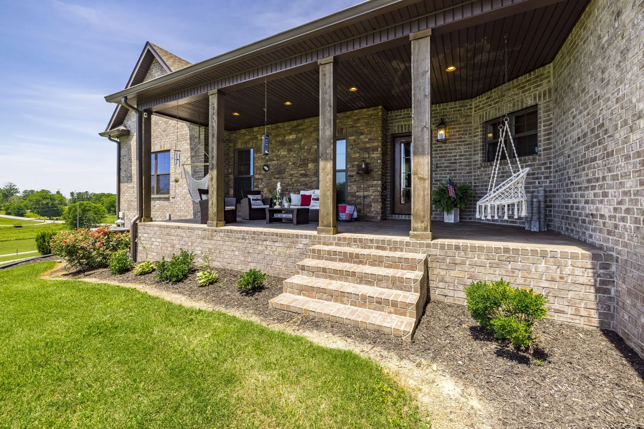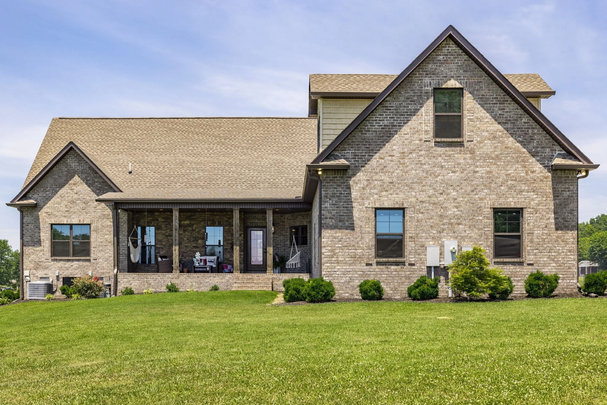 This home is a showplace! Gorgeous, all brick country home with soaring ceilings! 3 bedrooms on main floor (Rec Room upstairs being used as 4th bedroom), floor to ceiling stone fireplace w/ gas logs and remote, hand-stamped anti-microbial farm sink, huge pantry, custom local cabinetry and barn doors, 5-panel doors, leathered granite countertops in kitchen, pull out shelving, soft-touch drawers, engineered hardwood, jack and jill bath between secondary bedrooms, shiplap in some rooms, 2 HVAC units w/zoned thermostats, floored attic space, extra closets stamped concrete porches. Bluetooth capable (insulated) garage doors. Property fenched on 3 sides. Sit on the covered front porch and watch the sun rise or sit on the covered back patio and watch the sun set!