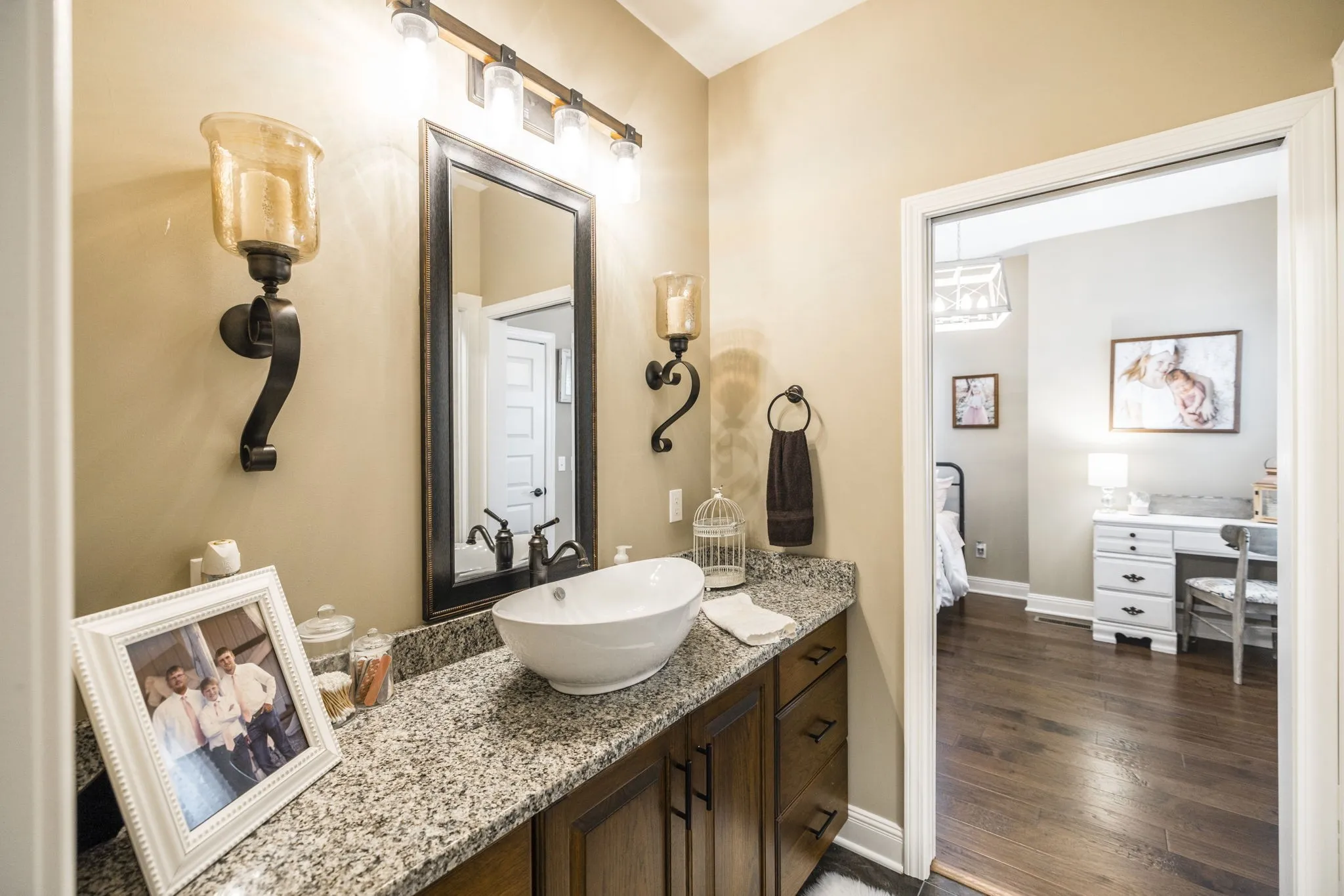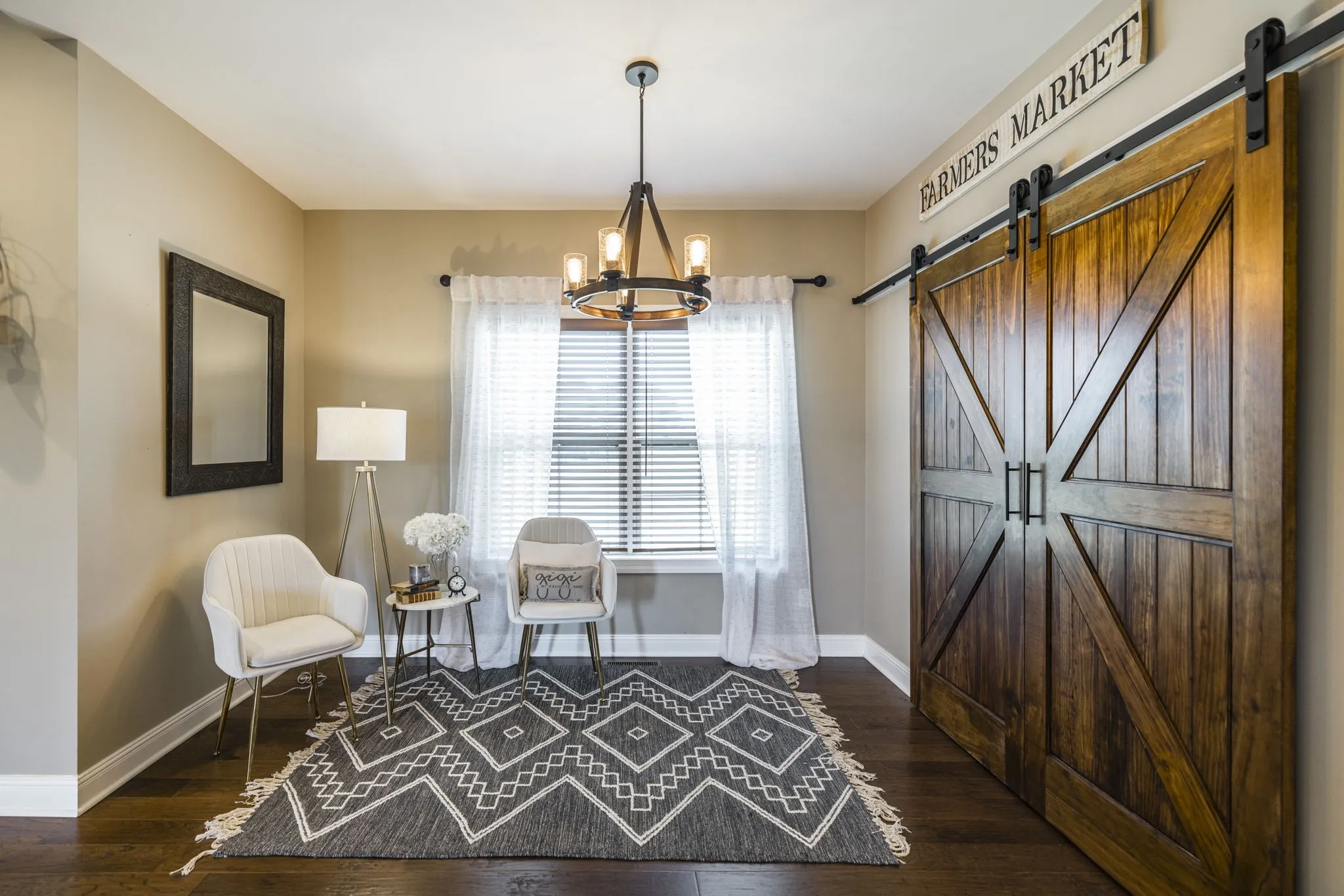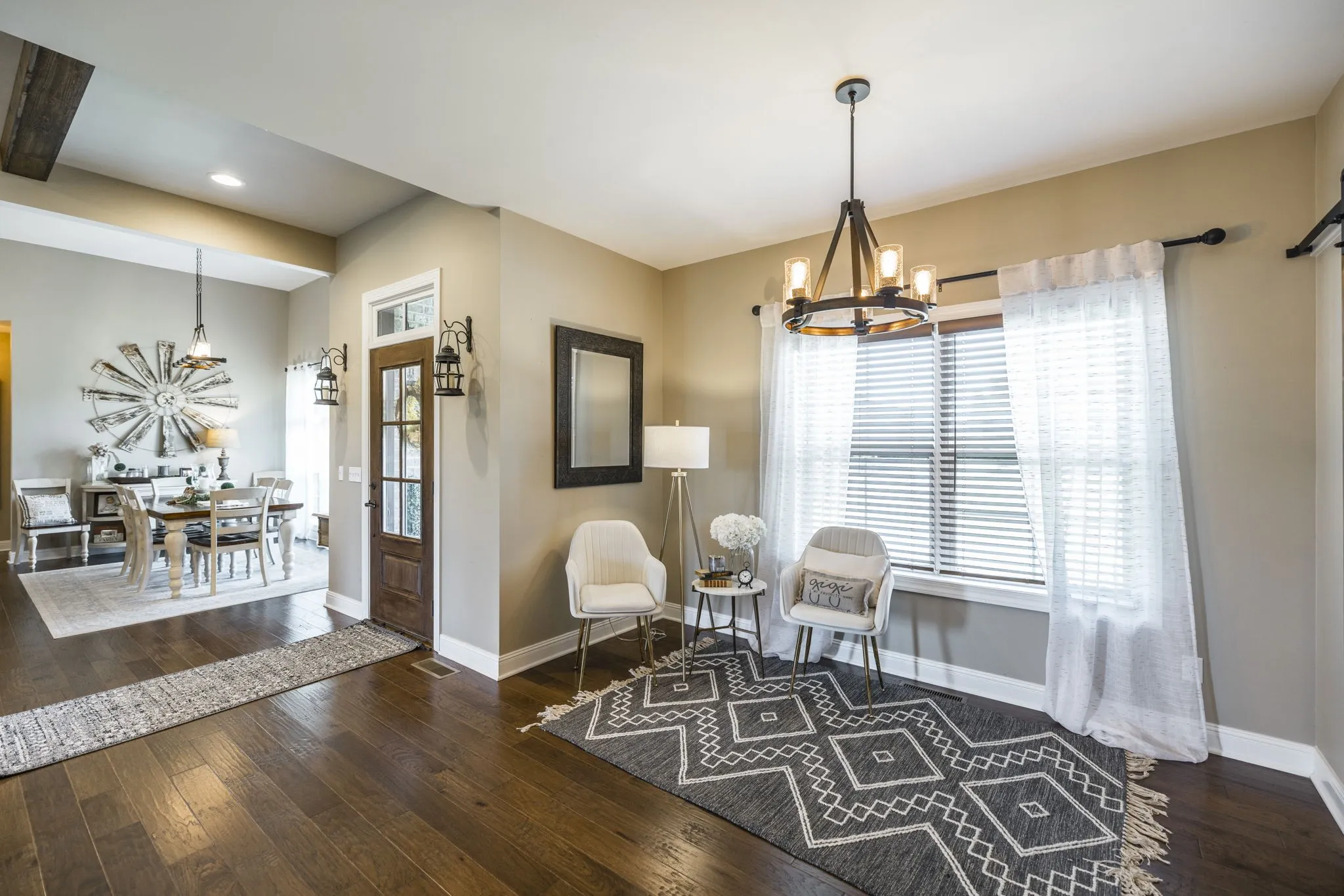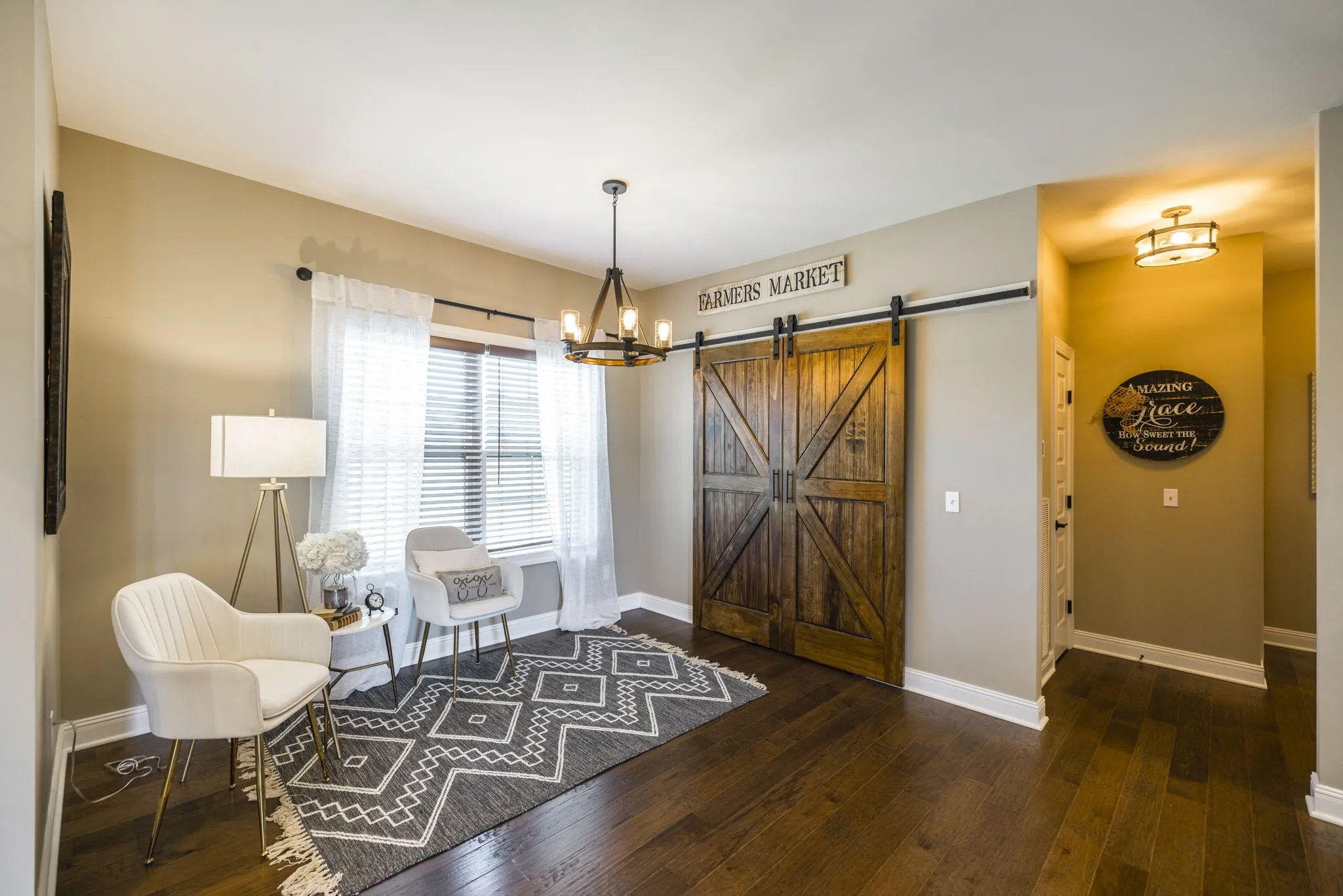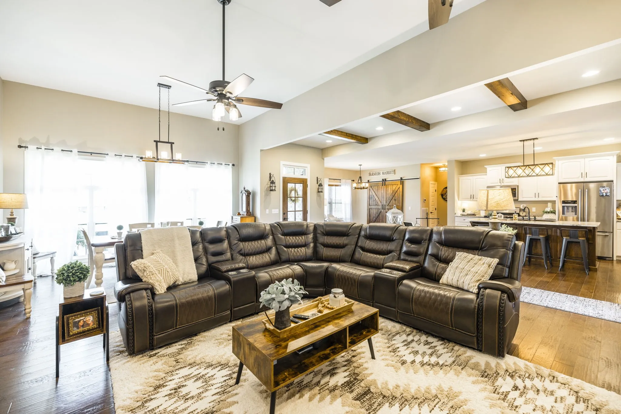 This home is a showplace! Gorgeous, all brick country home with soaring ceilings! 3 bedrooms on main floor (Rec Room upstairs being used as 4th bedroom), floor to ceiling stone fireplace w/ gas logs and remote, hand-stamped anti-microbial farm sink, huge pantry, custom local cabinetry and barn doors, 5-panel doors, leathered granite countertops in kitchen, pull out shelving, soft-touch drawers, engineered hardwood, jack and jill bath between secondary bedrooms, shiplap in some rooms, 2 HVAC units w/zoned thermostats, floored attic space, extra closets stamped concrete porches. Bluetooth capable (insulated) garage doors. Property fenched on 3 sides. Sit on the covered front porch and watch the sun rise or sit on the covered back patio and watch the sun set!