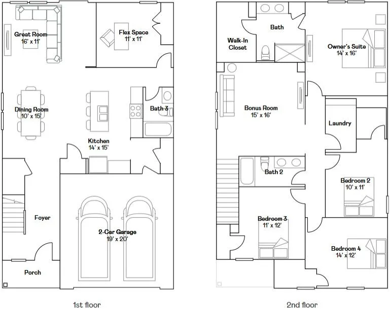 The Ironwood is approx. 2,460 sqft. The home is a four bedroom with three baths. This plan is popular for its spacious first floor flex room. Including the great room, dinning room, and kitchen lay out. This plan also has a second floor bonus room. Our Everything Included homes feature 42″ shaker cabinets, subway tile back-splash, quartz counter-tops, all the kitchen appliances, and more!
