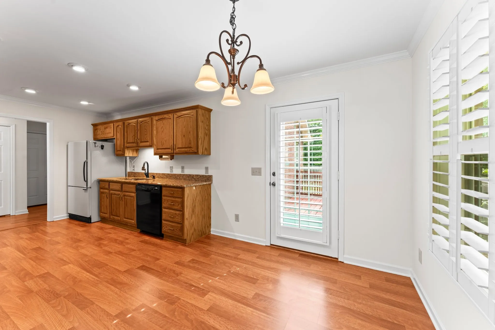 Beautiful move in ready all brick 3 bedroom 2 bath one level home with fenced private backyard, plantation shutters, deck, granite counters, 2 car garage w/ceiling fans & insulated door, freshly painted, carpets cleaned, gas log fireplace & vaulted ceiling in living room, tile walk in shower in primary bath & garden tub, all in a very convenient location extremely close to all the amenities of Tullahoma.