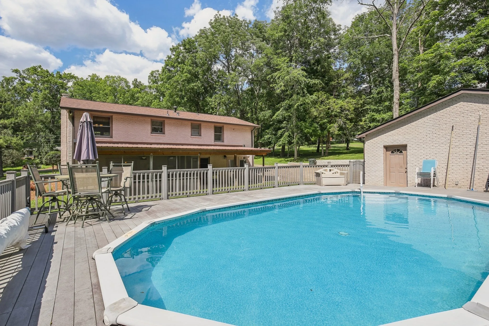 Bring the boat, jet skis, or the RV to fill the THREE CAR DETACHED GARAGE!! Mins to the lake! Either Shutes Branch or Cedar Creek! Enjoy the freedom of TWO acres & NO HOA! Relax by the POOL, on the screened in porch, or by the firepit! This all brick, four bedroom home boasts gorgeous real hardwood floors, has been freshly painted & has brand new carpet! Enjoy cooking in the eat-in kitchen with double ovens, electric cook top stove, and large island with tons of storage! Take in the view of the pool and the wooded portion of your two acres while standing at the kitchen sink! Spend time with family in the living room upstairs or the bonus room downstairs! Lots of windows for natural light in the basement! Cozy up by the wood burning fireplace in the winter! Double closets in the primary bedroom & tile walk-in shower in the full bath downstairs. Huge laundry room & mud room! 16×24 two level workshop remains! Zoned Lakeview, MJ Middle & Green Hill!
