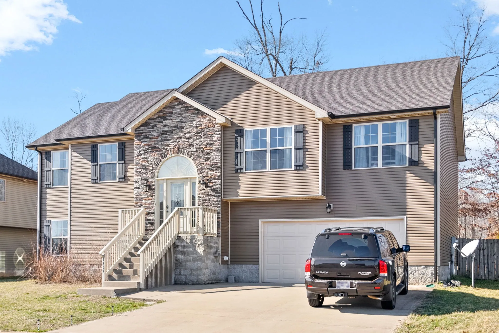 Spacious split-level home conveniently located close to Ft. Campbell! This home features decorative stacked stone, sits on a large lot and is situated in front of the neighborhood playground and basketball court in a park-like setting. No backyard neighbors! The fenced-in back yard adds extra privacy. Stepping into the home you’ll find a true foyer and hardwood flooring. Vaulted ceiling, hardwood floors and a stone fireplace make the living room feel grand but cozy. The eat-in, country kitchen features stainless steel appliances, double sink and pantry. Home also has a formal dining space that could be used as a flex space or home office. Spacious primary bedroom with vaulted ceiling. Primary bathroom boasts separate bathtub and tile shower, double vanity and separate toilet room. 2 additional large bedrooms and a full bath upstairs. Head downstairs for a huge living/rec area, 2 bedrooms and a full bathroom. Relax on the covered back deck.