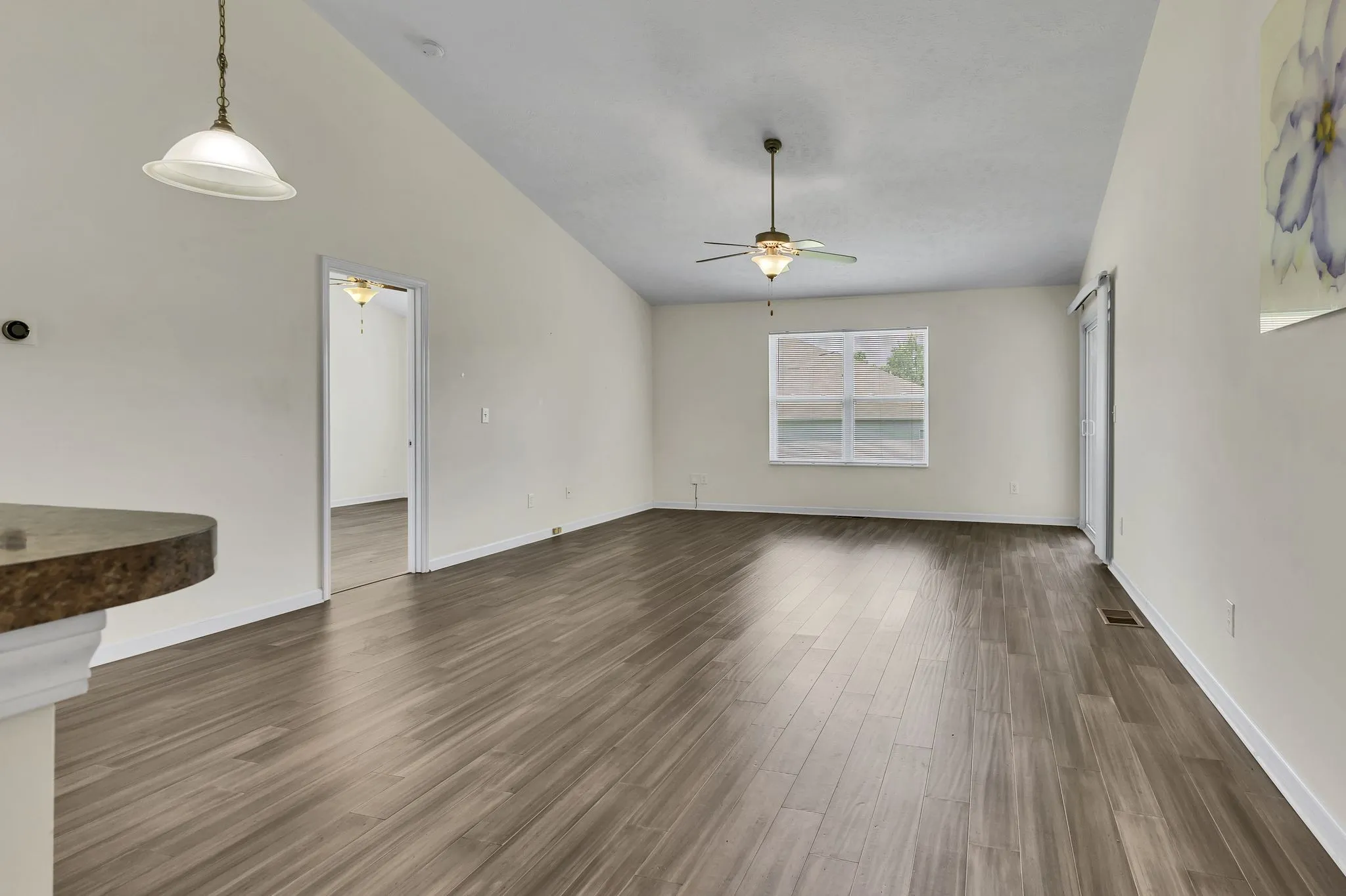 One level, attractive bungalow style home with a large covered front porch and rear deck on a quiet, neighborly cul-de-sac. Features an open floor plan and vaulted ceilings with large primary bedroom suite. Ensuite bathroom has separate tub and shower and walk-in closets and double vanity. Separate utility room with washer and dryer. New hardwood laminate flooring throughout with tile like floor covering in the kitchen and the bathrooms. Modern kitchen with stainless steel appliances. Attached garage Three bedrooms, two bathrooms. Tenant pays all utilities and is responsible for lawn mowing.