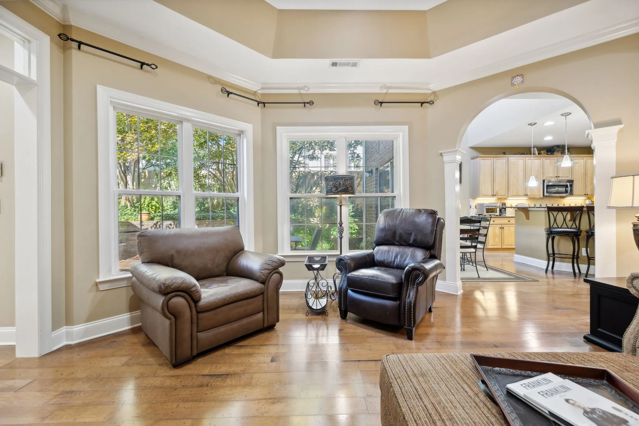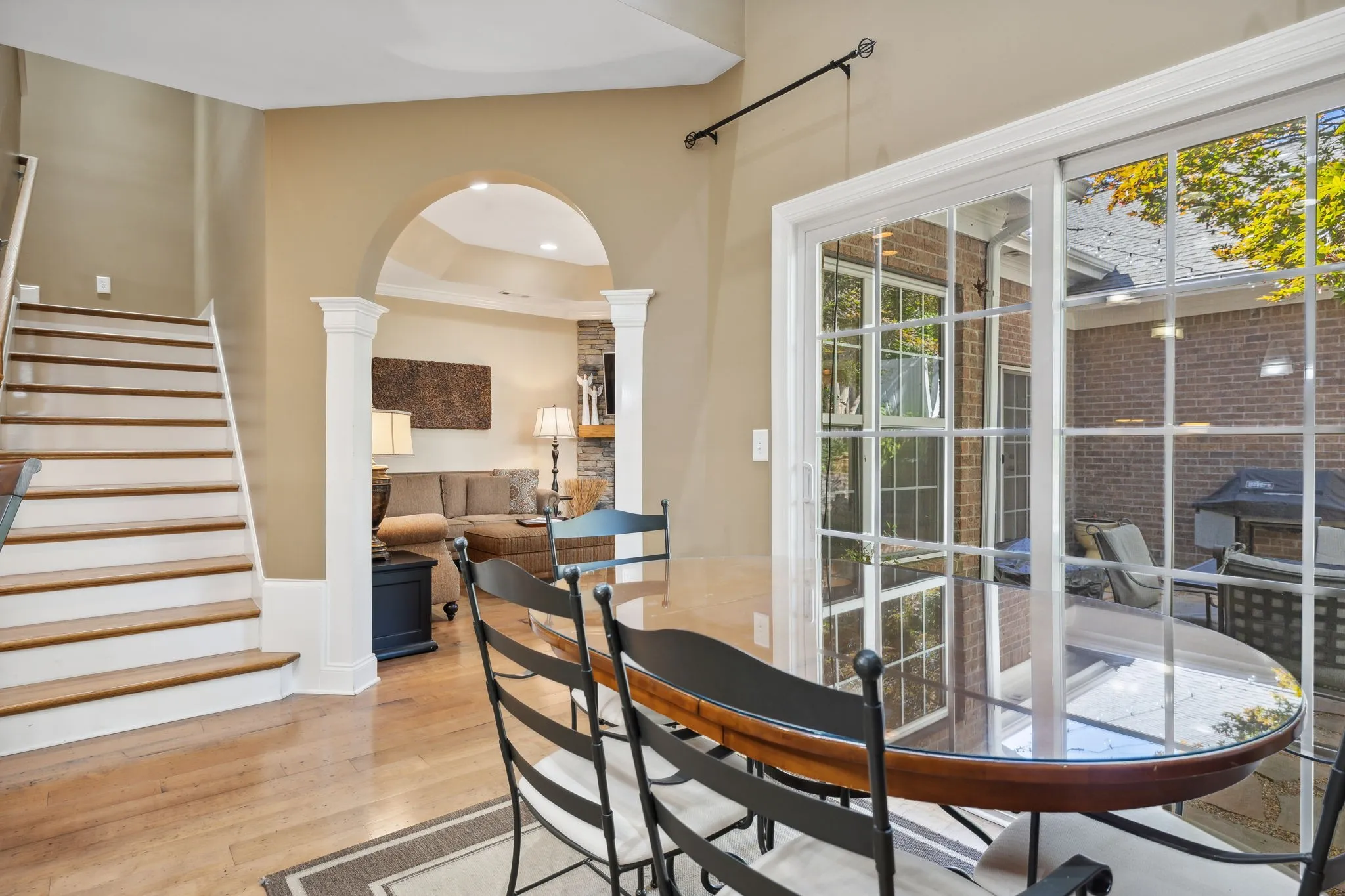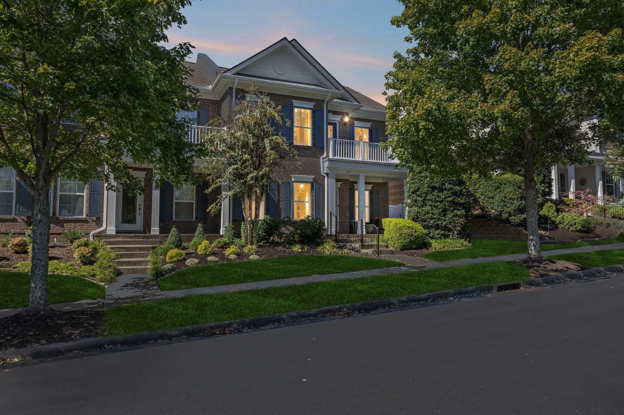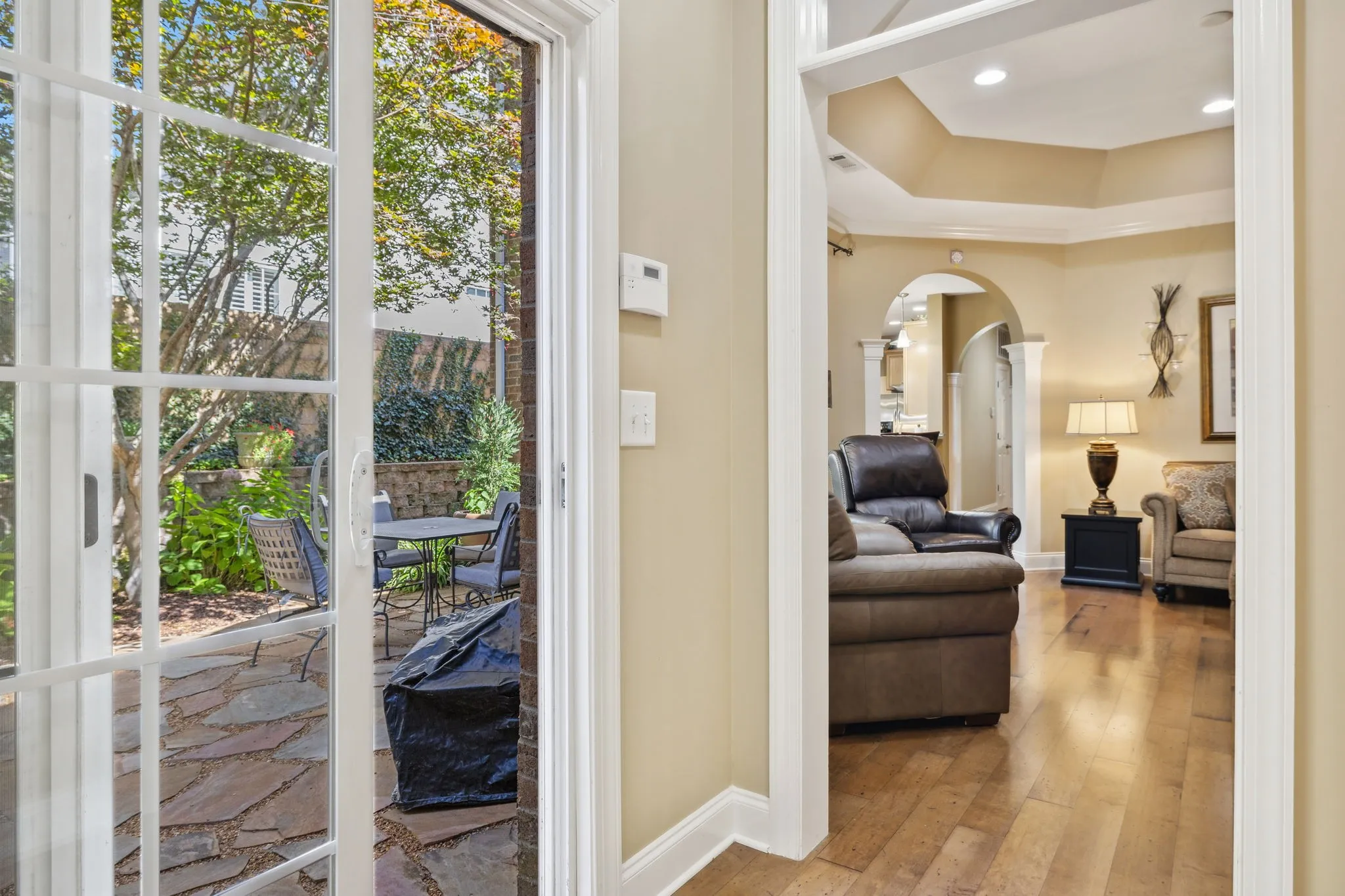 Location, Location! Enjoy the tranquility in this beautiful gated neighborhood – Close to shopping, restaurants and entertainment Minutes to Historic Downtown Franklin. Hardwood and tile flooring. Custom Closet in Primary Suite Beautiful Private Flagstone courtyard, Second floor balcony. Den TV, Courtyard Party Lights, garage freezer, work bench and shelving remain.