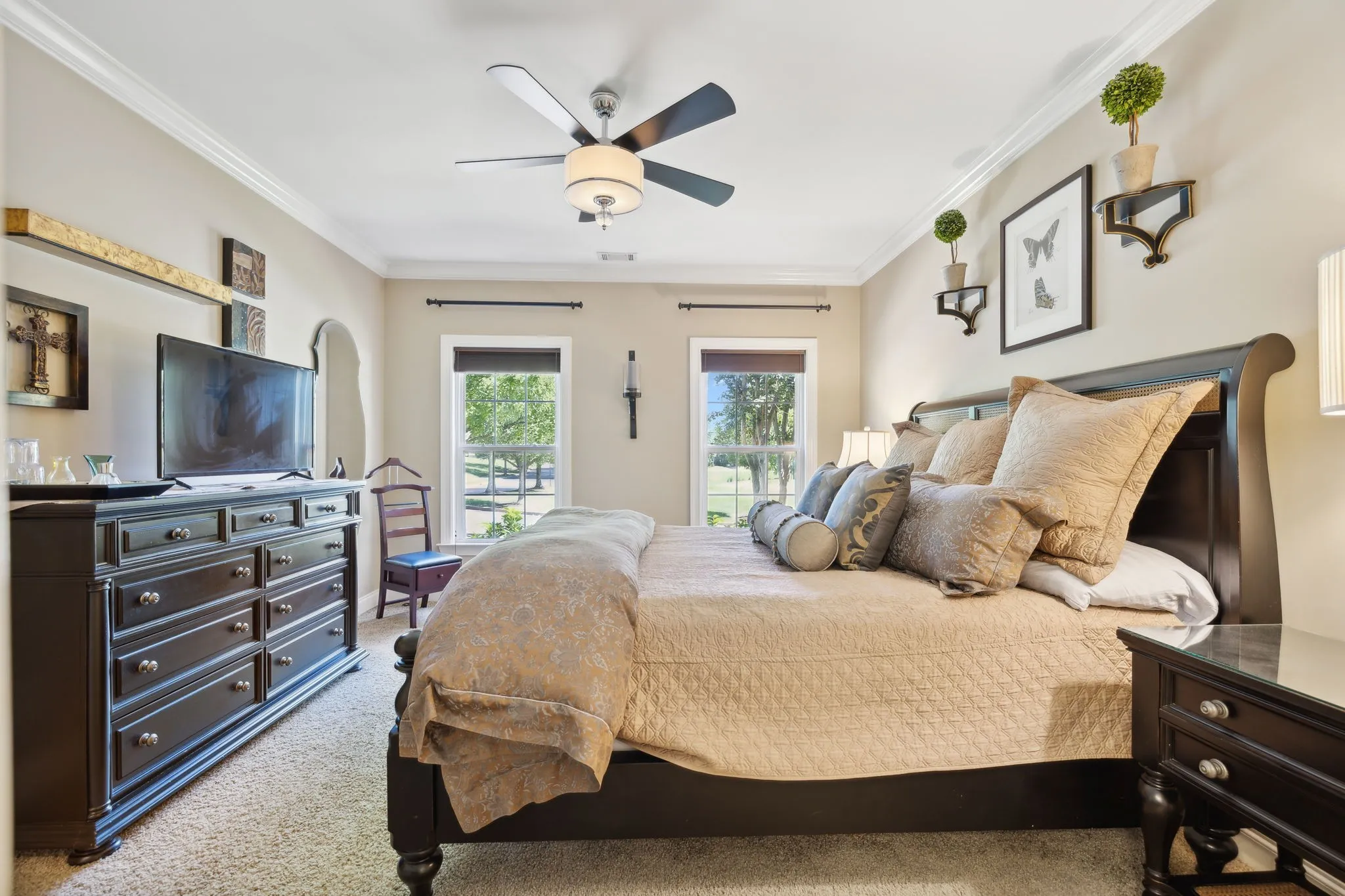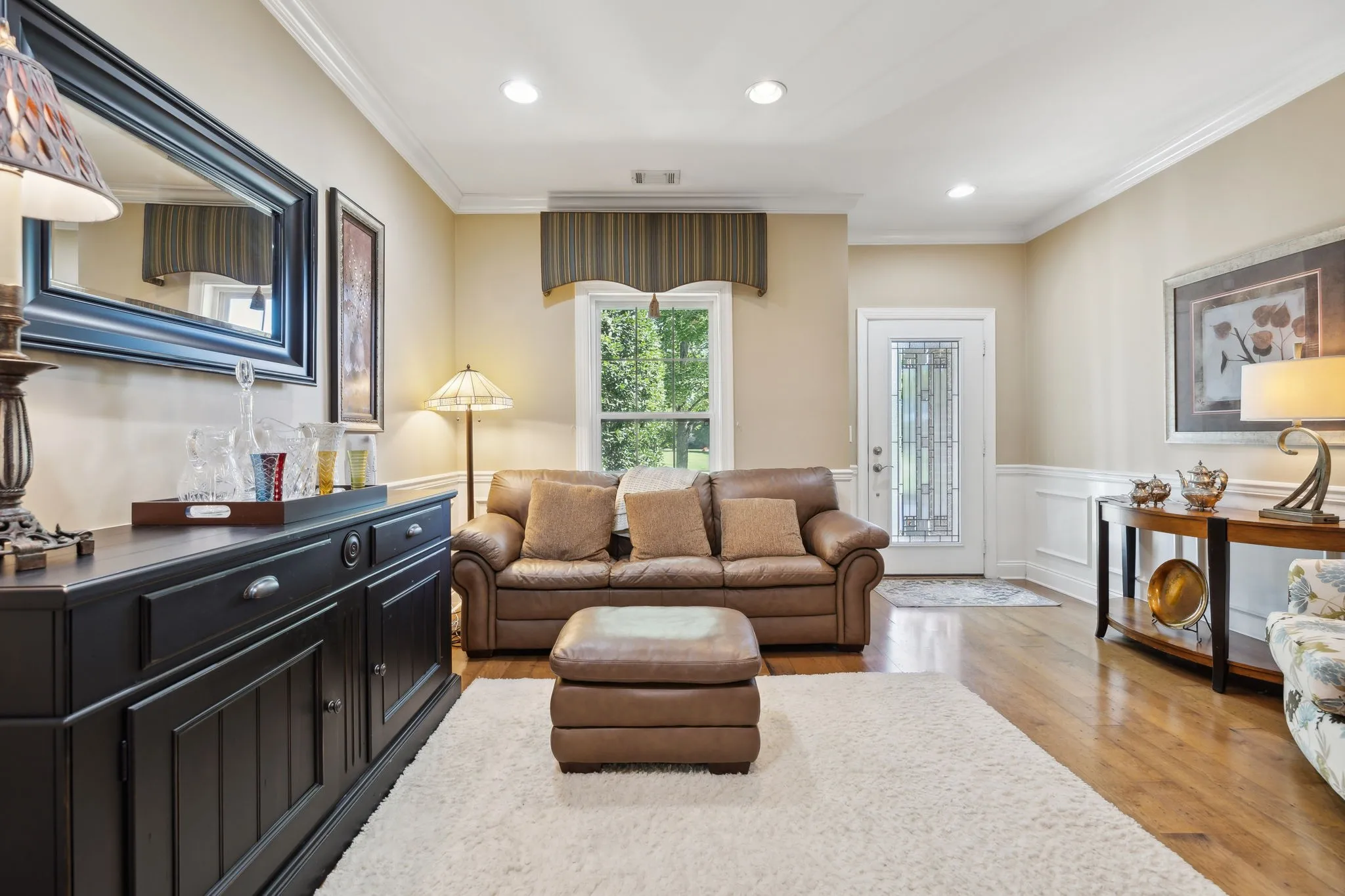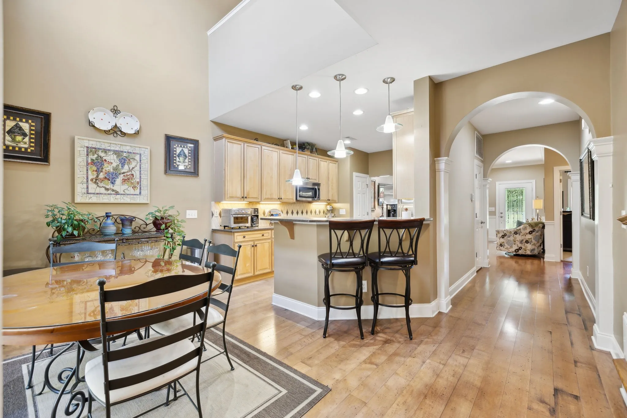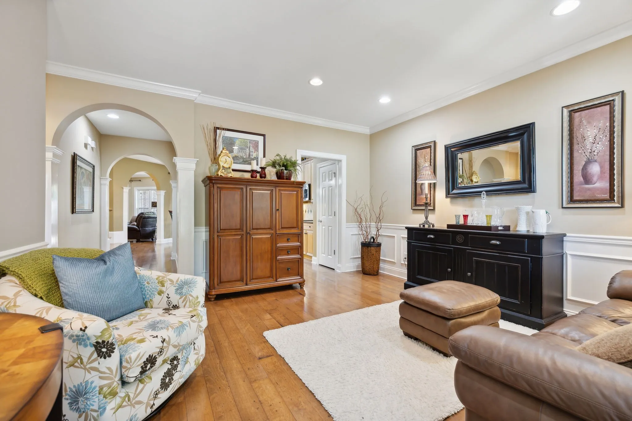 Location, Location! Enjoy the tranquility in this beautiful gated neighborhood – Close to shopping, restaurants and entertainment Minutes to Historic Downtown Franklin. Hardwood and tile flooring. Custom Closet in Primary Suite Beautiful Private Flagstone courtyard, Second floor balcony. Den TV, Courtyard Party Lights, garage freezer, work bench and shelving remain.