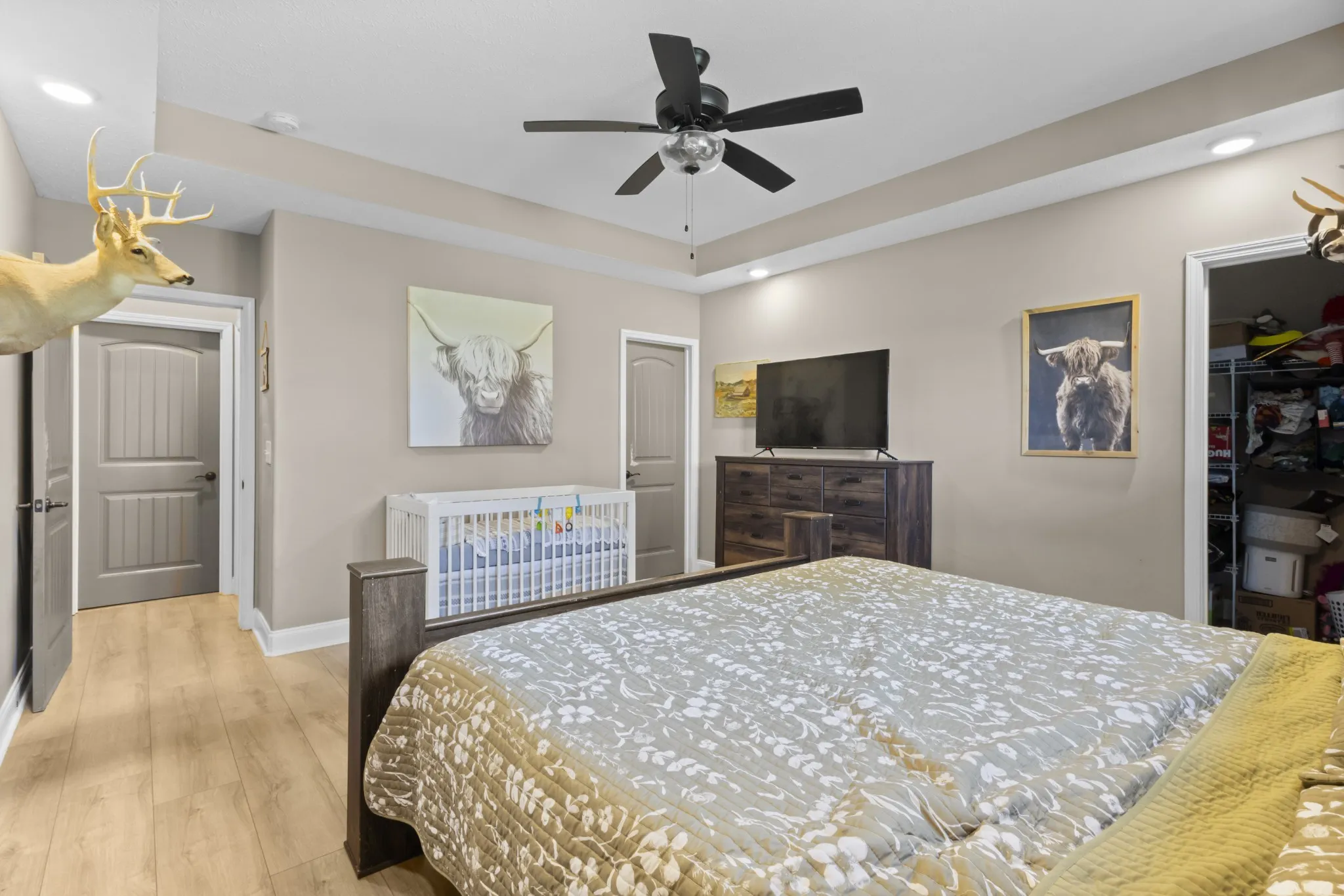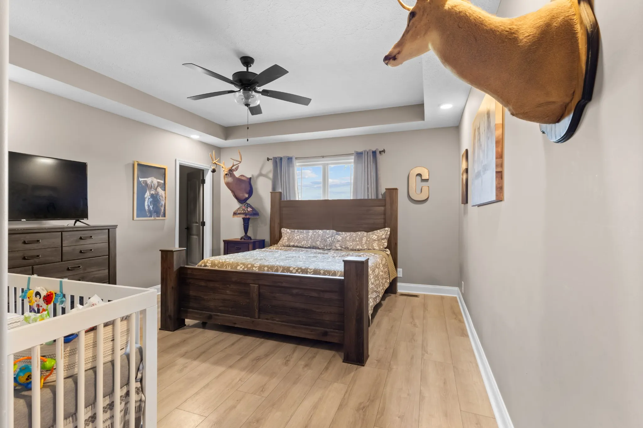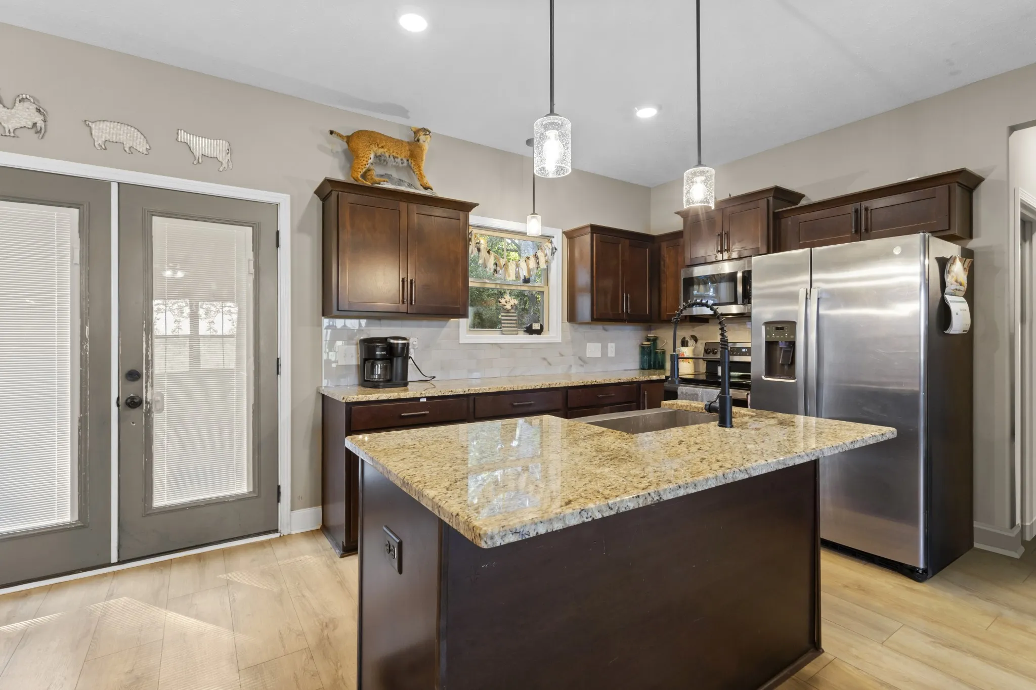 Owner/Agent! Front door opens to beautiful open floor plan with coffered ceilings. Open concept into the kitchen w/granite countertops, tile backsplash and stainless steel appliances to include refrigerator. Primary bedroom on main floor has beautiful tray ceilings and a full double vanity with tile shower/tub combo and a spacious walk in closet. The remaining 4 bedrooms are spacious rooms with their own walk in closets. This house was built for space and storage. Over half acre fenced in back yard! Perfect for your new mini farm. Enjoy many summer nights off that covered back patio! NO HOA! No City Taxes!