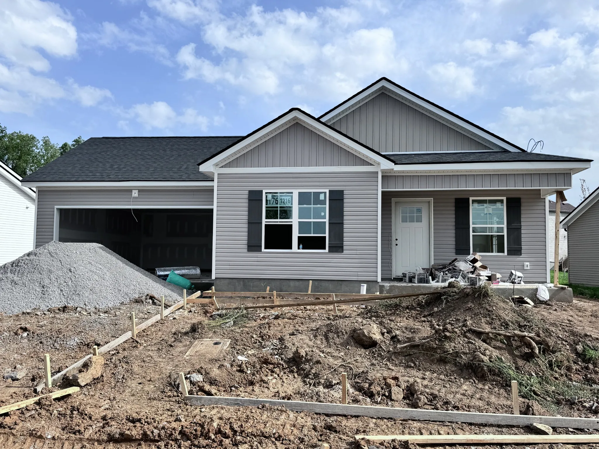 GREAT Starter home! All one level, 3 beds, 2 baths, concrete drive, 2 car garage, granite counters in kitchen. Includes stainless stove, dishwasher & microwave. Granite Counters in Bathrooms. Concrete patio in rear. Concrete drive. Laminate in great room & Kitchen, carpet in all other rooms. Ceramic tile in baths. Interior photos shown are of previously built home.