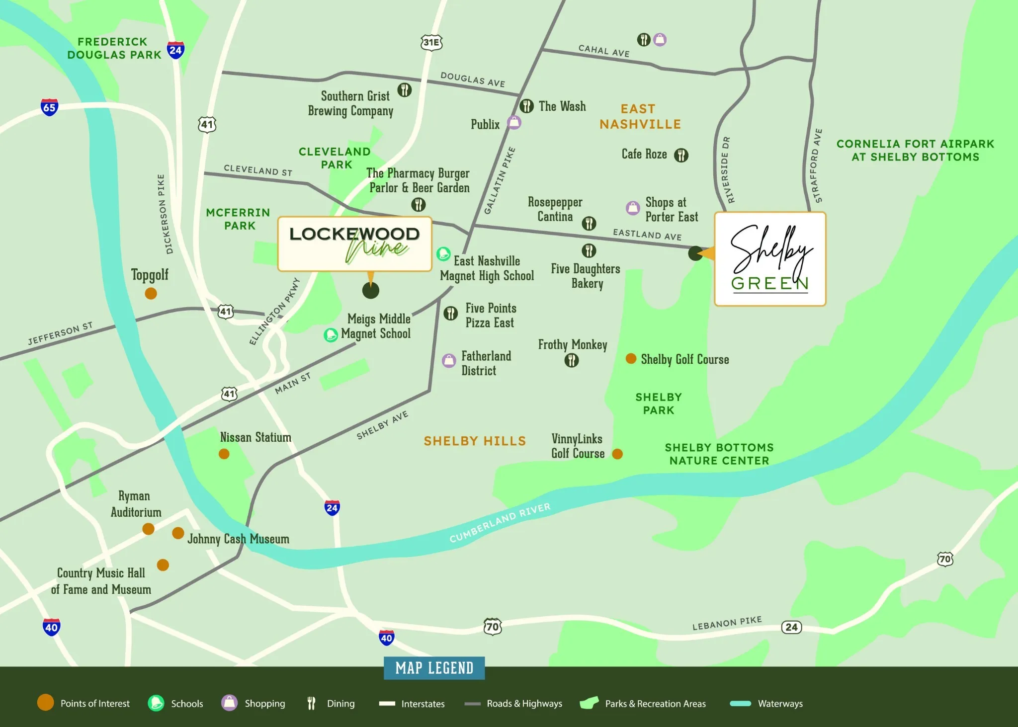 +"Directions": "From I-24-Take the Shelby Ave Exit. Turn Left onto S Tenth St. Turn Right onto Gallatin Road. Turn Right onto Eastland Ave. Follow past Rosepepper and Jeni's. Follow straight through the fork to stay on Eastland Ave. Community on Right."