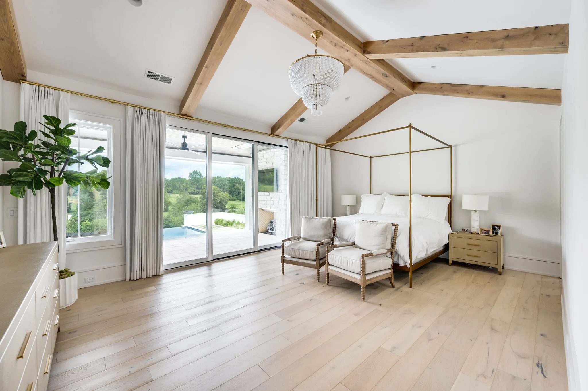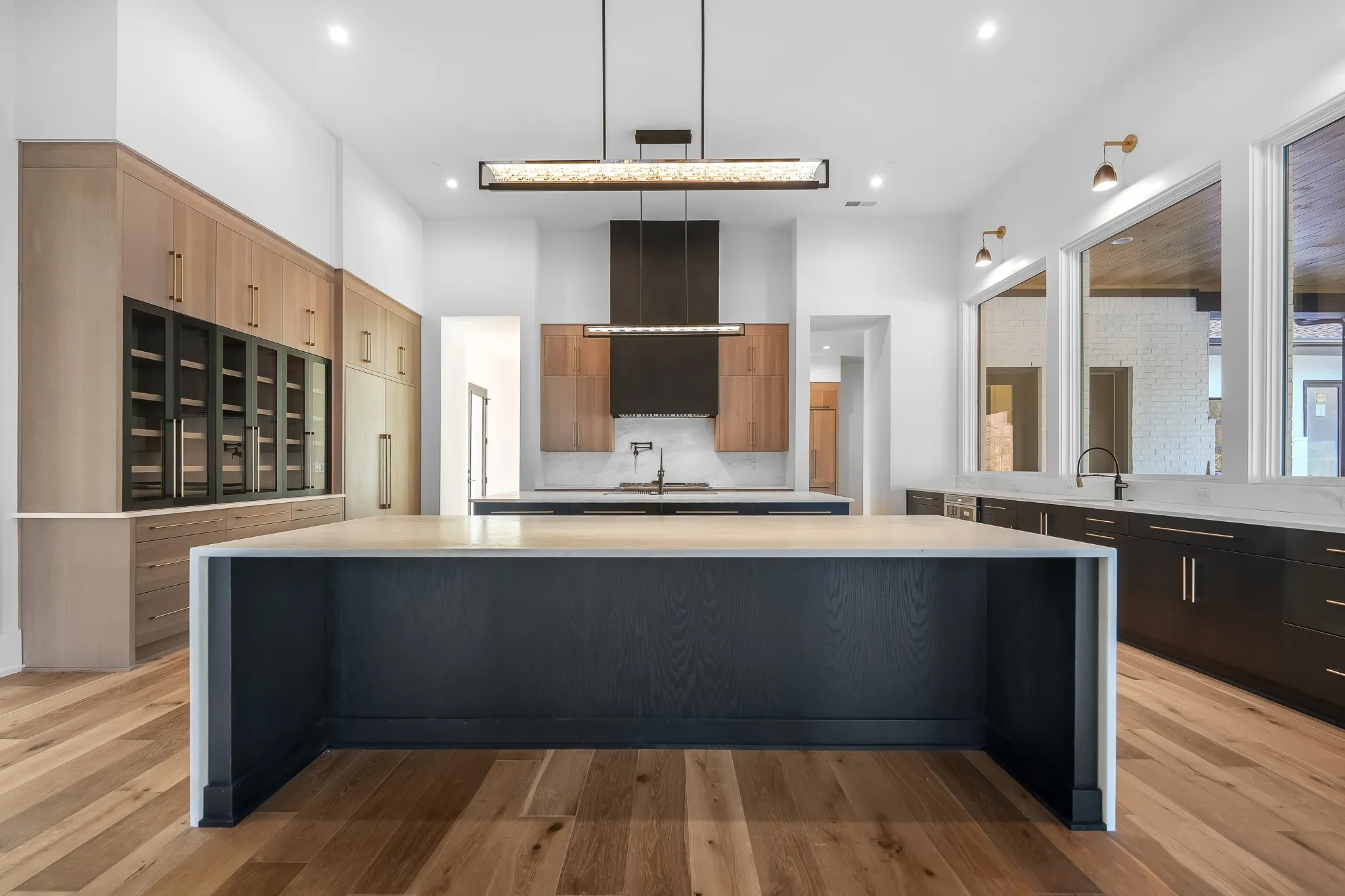 Luxurious new construction located in a sought-after Brentwood location. This home offers spacious first-floor living, featuring three bedrooms on the main level. The property showcases a chef-inspired kitchen with a spacious scullery. Perfect for hosting guests, a central wet bar adds to the entertaining space with a temperature-controlled wine wall can hold more than 300 bottles. One of the highlights is the family room, with dual large slider doors on each side leading to covered porches, offering a one of a kind indoor-outdoor ambiance. Relax on the expansive porches that offer stunning views of your private pool & spa. Move in before the Holidays
