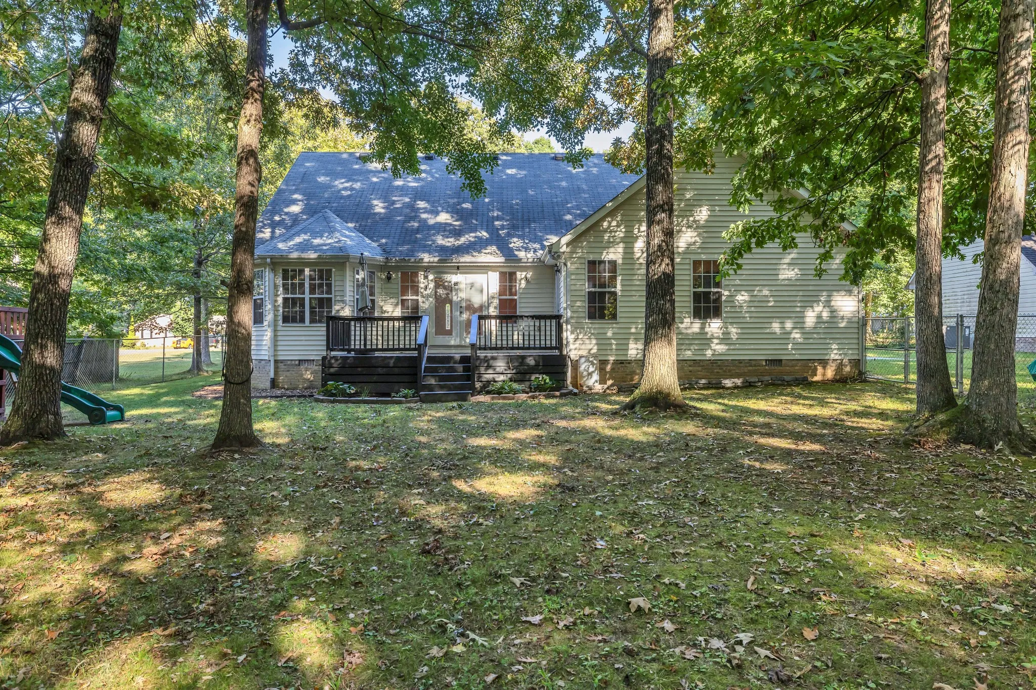 Located in highly favored Prince Properties, this home sits on a .56 acre lot and includes a sizeable front porch, back deck, and a fenced-in backyard with a wooden playhouse! Once inside, you will find a well-lit open floor plan featuring new LVP flooring in foyer, dining, living room, and all three bedrooms. The living room offers very high sloped ceilings, newly installed custom built-ins, lots of natural light, and French doors to deck. The kitchen has new granite countertops, tile floors, and stainless steel appliances that will remain with the home. The primary suite boasts trey ceilings, a walk-in closet with built-ins, access to the back deck, double vanities, and a jetted soaking tub with separate double shower. All bedrooms have ceiling fans, LVP flooring, and are on the main level. Bonus room upstairs includes newly installed custom built-ins, new carpet, a full bath, and its own AC unit. Both AC units recently serviced and inspected. Roof recently inspected, good condition.