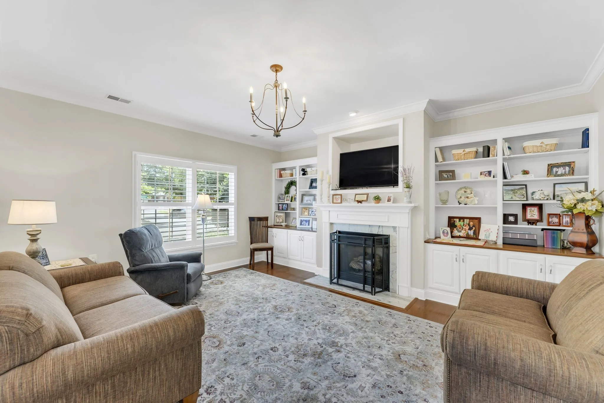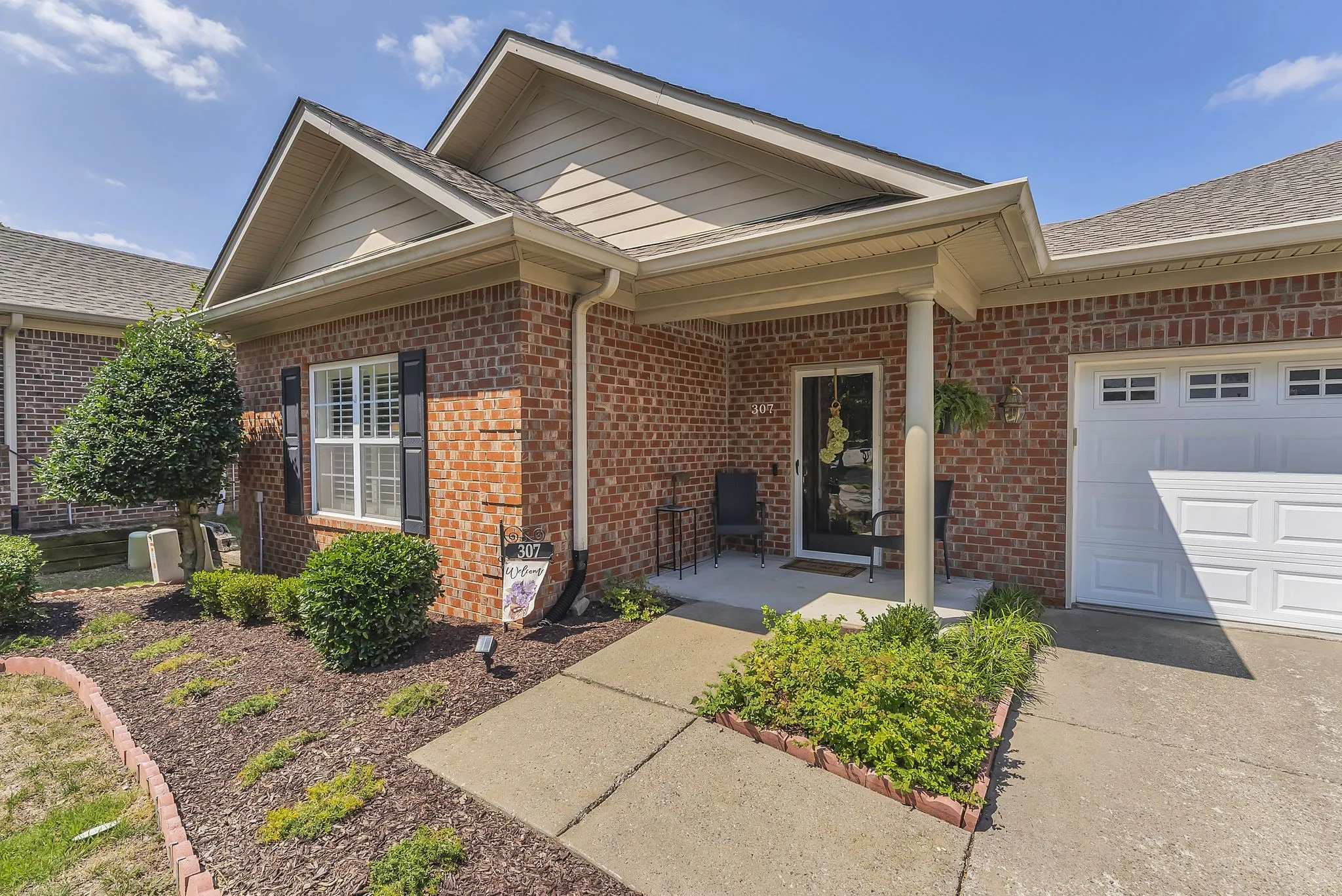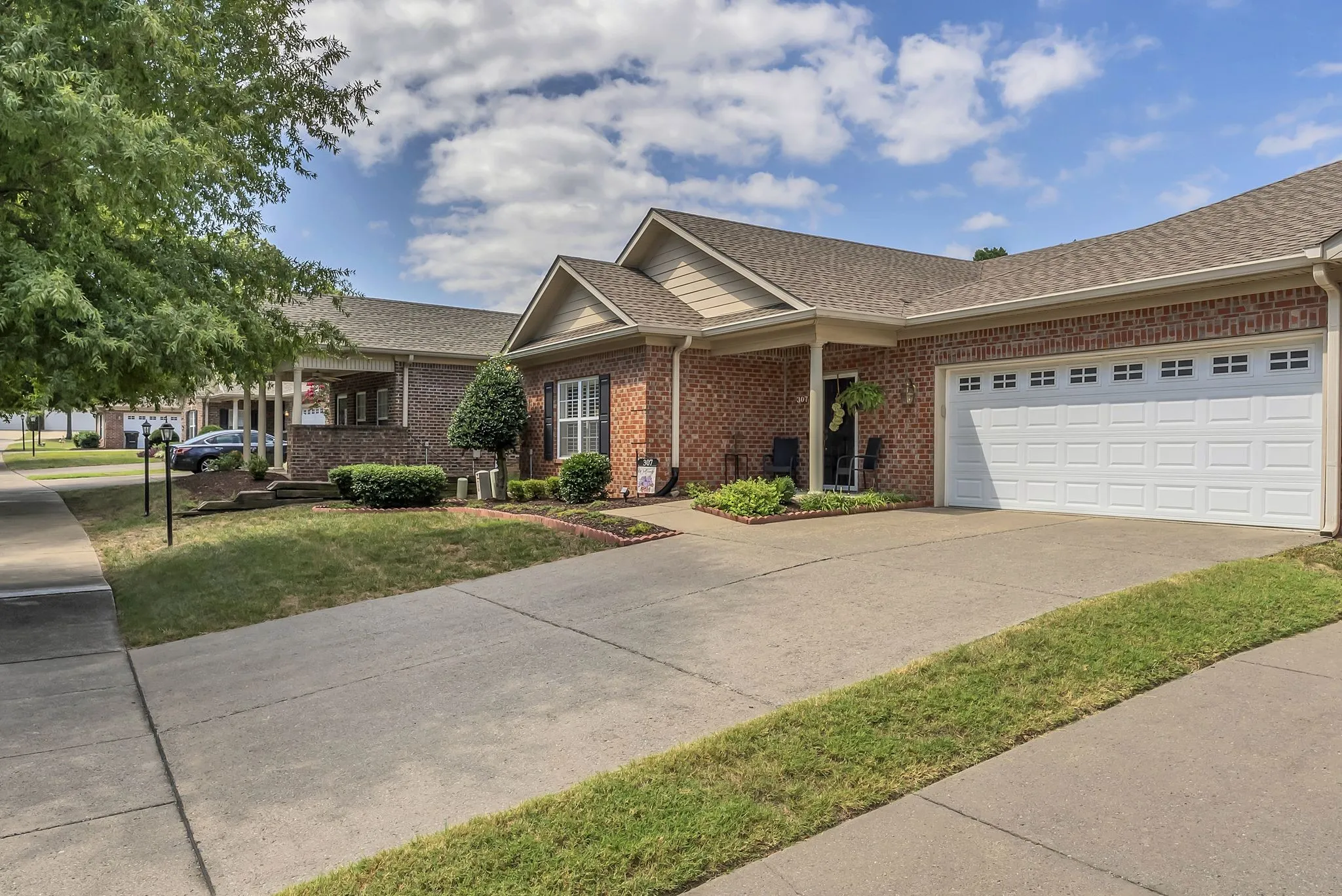 55+ turn-key residence just minutes from downtown Franklin! Well maintained and updated 2 bedroom one level unit on a flat lot. Hardwoods in living, dining room, and hallway. Tile flooring in both bathrooms. Useful built-ins along living room wall. Plenty of usable green space in the back with private patio and side fencing. HOA includes all yard and landscaping maintenance. UPDATES: New dishwasher, microwave, gas range, new roof (2023), granite counters, gas heat (2024) and new cover on back porch. Owner would like to keep the light fixtures in the entry foyer, dining room and breakfast room light fixtures.