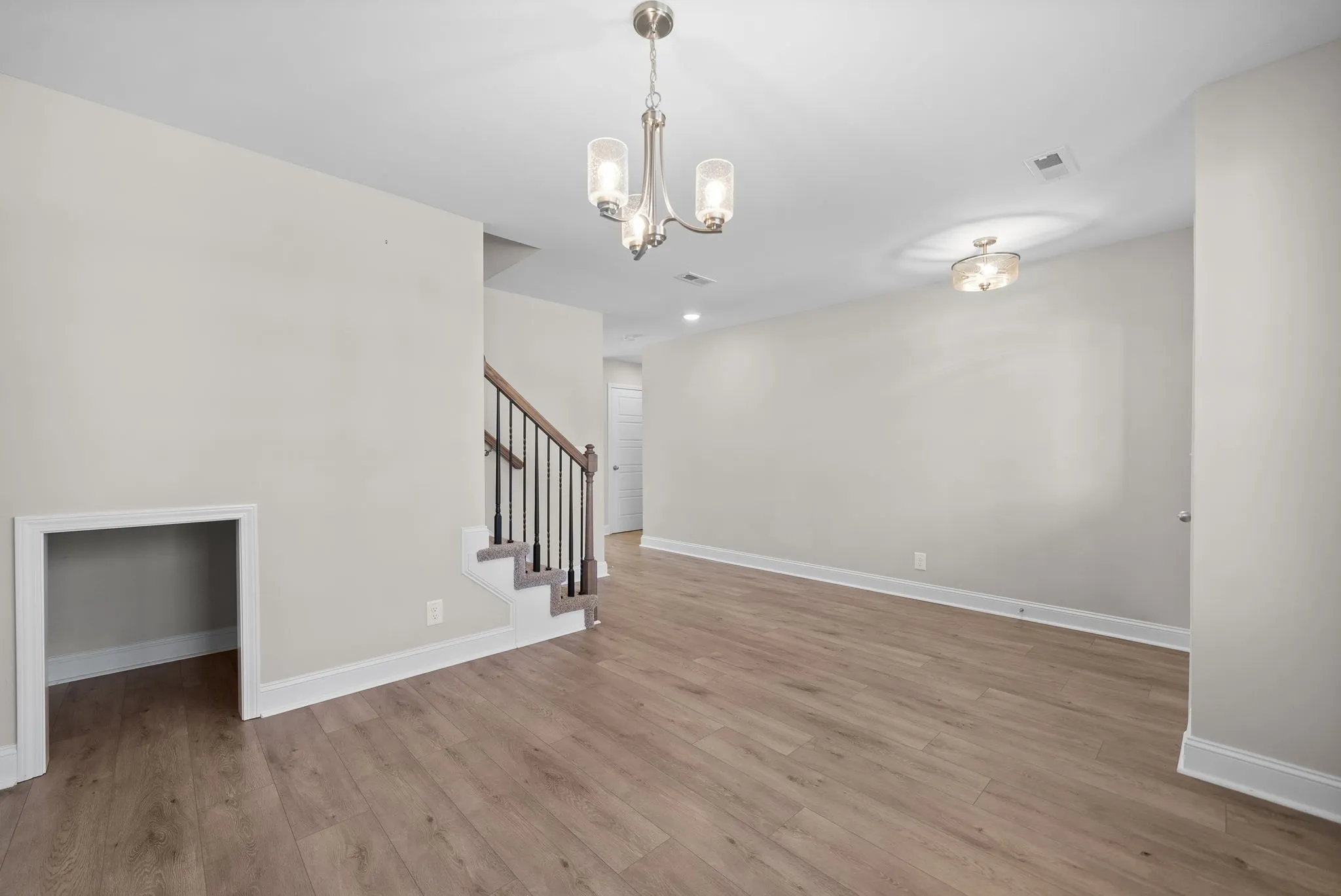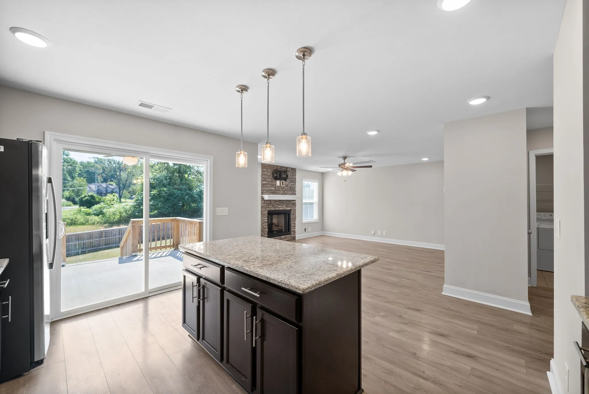 Stunning home built in 2022! Home is practically brand new! Front offers a huge covered front porch that wraps around to the side. When entering, a formal dining room will be to your left with an adorable cut out for a small storage area or even somewhere to put an animal bed. Updated half bathroom downstairs that offers convenience not only for guests but for renter(s). Laundry room is on main floor with extra closets, formal living room with a stone wrapped fireplace, fireplace has a mantle and tv mount will stay, living room opens up to the kitchen with a spacious island, plenty of countertop space and cabinet space in this kitchen! Granite countertops with updated SS appliances, beautiful tile backsplash, water and ice dispenser on refrigerator door, 3 bedrooms upstairs with 2 full bathrooms to include a beautiful primary bedroom with lots of natural sunlight, spacious primary closet and bathroom. Huge tiled shower with modern flooring and double vanities! Huge fenced in backyard!
