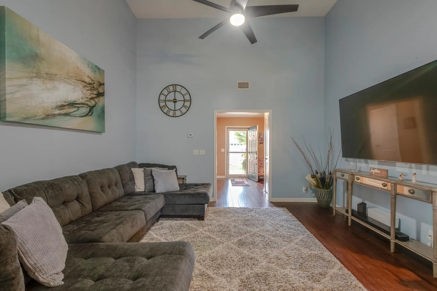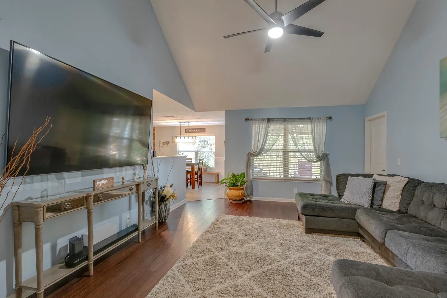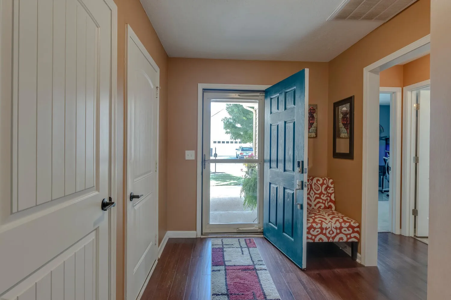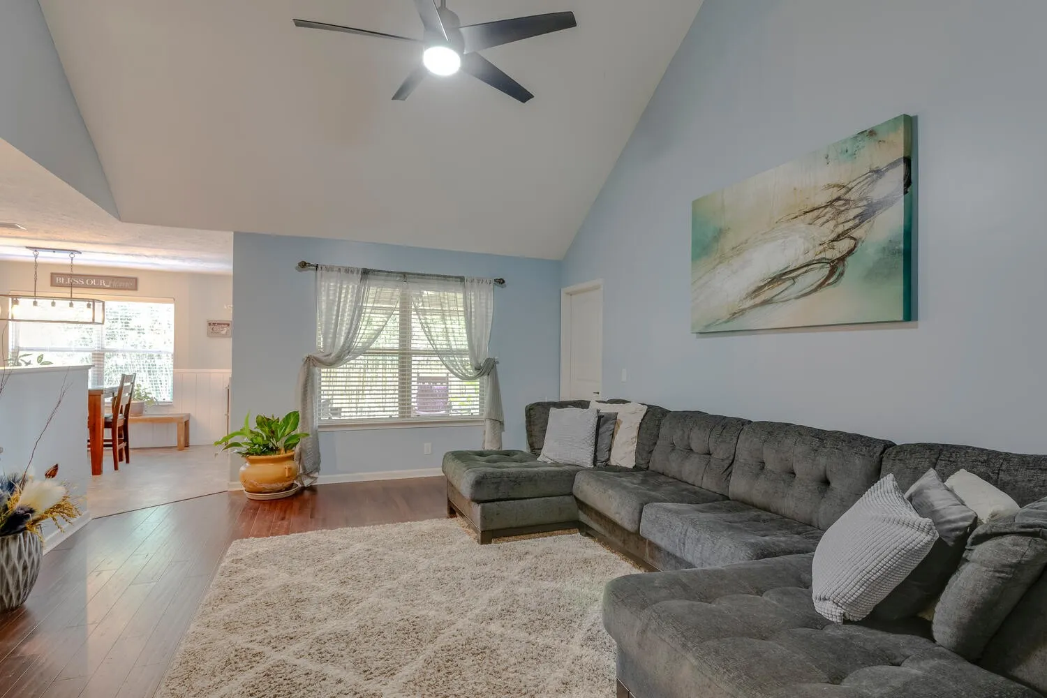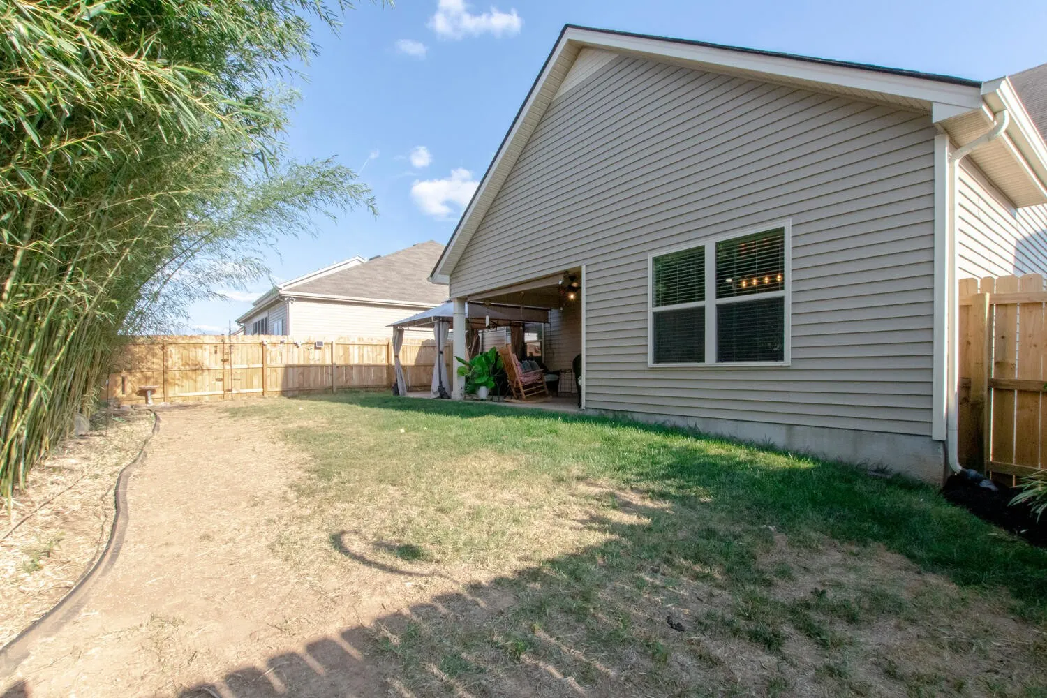 This home will not disappoint! Super cute all one level home in fabulous location! Open floorplan with vaulted ceiling in living room. Upgrades include: wood accent wall/backsplash & shiplap in dining area, bamboo hdwd floors, laminate hdwd in 3rd bed, mirrors in bathrooms, all new levers and shelving in closets, water heater (2 yrs), new garbage disposal, recess lighting added, updated light fixtures & fans, covered patio area + extended patio (20×16) with shade blinds and canopy, electrical/low voltage wiring for bedroom tv mounts, brand new privacy fence, CAT 5 hardwired, new carpet and fresh paint. Nice private back yard, and beautifully landscaped with curbing around landscaping. Bamboo planted in back for even more privacy. Seller has storm door to back patio area and will install before close. Refrigerator stays. Big pantry and walk in closet in primary bedroom. Great floorplan! You don’t want to miss this one!