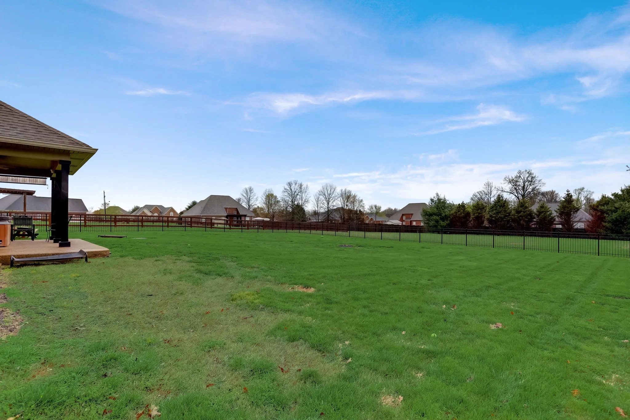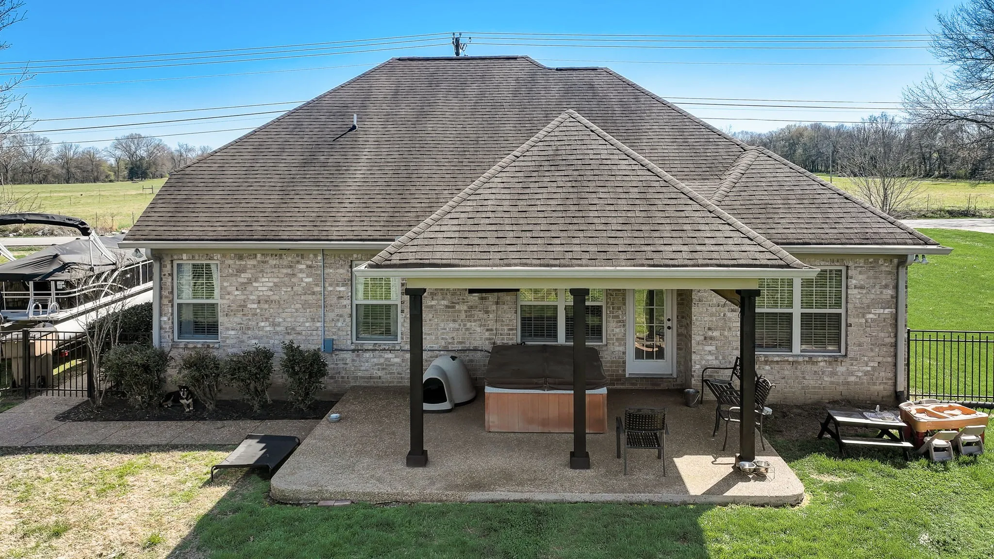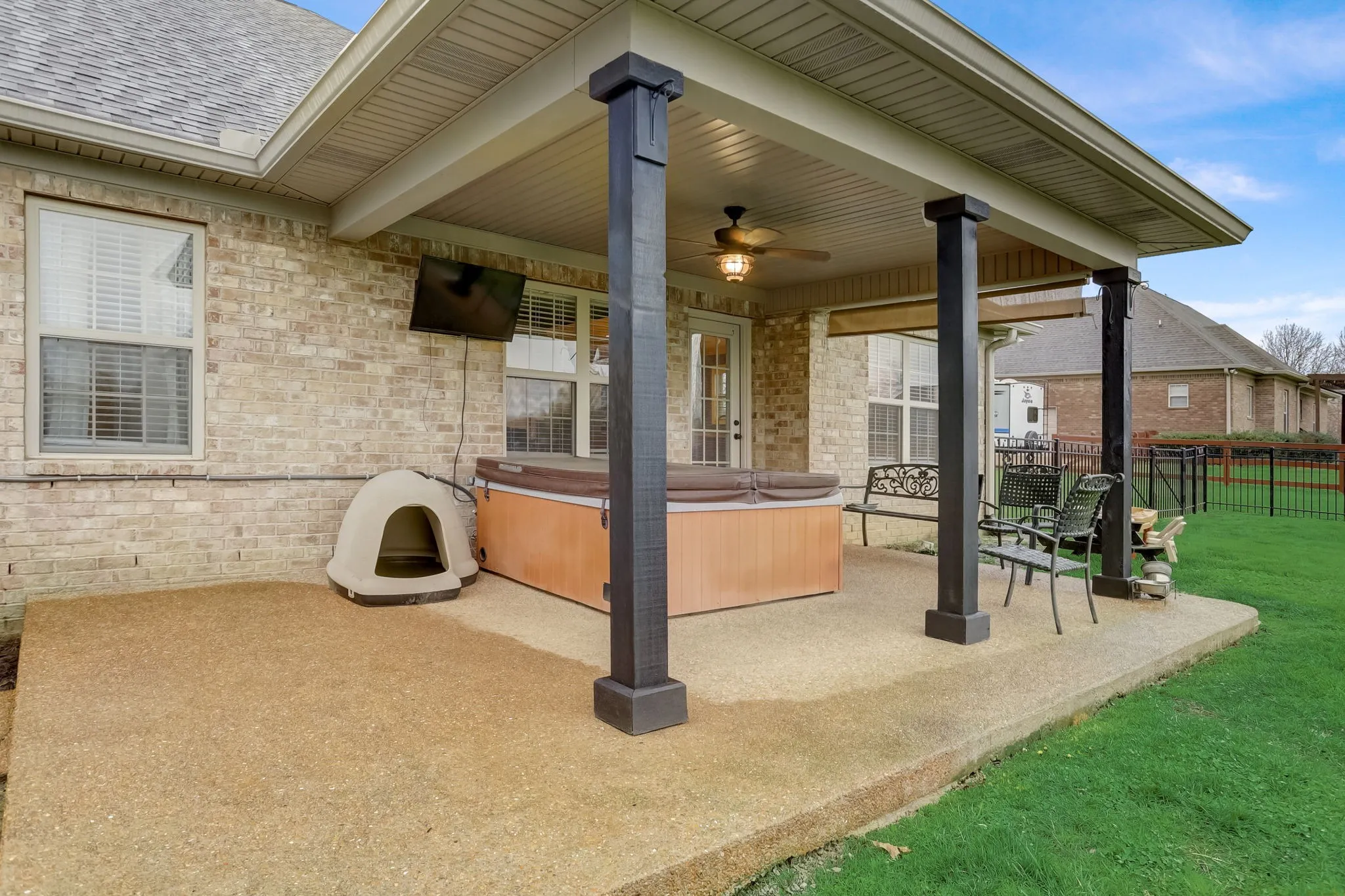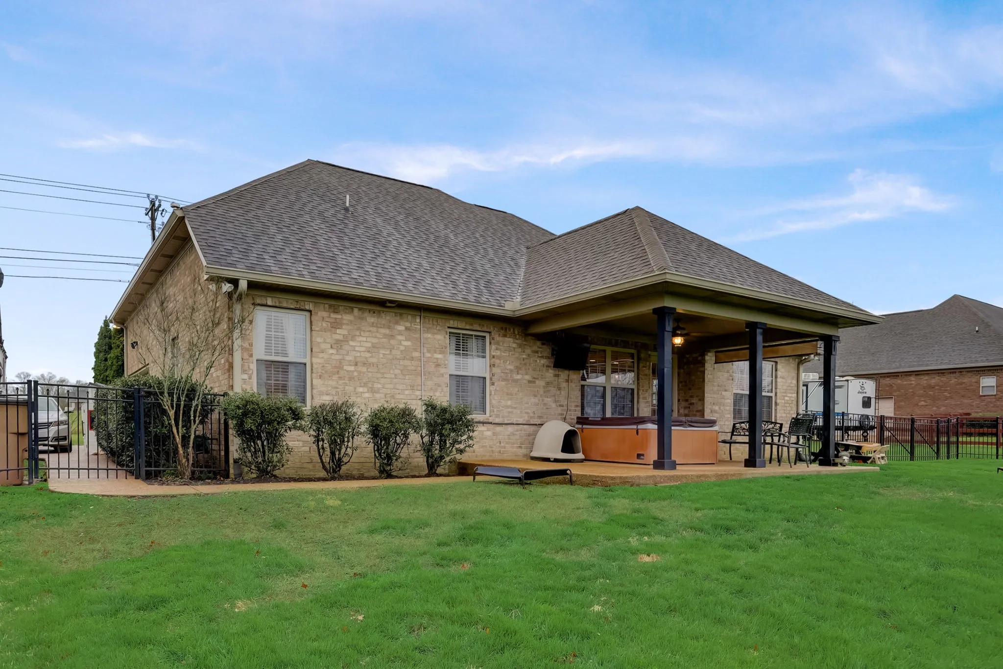 Immaculate three-bedroom, two-bathroom brick home ideally situated in a prime location. Meticulously crafted custom trim adorns the interior. The kitchen boasts custom cabinets, granite countertops, stainless steel appliances, tiled floors, and a convenient pantry. Retreat to the spacious primary suite featuring a charming tray ceiling and a luxurious primary bath with a separate tub and shower. Enjoy cozy evenings by the gas fireplace in the great room. A generous bonus room offers versatility, with an adjoining space perfect for an office. Step outside to relax on the expansive 22×14 covered patio overlooking the sizable, fenced backyard on a level lot. This property also includes a two-car attached garage, hot tub and is free from HOA restrictions. Don’t miss out on this exceptional home! Schedule your viewing today.