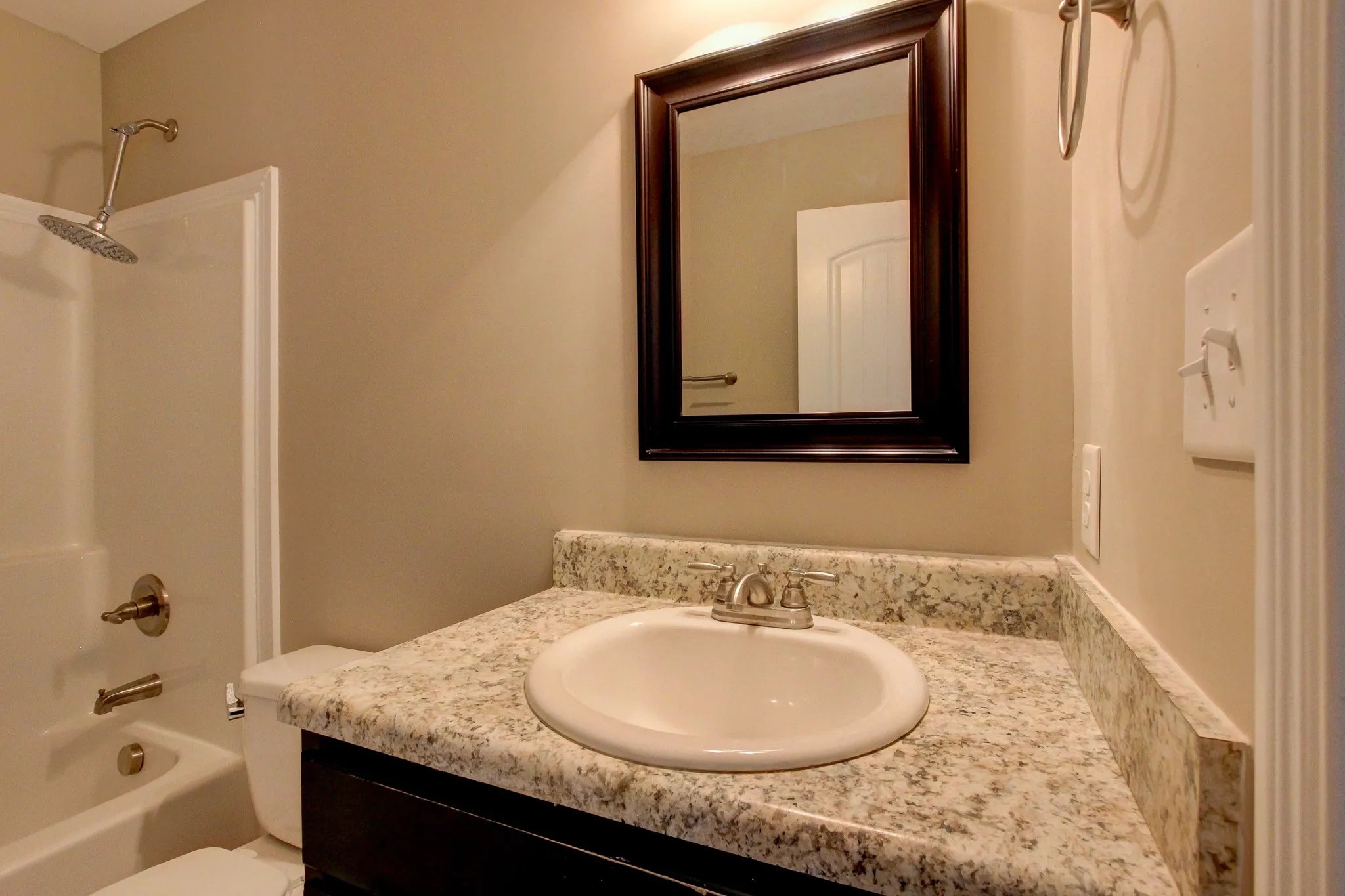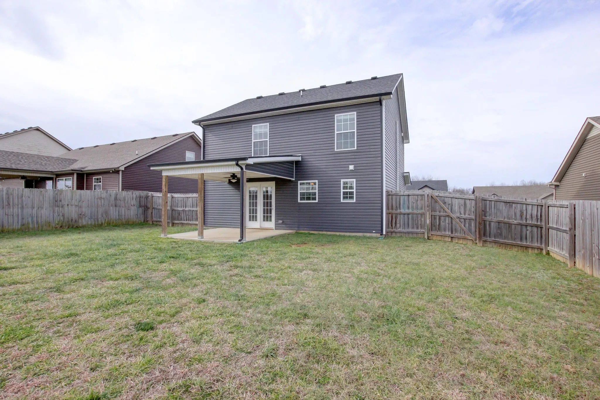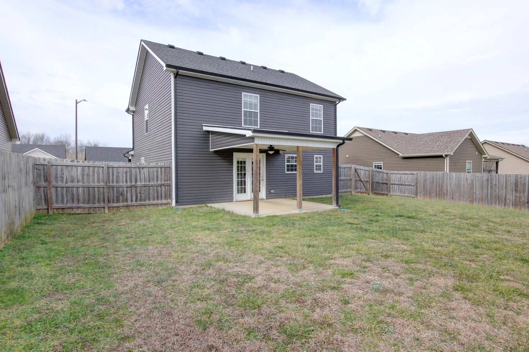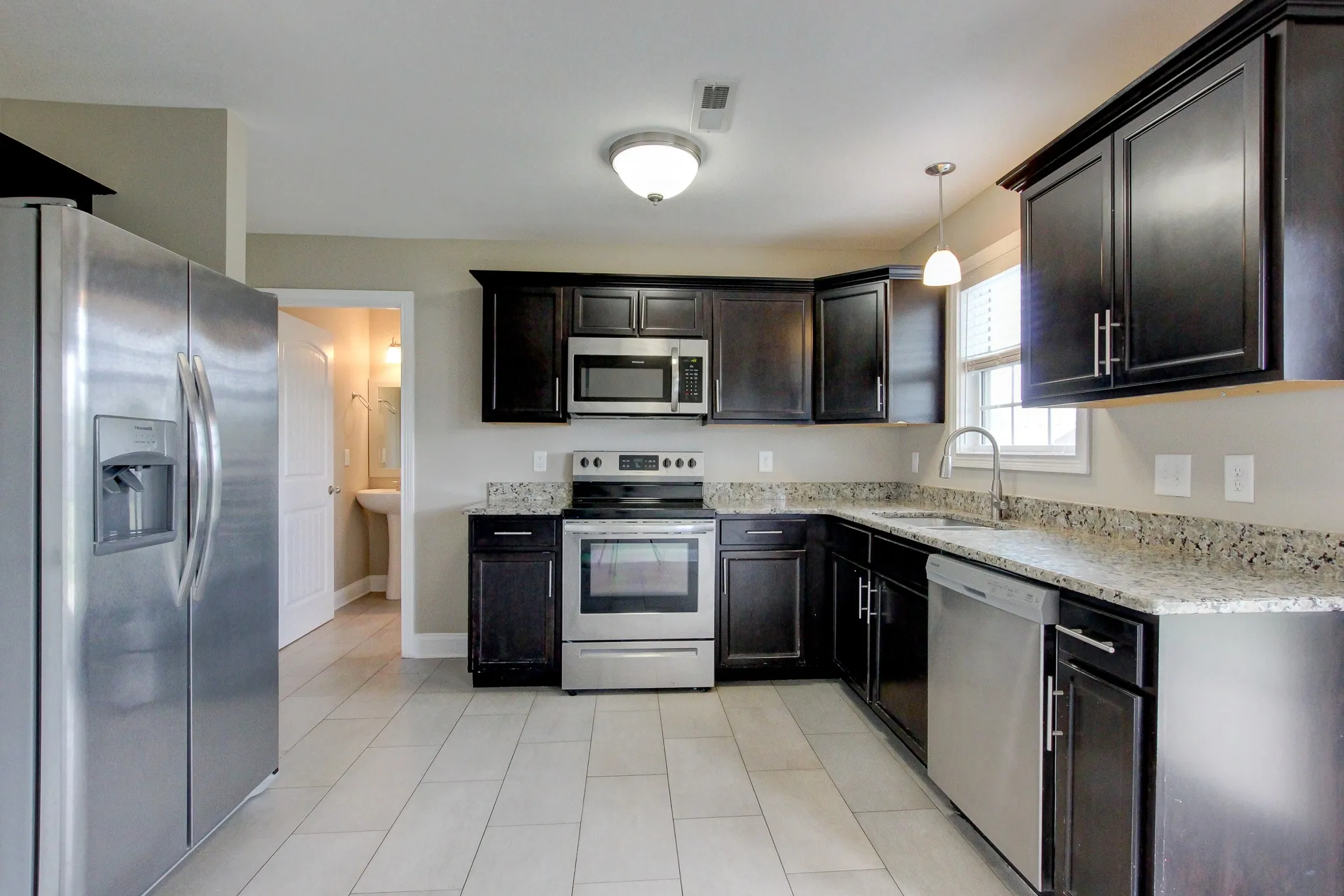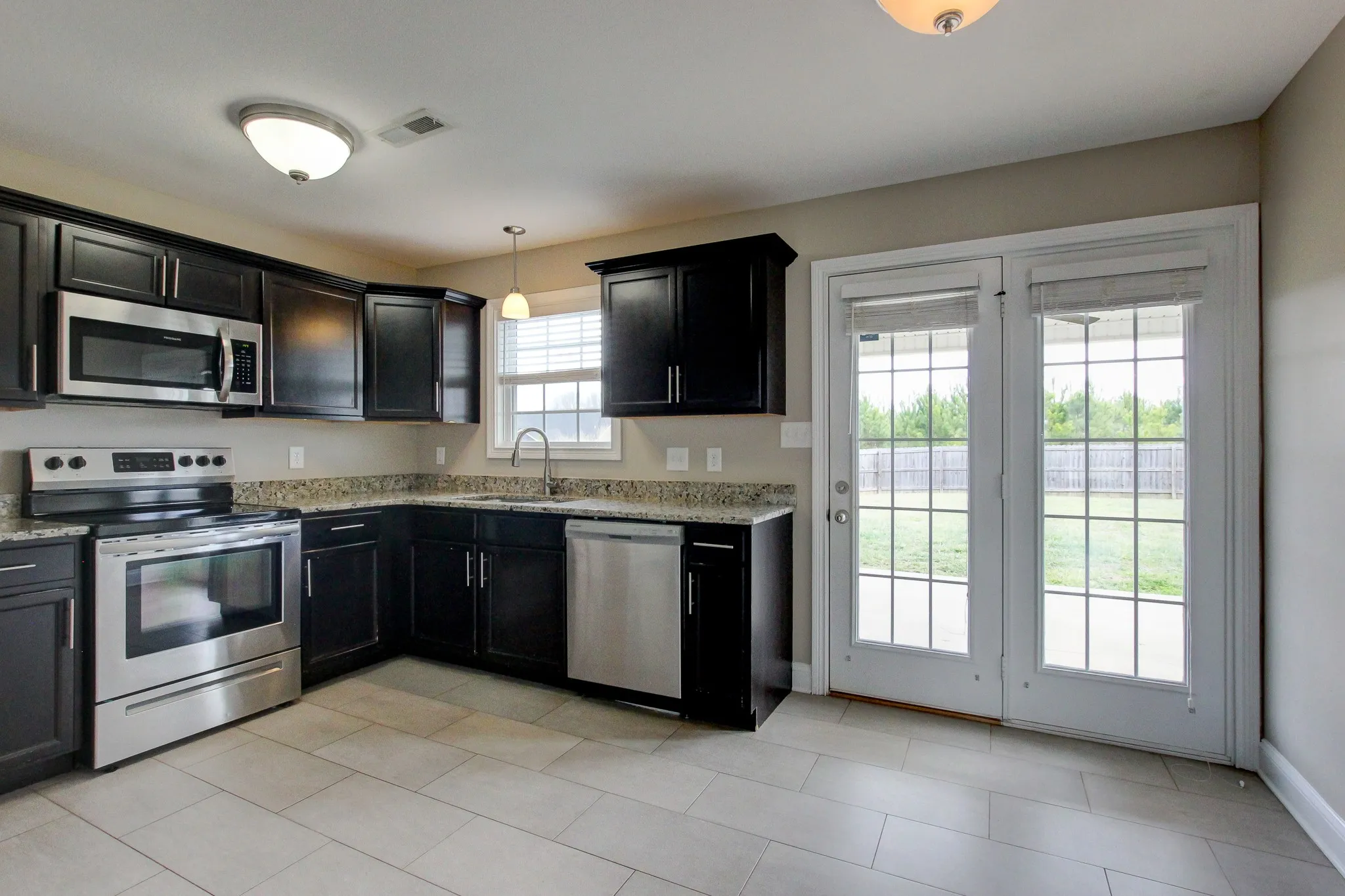 This is a show stopper with great flooring in the living room, tile in the kitchen, granite counters, a half bath downstairs with a great laundry room and utility sink. Upstairs, good size bedrooms and awesome shower heads. Out back, privacy fence and covered patio. Go. See. Apply.