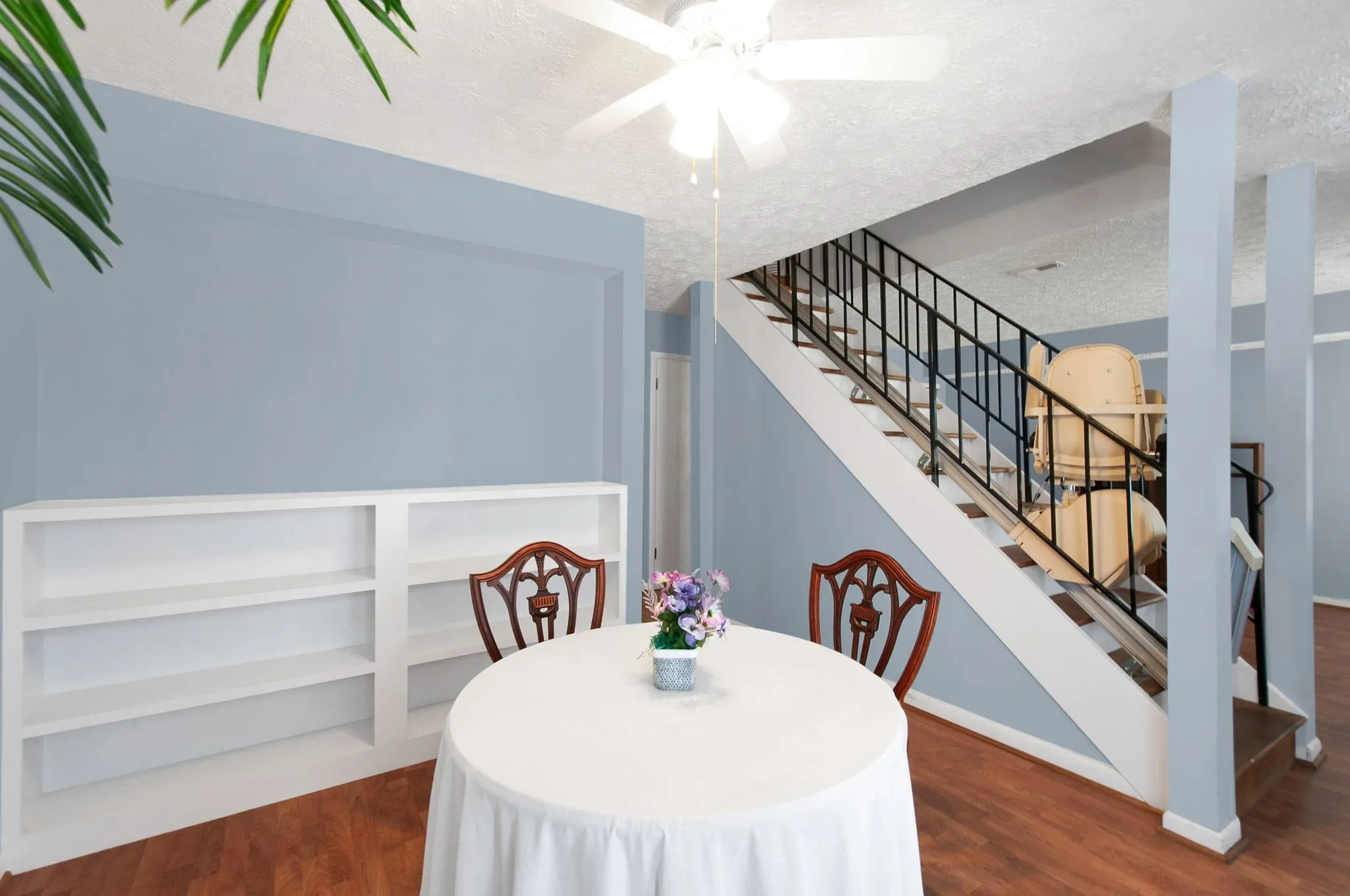 "LongDescription" => "Chair Lift is located on the stairs and can stay or go. Lots of light coming in from the private patio. Front door in the middle of the picture and coat closet to the left."