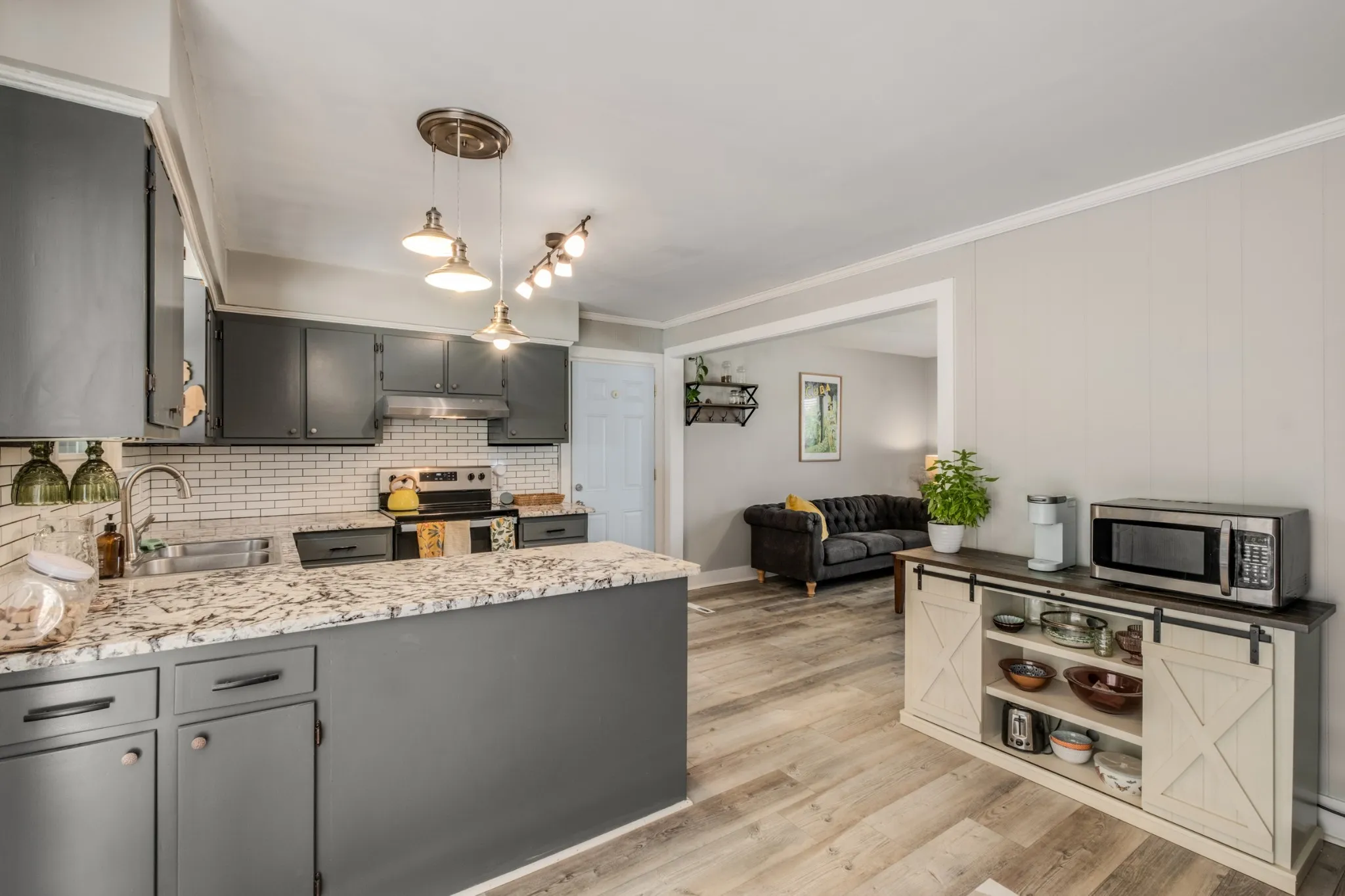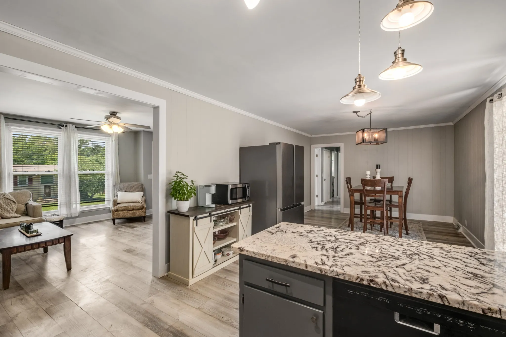 Beautiful mid-century brick home in a perfect location – just minutes from Percy Priest Lake! Updates: The roof and slider door were just replaced in August of 2024! HVAC was replaced in 2023! You’ll love the laminate flooring, which easily fits with any décor and color palette. Updated kitchen with granite counters, tile backsplash, and plenty of cabinet space for storage. Primary bedroom has a private half bath. Bedrooms two and three share a full bath, which has been updated with a double vanity. The large utility/flex room is perfect for laundry, a mudroom, home gym, storage, and more. Huge carport to protect your vehicles for all seasons. The spacious patio out of back is a great place to entertain while you overlook the big fenced back yard, lined with mature trees. There’s even a storage shed for all your tools and equipment. Only 25 min from downtown and 15 min from the airport!