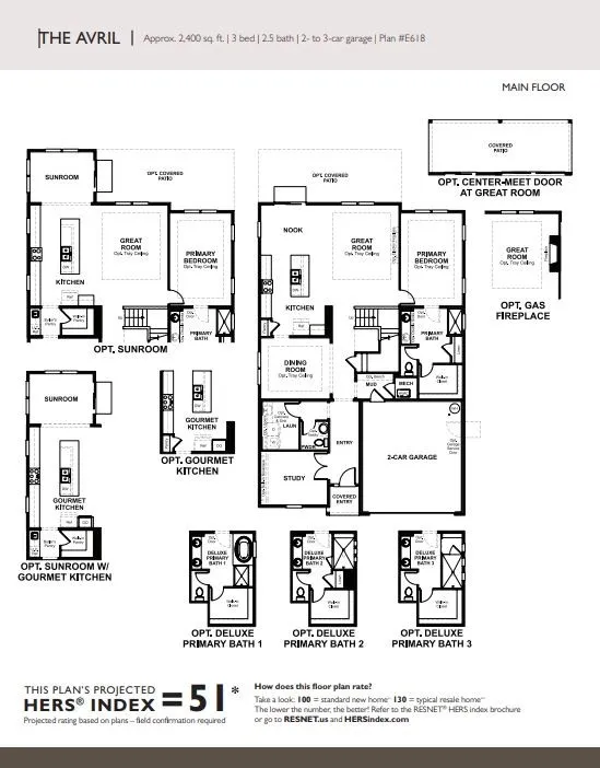 The Avril plan is ideal for entertaining, with a formal dining room, a spacious great room and a well-appointed kitchen with a center island, Sunroom, breakfast nook and Gourmet Kitchen. The main floor also boasts a private study and a convenient owner’s suite with a deluxe bath. Upstairs and Tray Ceiling, you’ll find a full bath and two large bedrooms with walk-in closets. Pictures are examples.