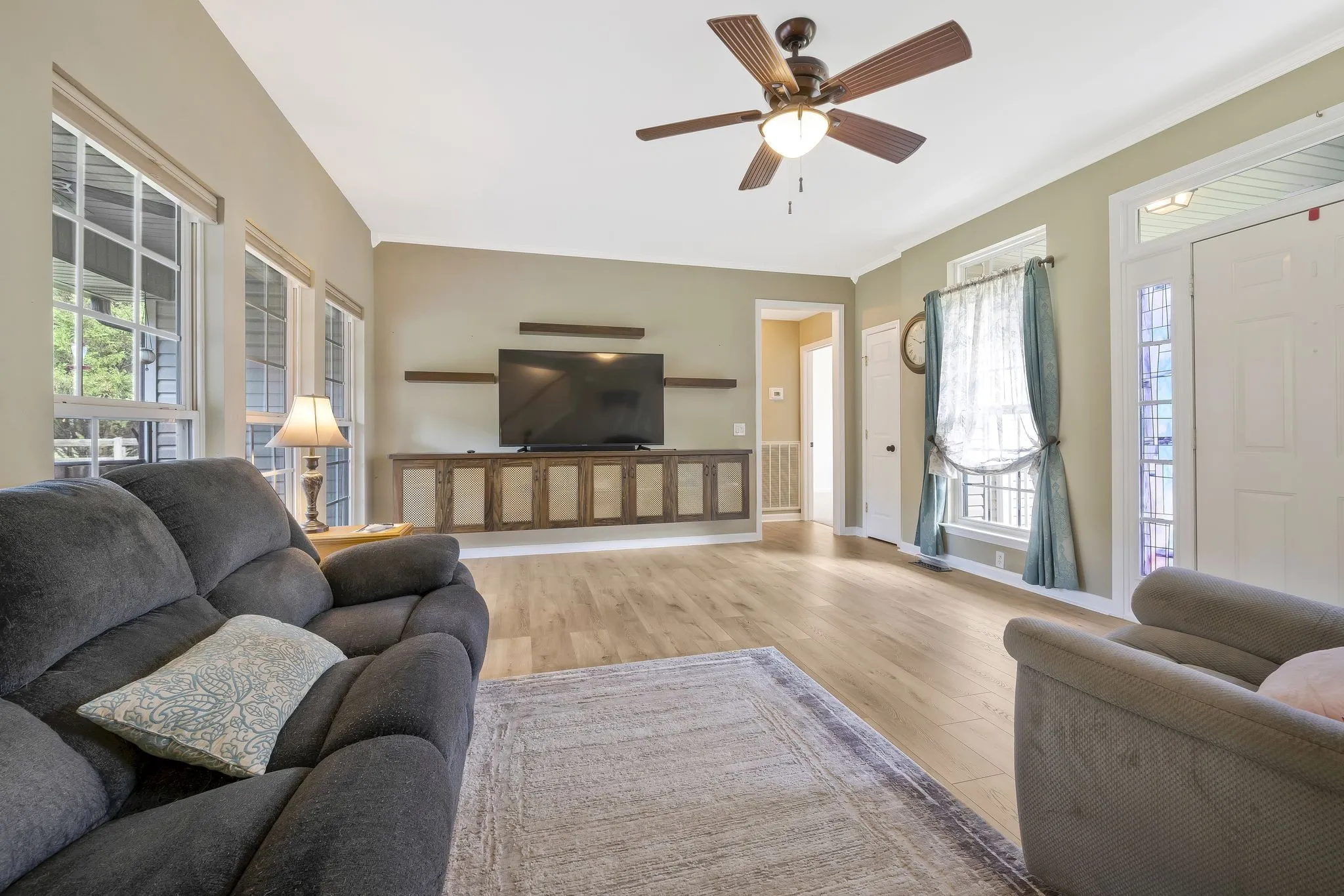 Welcome to this refreshed ranch style home on an amazing flat spacious lot in an established neighborhood ~Open Floor Plan~New Paint & New Floors throughout~Built in entertainment center~Updated kitchen cabinetry with custom pantry~ Upstairs Bonus Room~ New Extended deck ready for grilling & entertaining~Loads of storage~12×12 Shed~Newly renovated walk in shower in primary bath~2 car garage with space for a 3rd car or motorcycle or large work space~Location..Location with close proximity to interstate~ Fenced backyard (5 board taller fence for large dogs)~Washer & Dryer do not convey