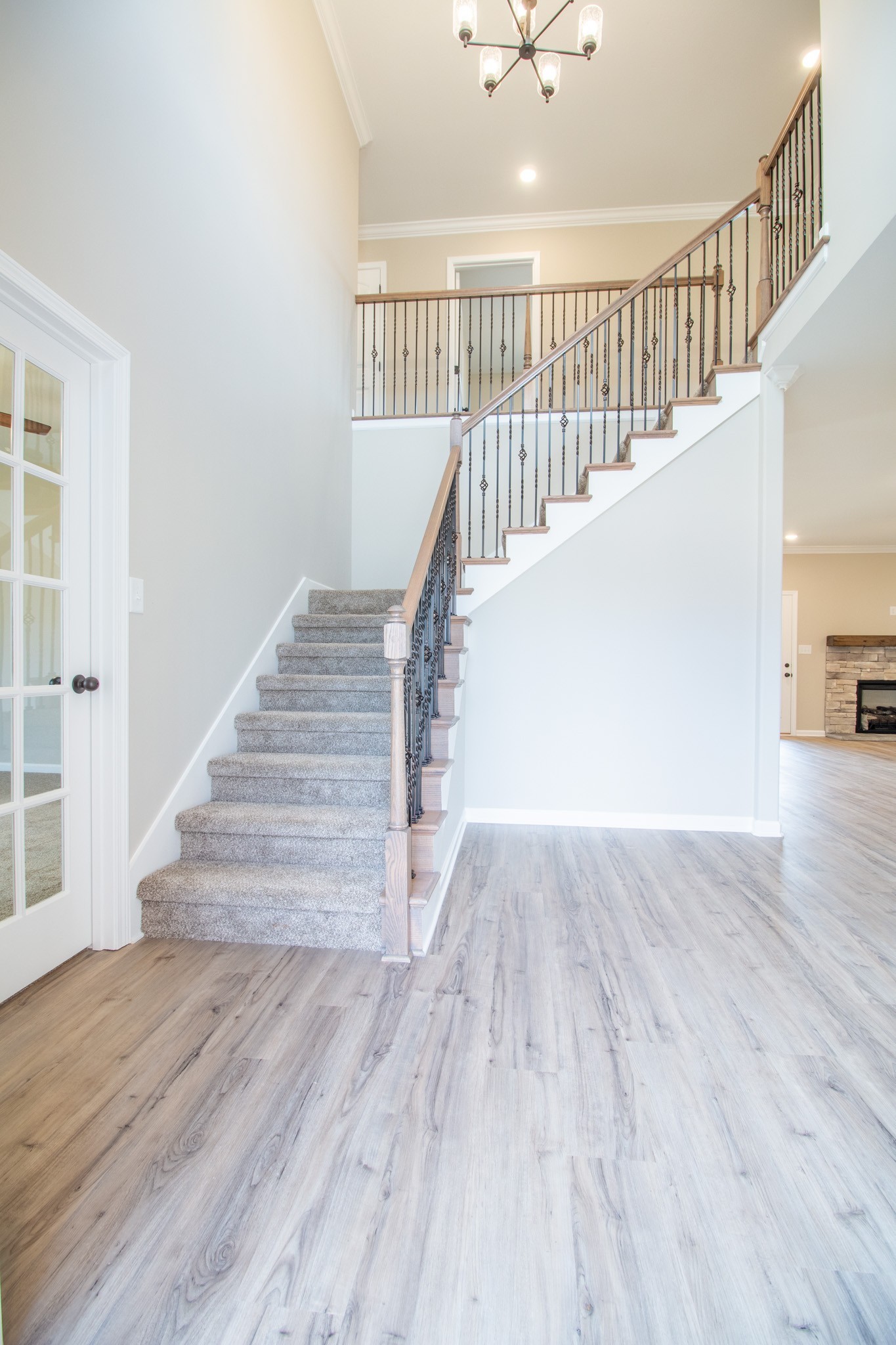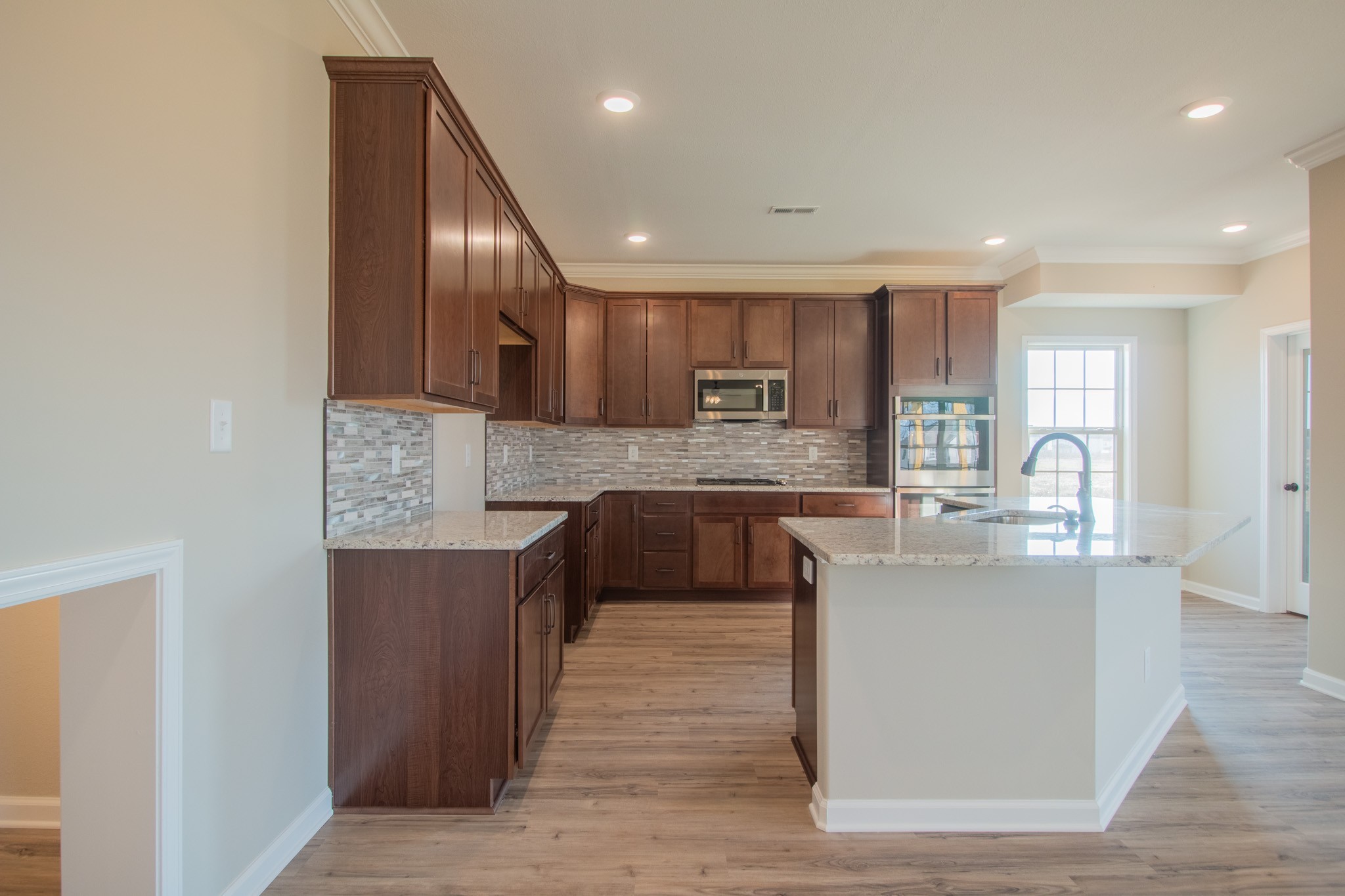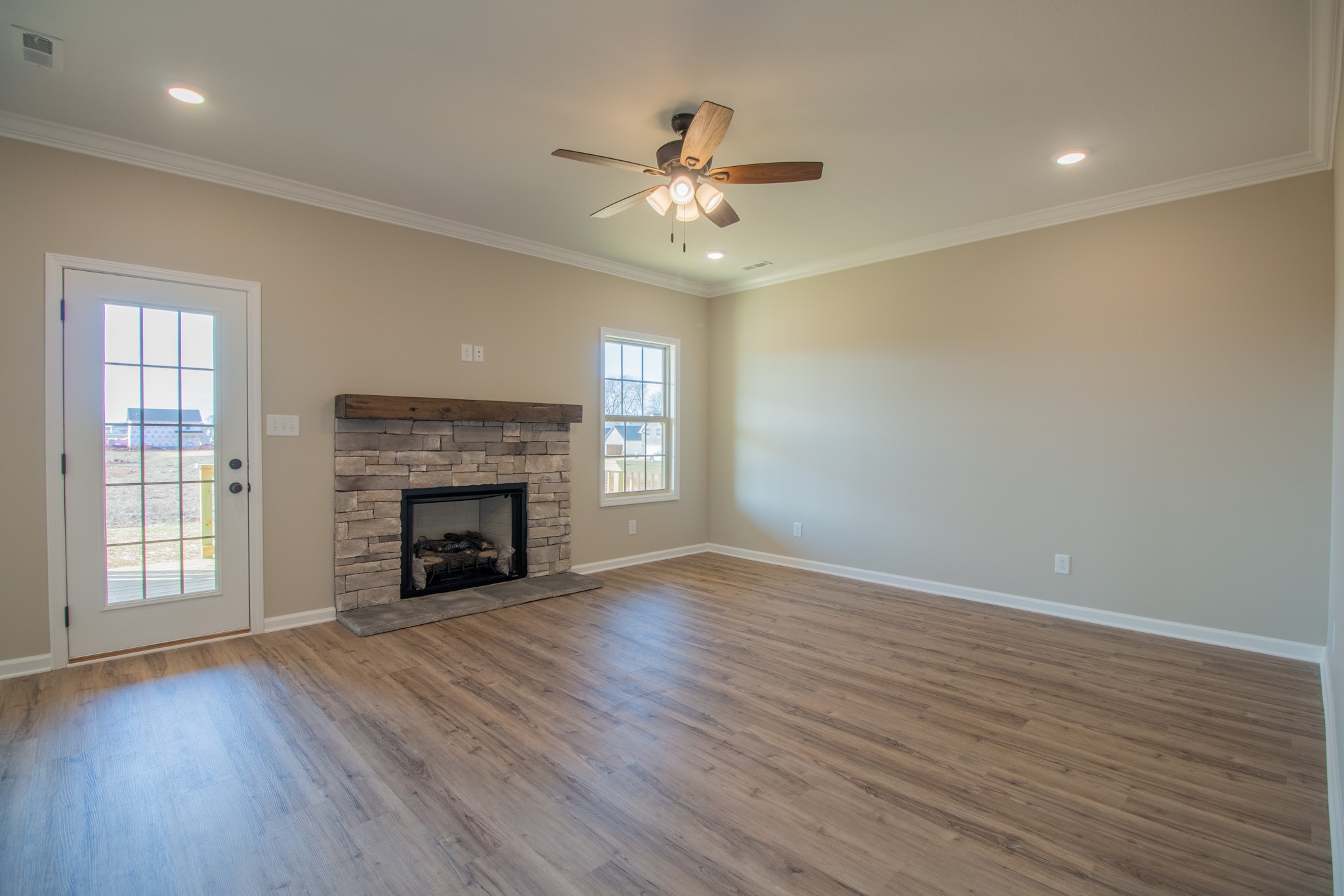 Grand 2 Story Foyer Welcomes You In! Large Living Room w/ a Natural Gas Stone FP & Floating Mantle! Kitchen Features a Massive Island w/ an Extended Countertop for Wraparound Seating; Double Oven, GAS Cooktop, Granite Tops, HUGE Walk-in Pantry w/ a Decorative Door, Open Eat-in Area, Finished Storage Area & Lots of Cabinet Space! Spacious Formal Dining Room w/ Wainscoting & a Coffered Ceiling! Downstairs there is also a Large Guest Room or Office w/ a Beautiful Glass Door! Primary Suite is the Presidential Suite of Bedrooms! It Features a Double Tray Ceiling, En Suite Bathroom w/ a Tile Shower, Soaking Tub, Huge Double Vanity, Toilet Closet & a Double Octagonal Tray Ceiling w/ LED Lighting in Both Trays! Through the Bathroom is a Private Hall that Leads to 2 Large Walk-In Closets, a Linen Closet & Private Access into the Laundry Room!!! Large Guest Rooms Upstairs ALL w/ Walk-in Closets! SPC Flooring Throughout Main Areas, Polished Tile, Crown Molding, Custom Trim & a Large Covered Deck!