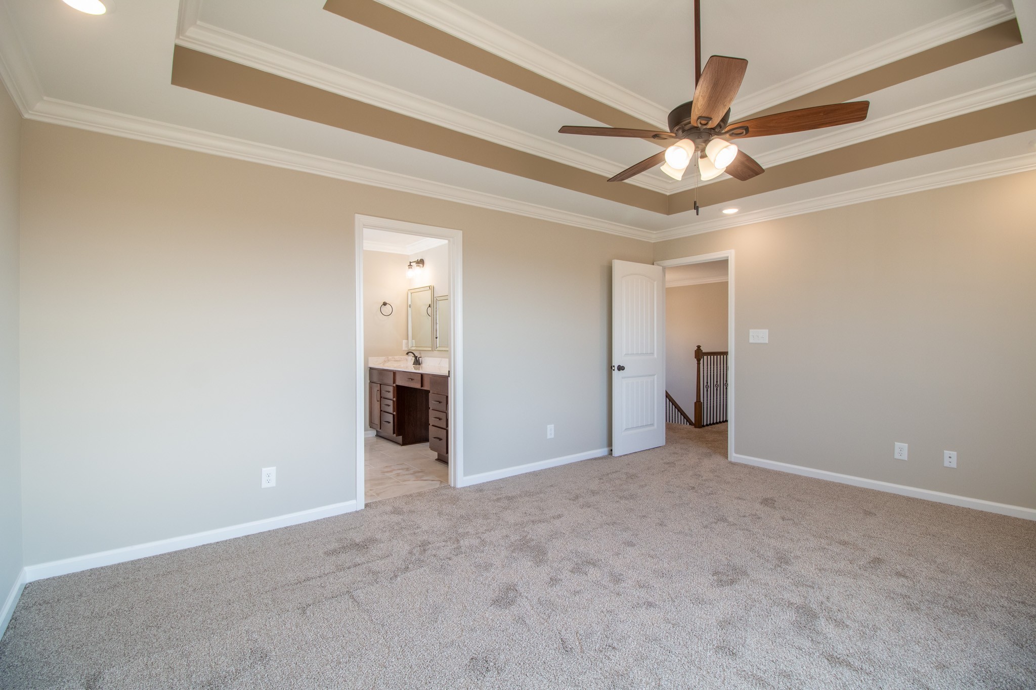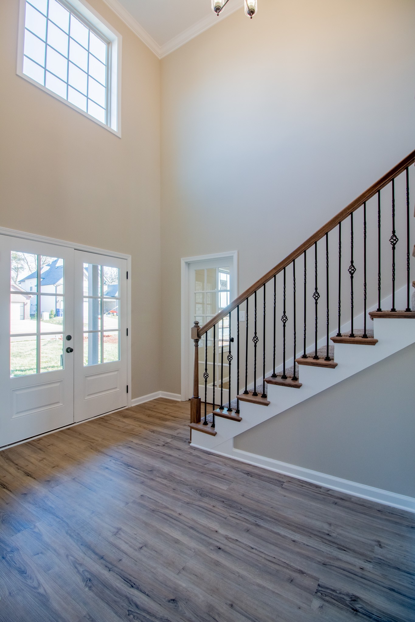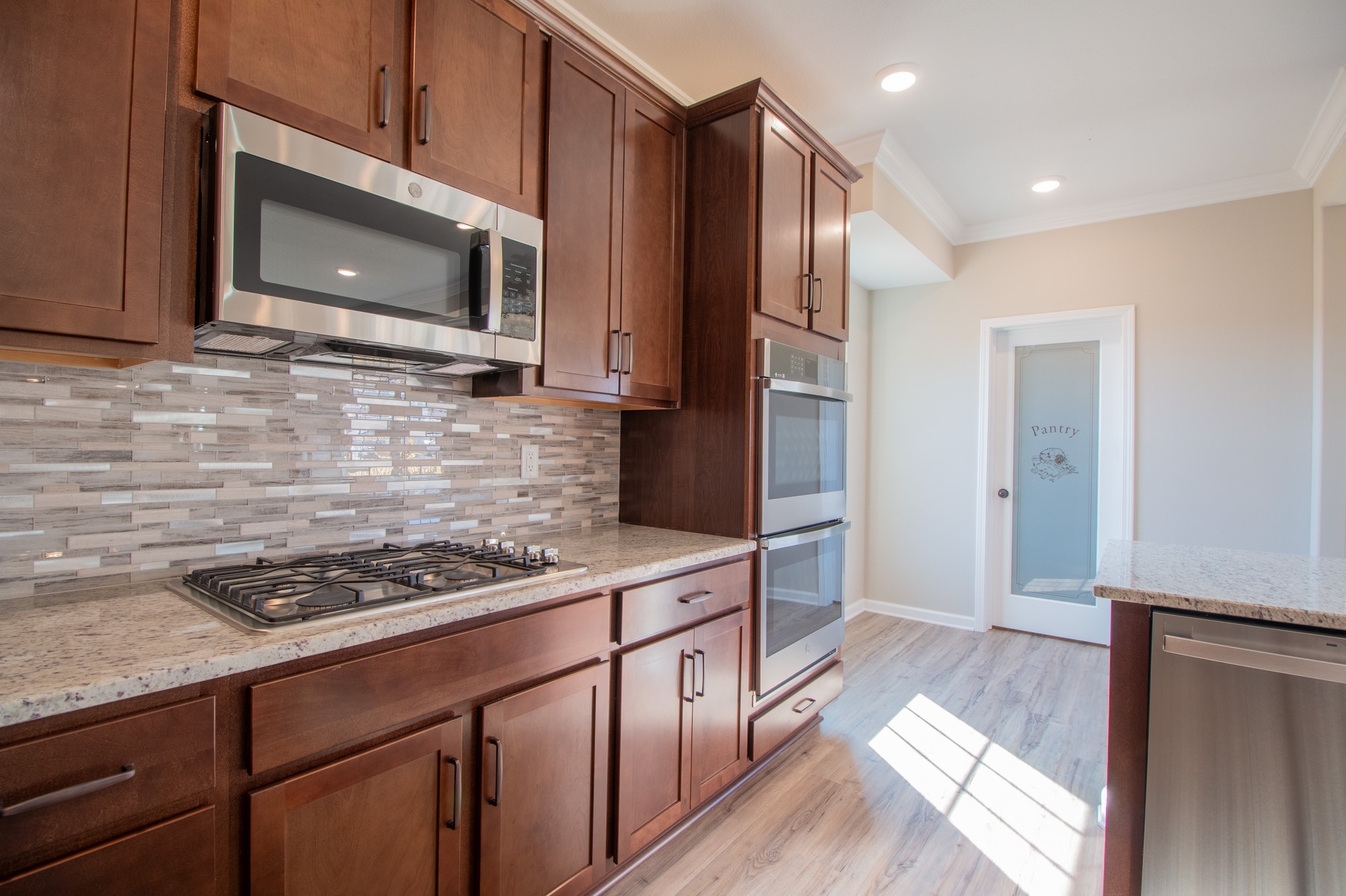 Grand 2 Story Foyer Welcomes You In! Large Living Room w/ a Natural Gas Stone FP & Floating Mantle! Kitchen Features a Massive Island w/ an Extended Countertop for Wraparound Seating; Double Oven, GAS Cooktop, Granite Tops, HUGE Walk-in Pantry w/ a Decorative Door, Open Eat-in Area, Finished Storage Area & Lots of Cabinet Space! Spacious Formal Dining Room w/ Wainscoting & a Coffered Ceiling! Downstairs there is also a Large Guest Room or Office w/ a Beautiful Glass Door! Primary Suite is the Presidential Suite of Bedrooms! It Features a Double Tray Ceiling, En Suite Bathroom w/ a Tile Shower, Soaking Tub, Huge Double Vanity, Toilet Closet & a Double Octagonal Tray Ceiling w/ LED Lighting in Both Trays! Through the Bathroom is a Private Hall that Leads to 2 Large Walk-In Closets, a Linen Closet & Private Access into the Laundry Room!!! Large Guest Rooms Upstairs ALL w/ Walk-in Closets! SPC Flooring Throughout Main Areas, Polished Tile, Crown Molding, Custom Trim & a Large Covered Deck!