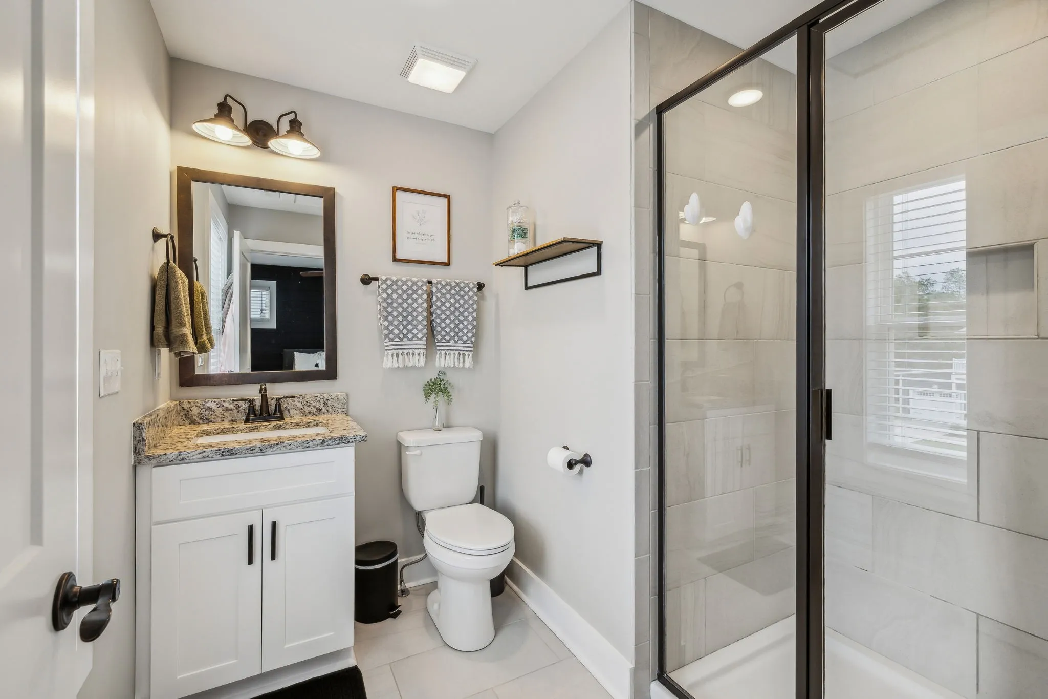 "LongDescription" => "Primary Bathroom with Tile Shower with Glass Door, Granite counter tops, and tile flooring."