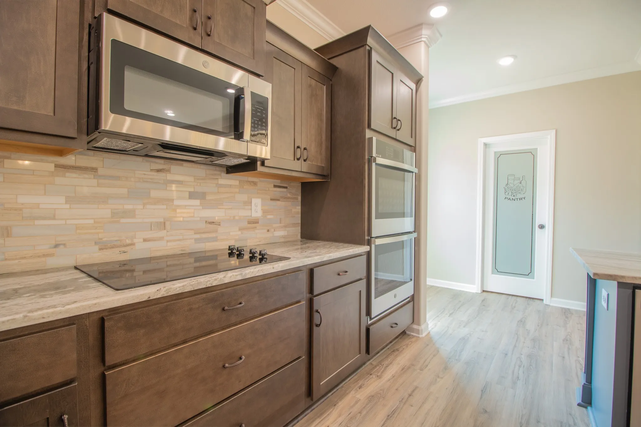 +"PublicRemarks": "NO BACKYARD NEIGHBORS!! Grand 2 Story Foyer Welcomes You In! Large Living Rm w/ Electric Stone FP & Floating Mantle! Kitchen Features a Massive Island w/ an Extended Countertop w/ Wraparound Seating; Double Oven, Cooktop, Granite Tops, HUGE Walk-in Pantry w/ a Decorative Door, Open Eat-in Area, Finished Storage Area & Lots of Cabinet Space! Spacious Formal Dining Rm w/ Wainscoting & a Coffered Ceiling! Downstairs there is also a Large Guest Rm or Office w/ a Beautiful Glass Door! Primary Suite is the Presidential Suite of Bedrms! It Features a Double Tray Ceiling, En Suite Bathrm w/ a Tile Shower, Soaking Tub, Huge Double Vanity, Toilet Closet & a Double Octagonal Tray Ceiling w/ LED Lighting in Both Trays! Through the Bathrm is a Private Hall that Leads to 2 Large Walk-In Closets, a Linen Closet & Private Access into the Laundry Rm!!! Large Guest Rms Upstairs ALL w/ Walk-in Closets! SPC Flooring Throughout Main Areas, Polished Tile, Crown Molding, Custom Trim & a Large Covered Deck!"