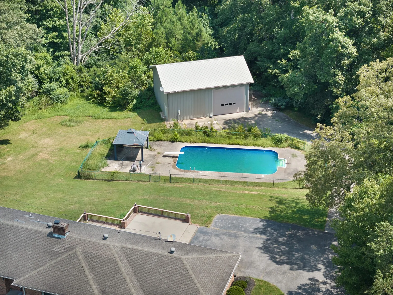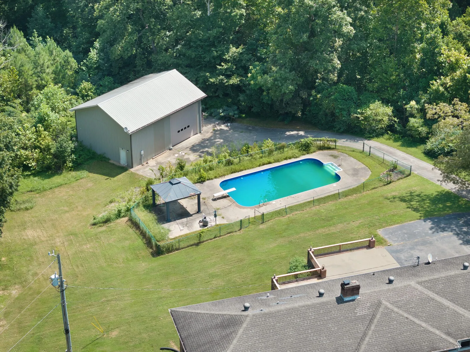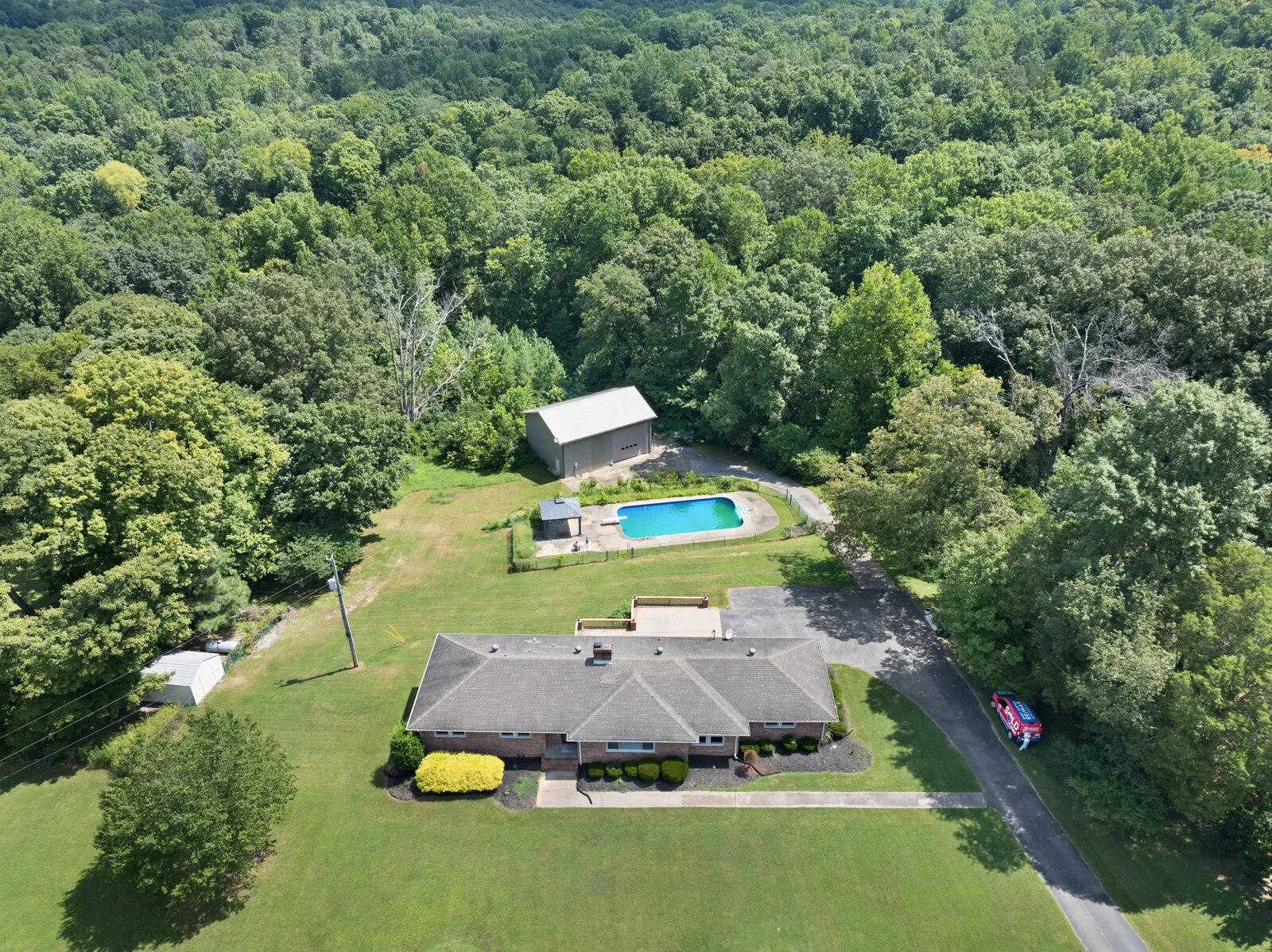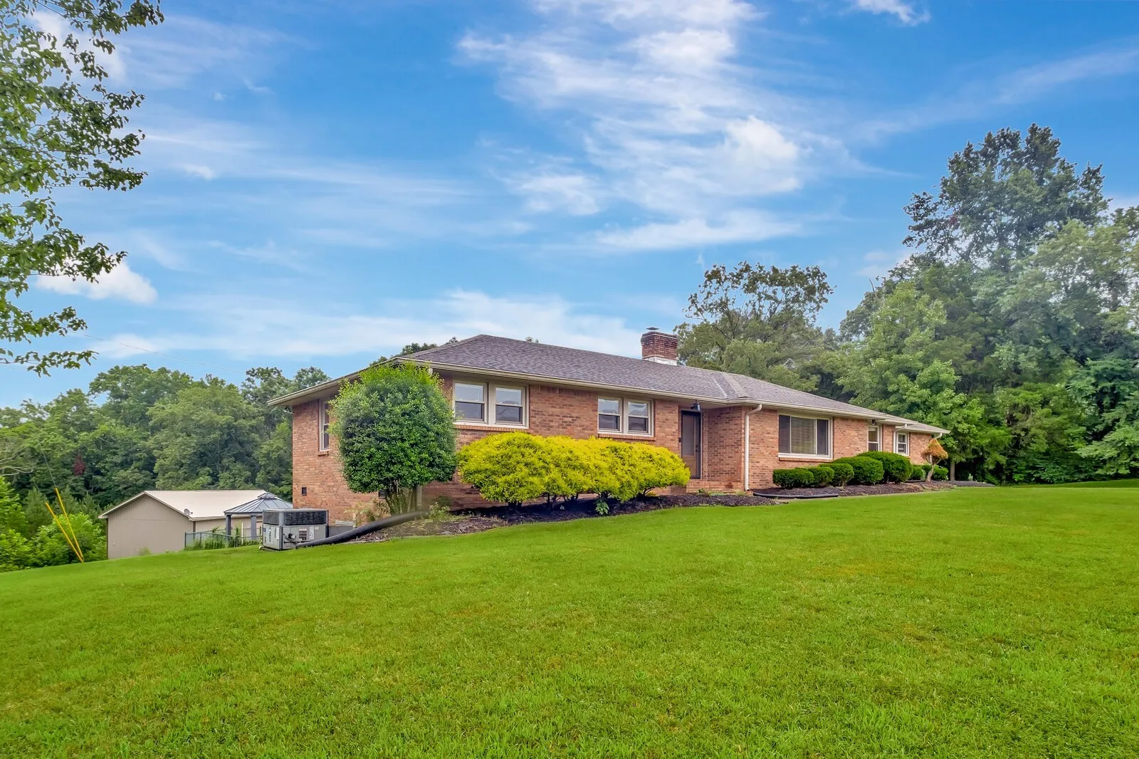Step into refined comfort with this exquisite ranch-style home situated on 3 serene acres with your own creek. A welcoming foyer opens to the spacious living room, where large windows bathe the space in natural light, creating a warm and inviting atmosphere perfect for both relaxation and entertaining. The gourmet kitchen is a chef’s dream, featuring granite countertops, custom cabinetry, and stainless steel appliances, offering plenty of space for culinary creativity. Adjacent to the kitchen is a charming dining area, ideal for family meals. Outside, enjoy a newly lined saltwater in-ground pool surrounded by lush landscaping and a spacious patio perfect for dining and lounging. This outdoor oasis is perfect for summer barbecues or quiet evenings under the stars. Additionally, a 30×40 shop awaits, complete with a bathroom, HVAC system, kitchenette, and loft storage. This versatile space offers endless possibilities for creative projects or a workshop. This home is the perfect retreat!