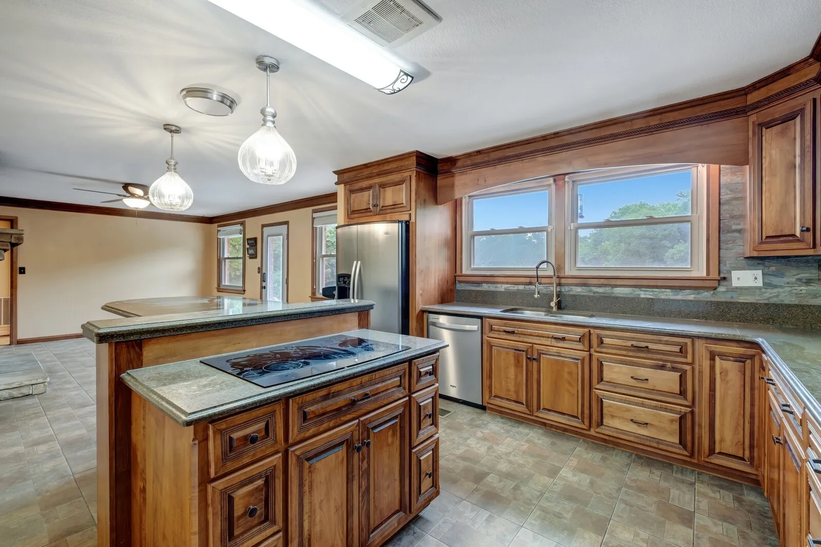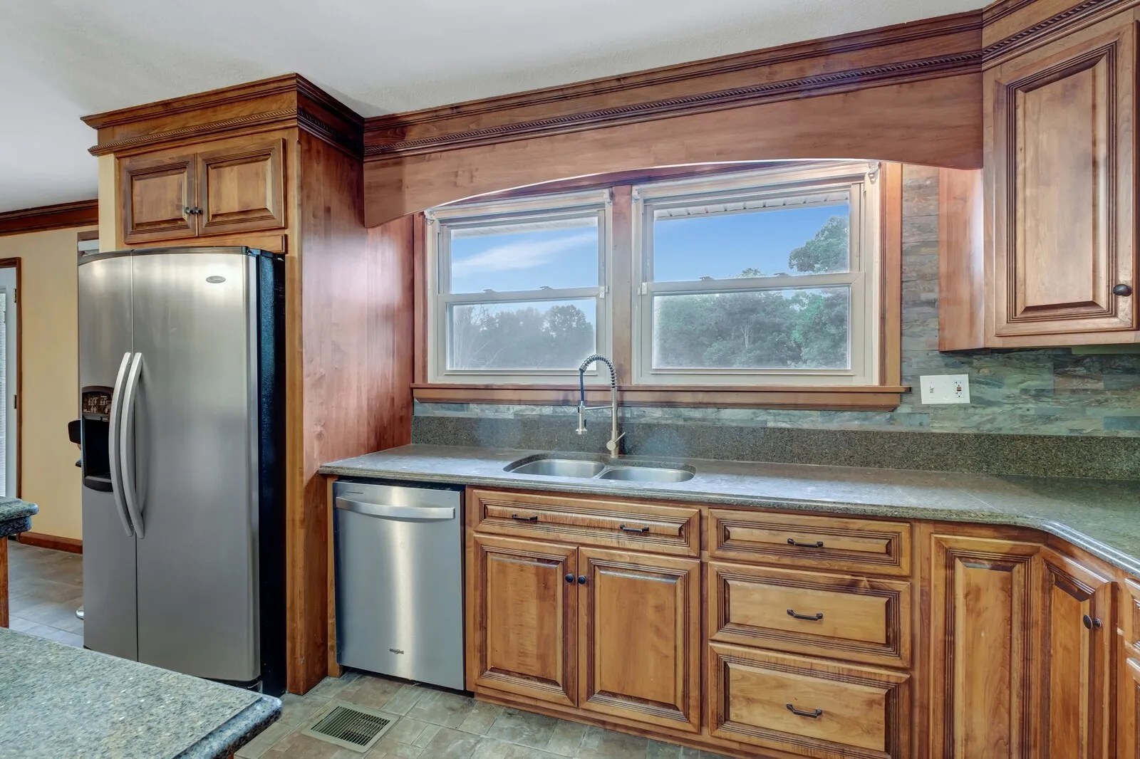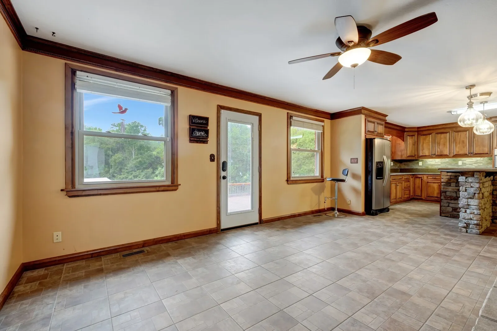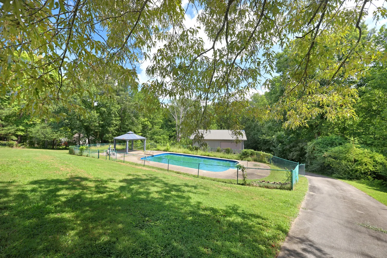 Step into refined comfort with this exquisite ranch-style home situated on 3 serene acres with your own creek. A welcoming foyer opens to the spacious living room, where large windows bathe the space in natural light, creating a warm and inviting atmosphere perfect for both relaxation and entertaining. The gourmet kitchen is a chef’s dream, featuring granite countertops, custom cabinetry, and stainless steel appliances, offering plenty of space for culinary creativity. Adjacent to the kitchen is a charming dining area, ideal for family meals. Outside, enjoy a newly lined saltwater in-ground pool surrounded by lush landscaping and a spacious patio perfect for dining and lounging. This outdoor oasis is perfect for summer barbecues or quiet evenings under the stars. Additionally, a 30×40 shop awaits, complete with a bathroom, HVAC system, kitchenette, and loft storage. This versatile space offers endless possibilities for creative projects or a workshop. This home is the perfect retreat!