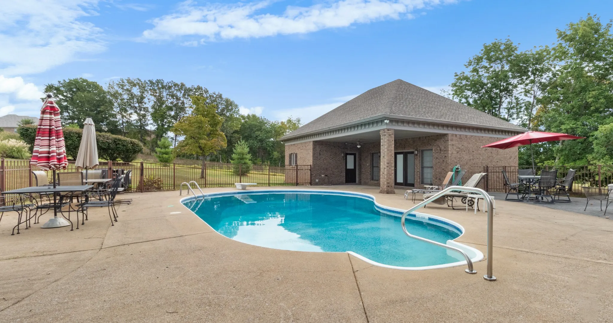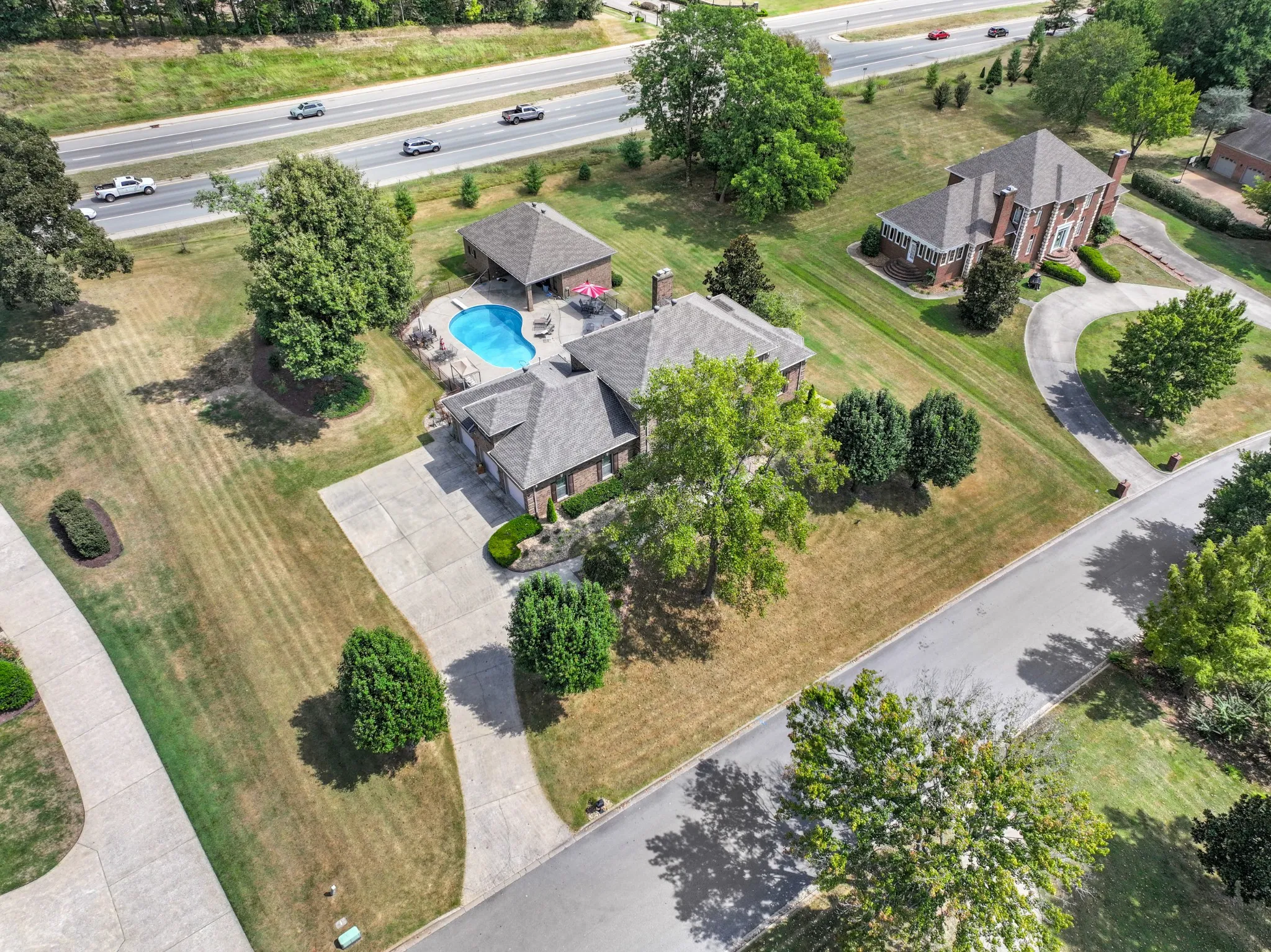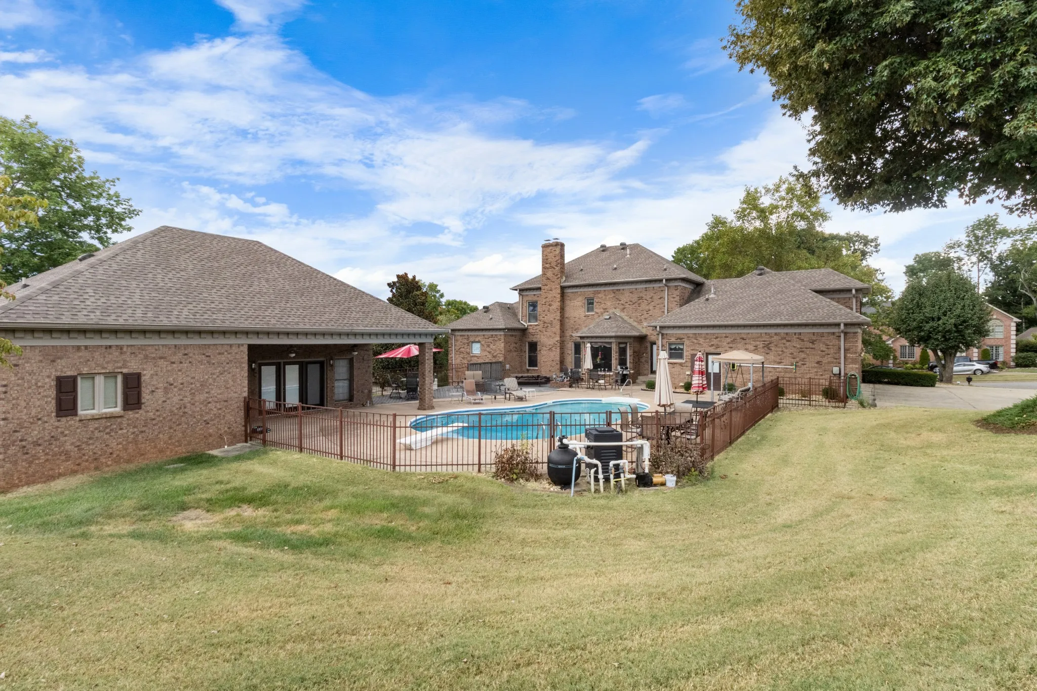 This well-maintained 2-story all brick home features a large concrete driveway leading to a 3-car garage. Inside, discover a well-designed layout that includes a formal dining room flanked by a formal living room, cozy den with a traditional brick fireplace, chef’s kitchen, laundry room with half bath and large primary bedroom. The main level primary is a serene retreat, boasting beautiful hardwood floors and plenty of natural light. Three additional bedrooms, two full bathrooms, and a bonus room serves the second level. The outdoor living space is impressive featuring an in-ground heated pool with diving board, sunken spa in the composite deck, built in firepit and covered patio area off the detached pool house. The pool house serves as a true casitas enhancing the outdoor living experience and boasting its own primary bedroom with full bath, kitchen, a real laundry room with half bath,and separate living/great room. Below a full sized garage door accesses the partial basement.