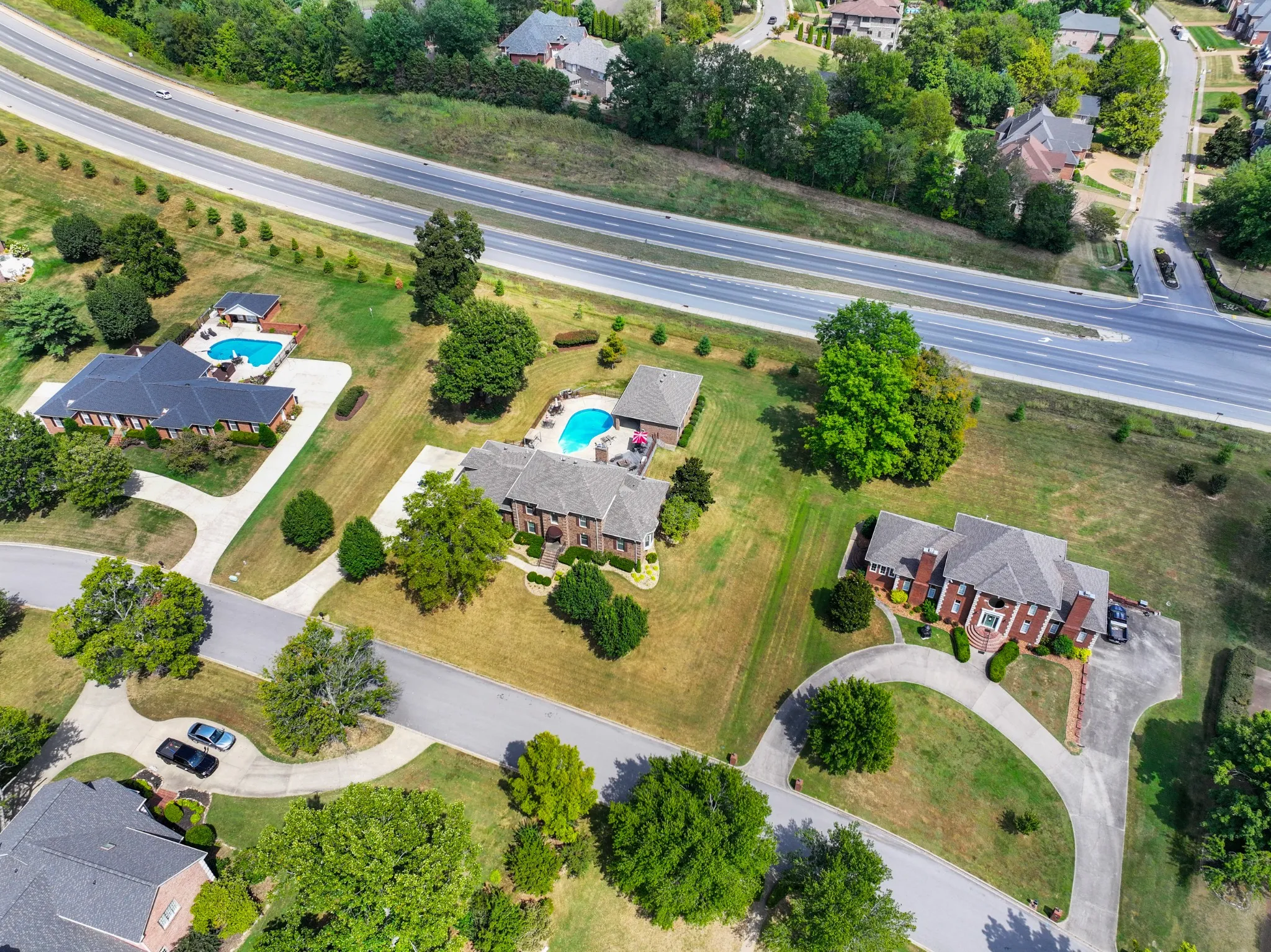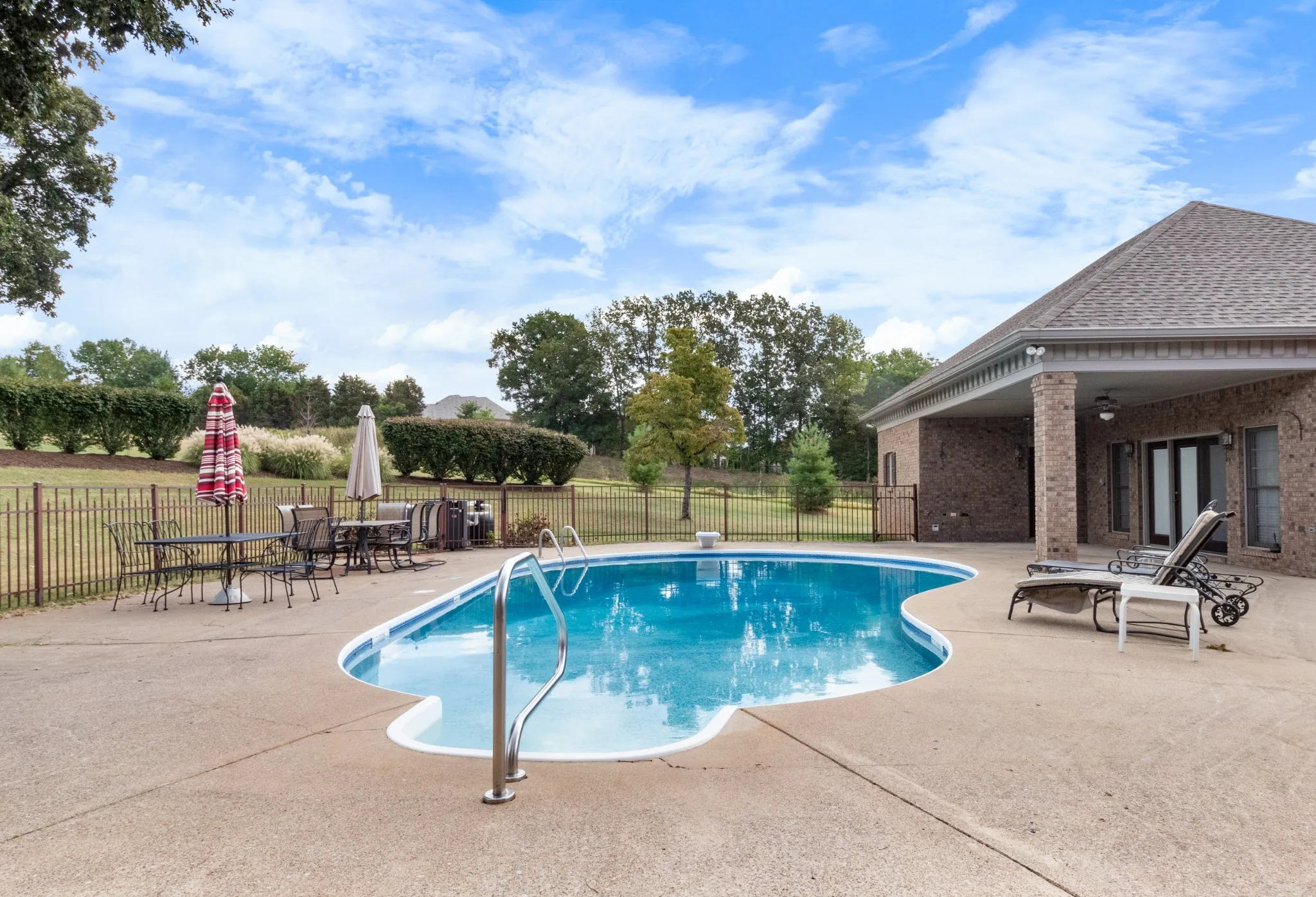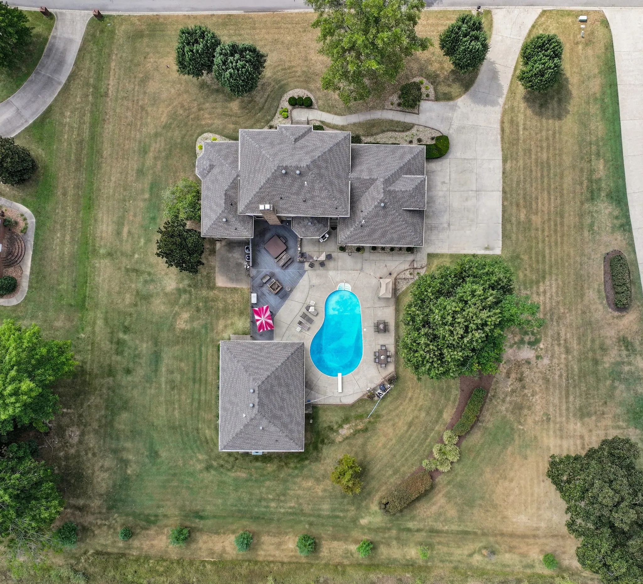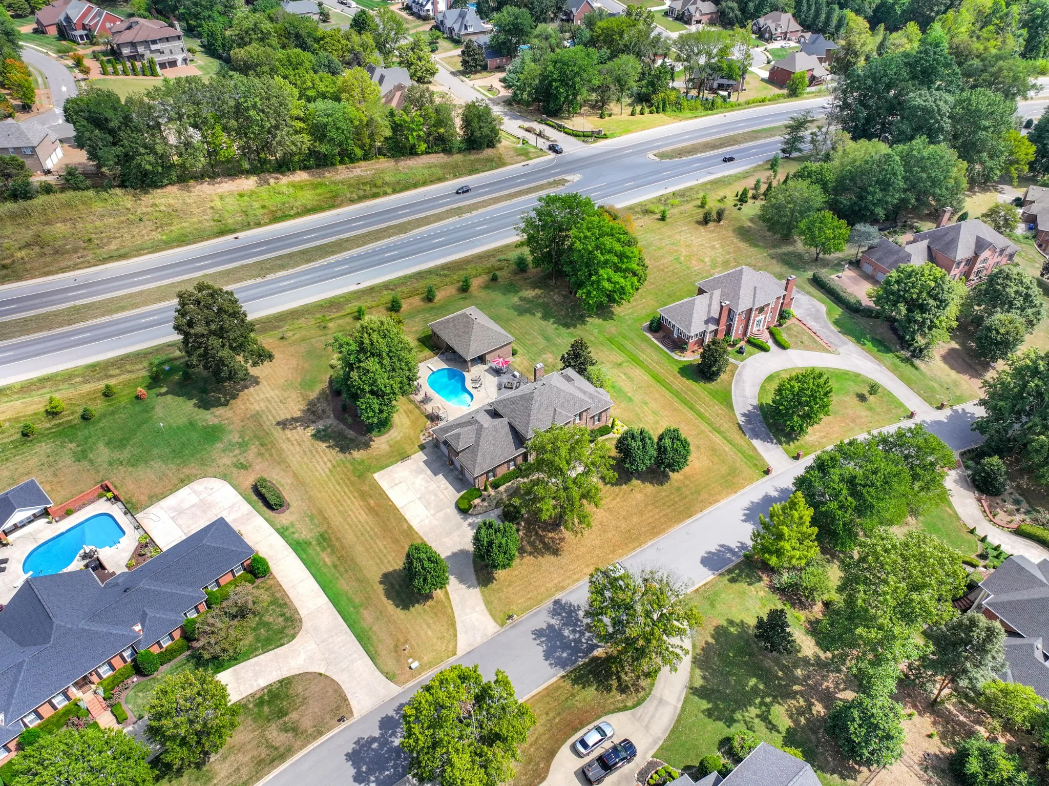 This well-maintained 2-story all brick home features a large concrete driveway leading to a 3-car garage. Inside, discover a well-designed layout that includes a formal dining room flanked by a formal living room, cozy den with a traditional brick fireplace, chef’s kitchen, laundry room with half bath and large primary bedroom. The main level primary is a serene retreat, boasting beautiful hardwood floors and plenty of natural light. Three additional bedrooms, two full bathrooms, and a bonus room serves the second level. The outdoor living space is impressive featuring an in-ground heated pool with diving board, sunken spa in the composite deck, built in firepit and covered patio area off the detached pool house. The pool house serves as a true casitas enhancing the outdoor living experience and boasting its own primary bedroom with full bath, kitchen, a real laundry room with half bath,and separate living/great room. Below a full sized garage door accesses the partial basement.