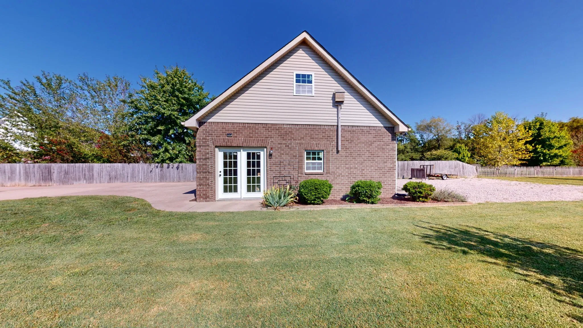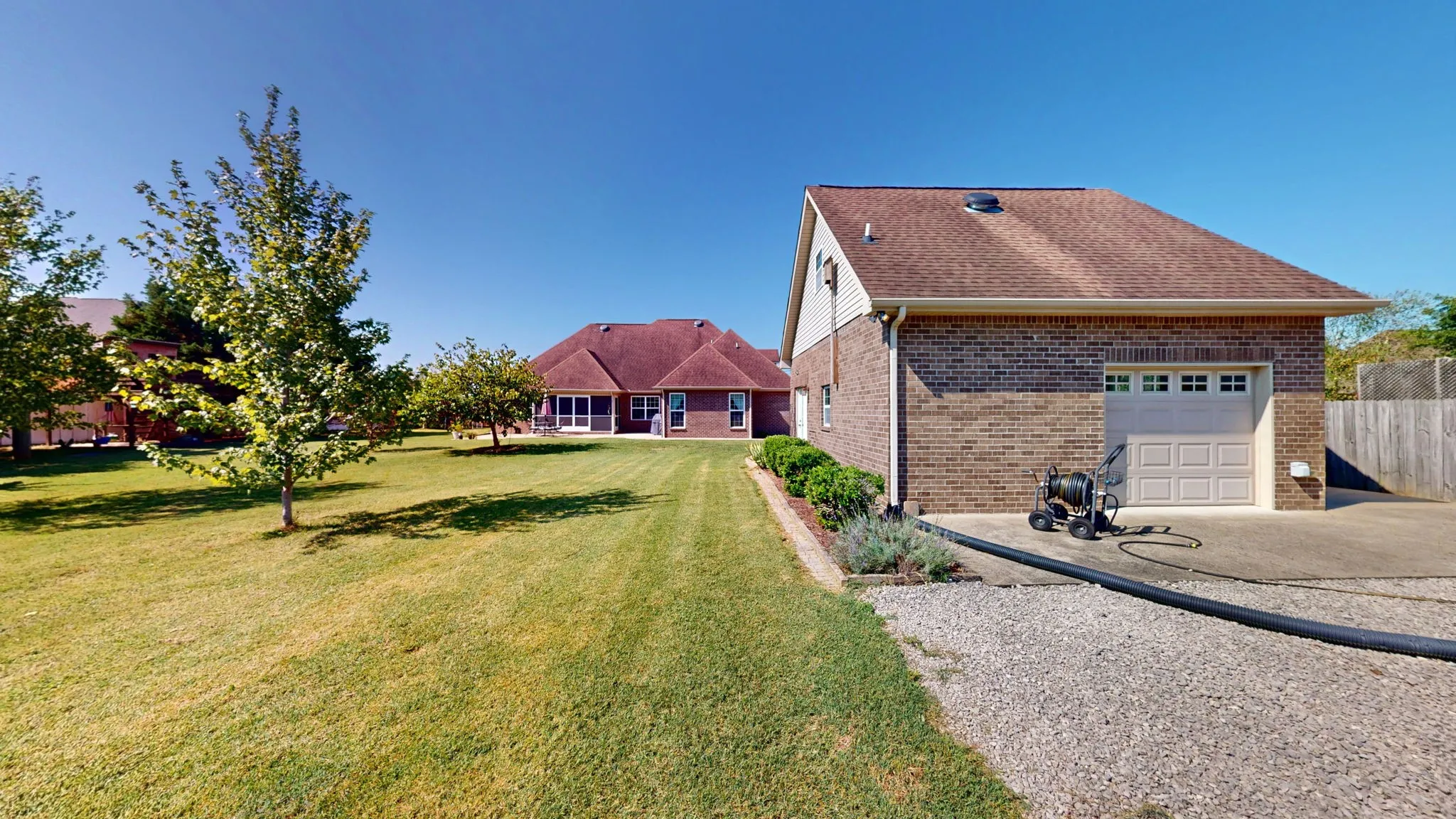 +"PublicRemarks": "This immaculately maintained home features a Flex Room in addition to the three bedrooms. Featuring a detached two story brick 799 SqFt garage/work shed with gas heating, ceiling fans, garage door entry & exit, and an extra parking area with a 240V outlet. Enjoy the views of your sunrise facing screened back porch overlooking 1.4 acres with a playground set, pear trees, and raised garden beds. All of the bedrooms are conveniently located on the main floor with wide plank Acacia hardwood throughout. Living room features high ceilings & gas fireplace. Primary bedroom features a large full bathroom with dual vanities, doublehead shower, and walk in closet. Partially open kitchen with eating nook and separate dining area. In addition to the detached garage/shed the home also features an attached two car garage with bonus walkin storage above the garage. Location is the perfect combination of seclusion while being convenient to stores & shopping. A beautiful home and rare opportunity."