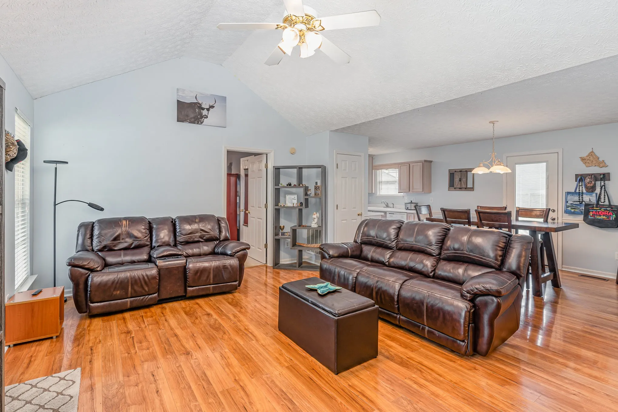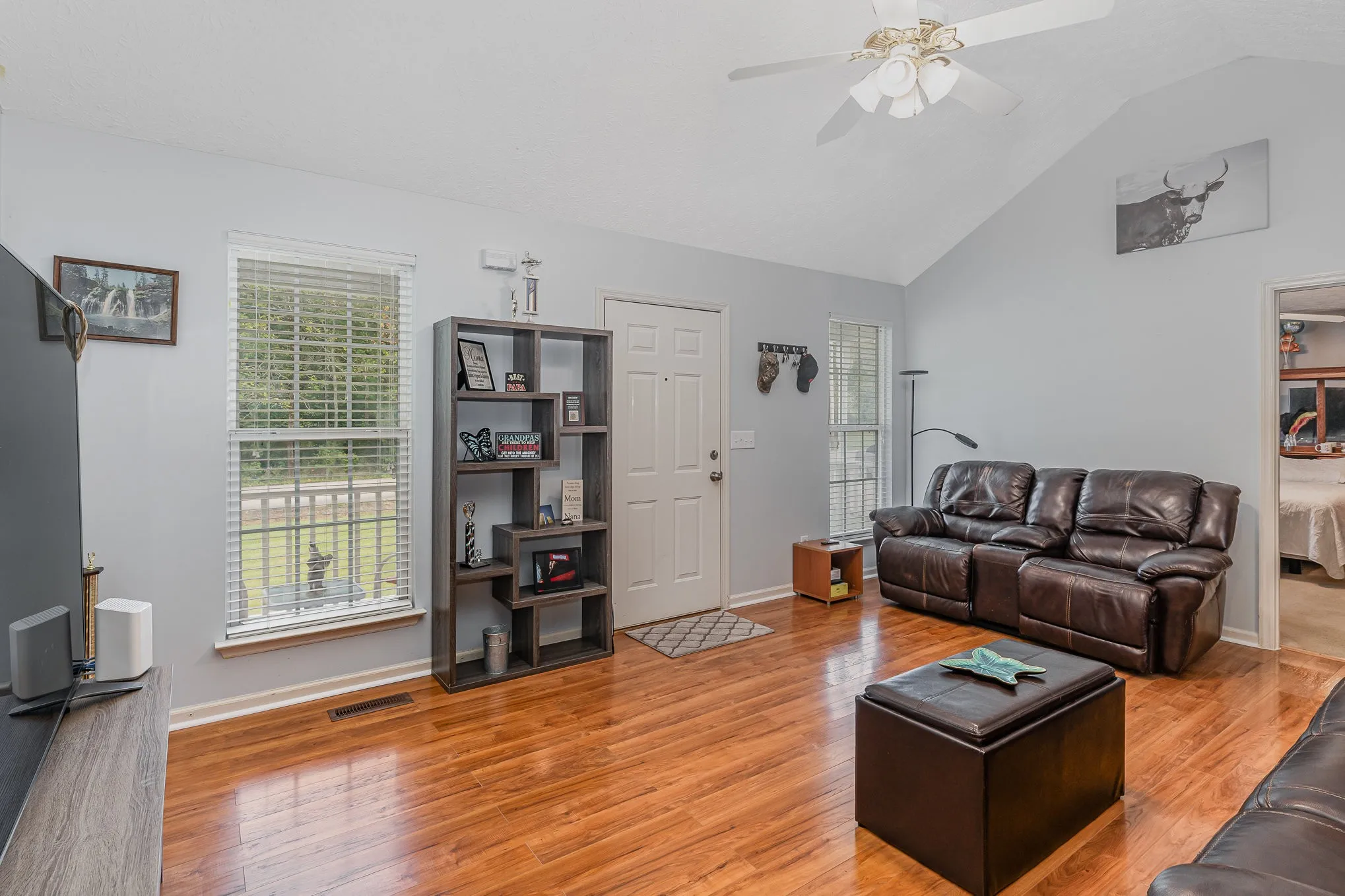 Discover this charming single-level home with no HOA. 2 yr old HVAC. Featuring a vaulted ceiling in the living room for a bright and airy feel. Laminate flooring in the main areas. The primary bedroom includes a full bath and walk-in closet, ensuring comfort and convenience. Outside, enjoy a spacious backyard with a patio for outdoor living and entertaining. Plus, two outbuildings offer extra storage or workspace options. Located in a quiet neighborhood, this home offers a perfect blend of comfort and functionality. Veteran’s Memorial Park entrance across the road with hiking trails and fishing.