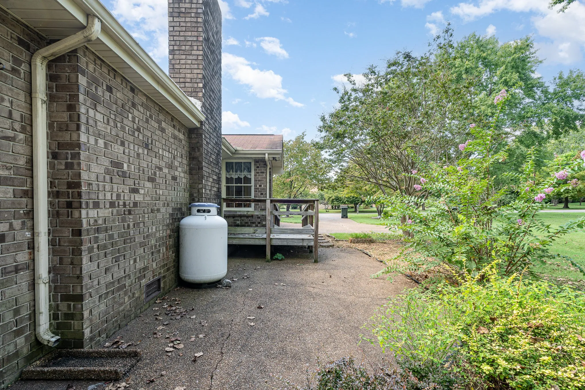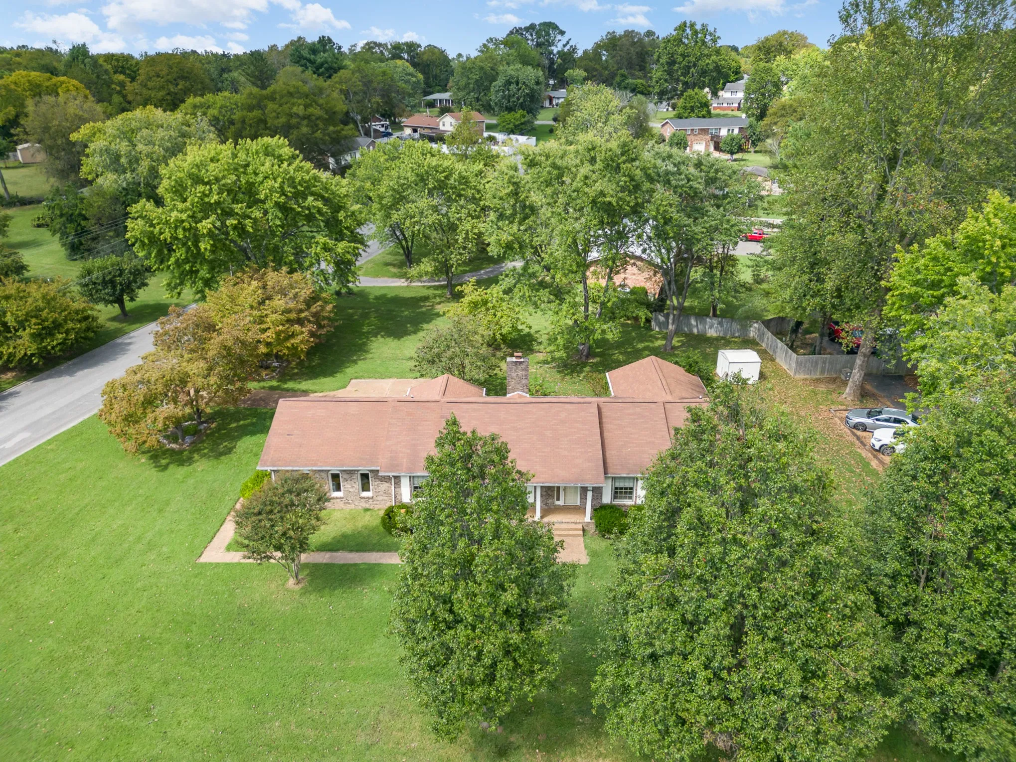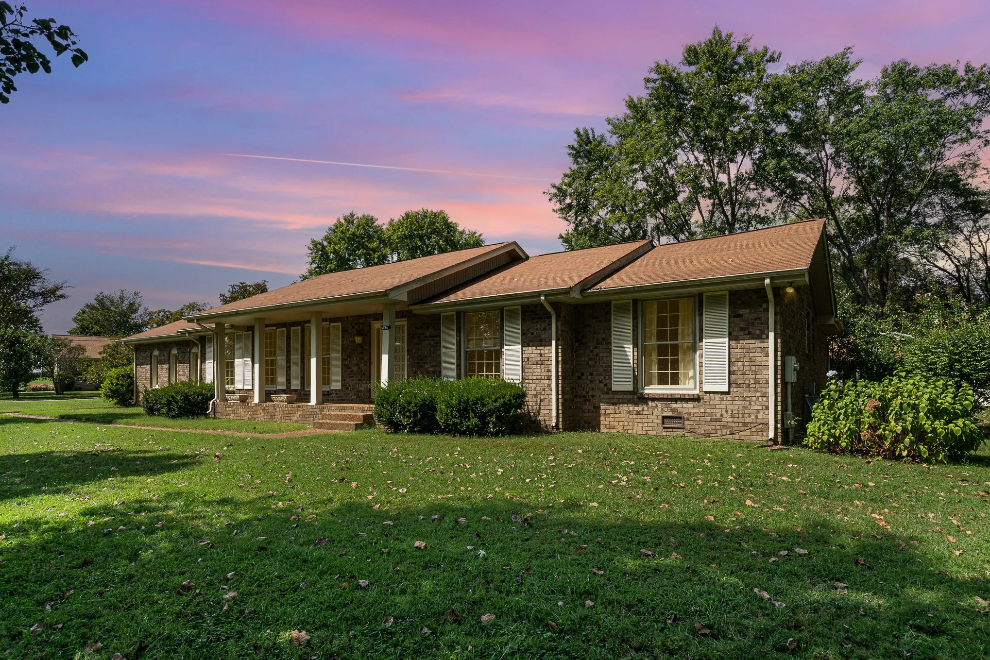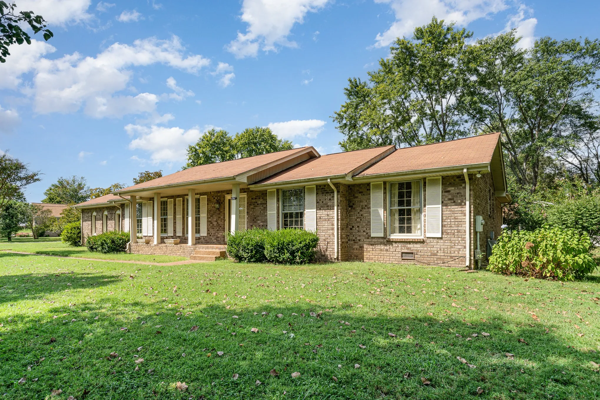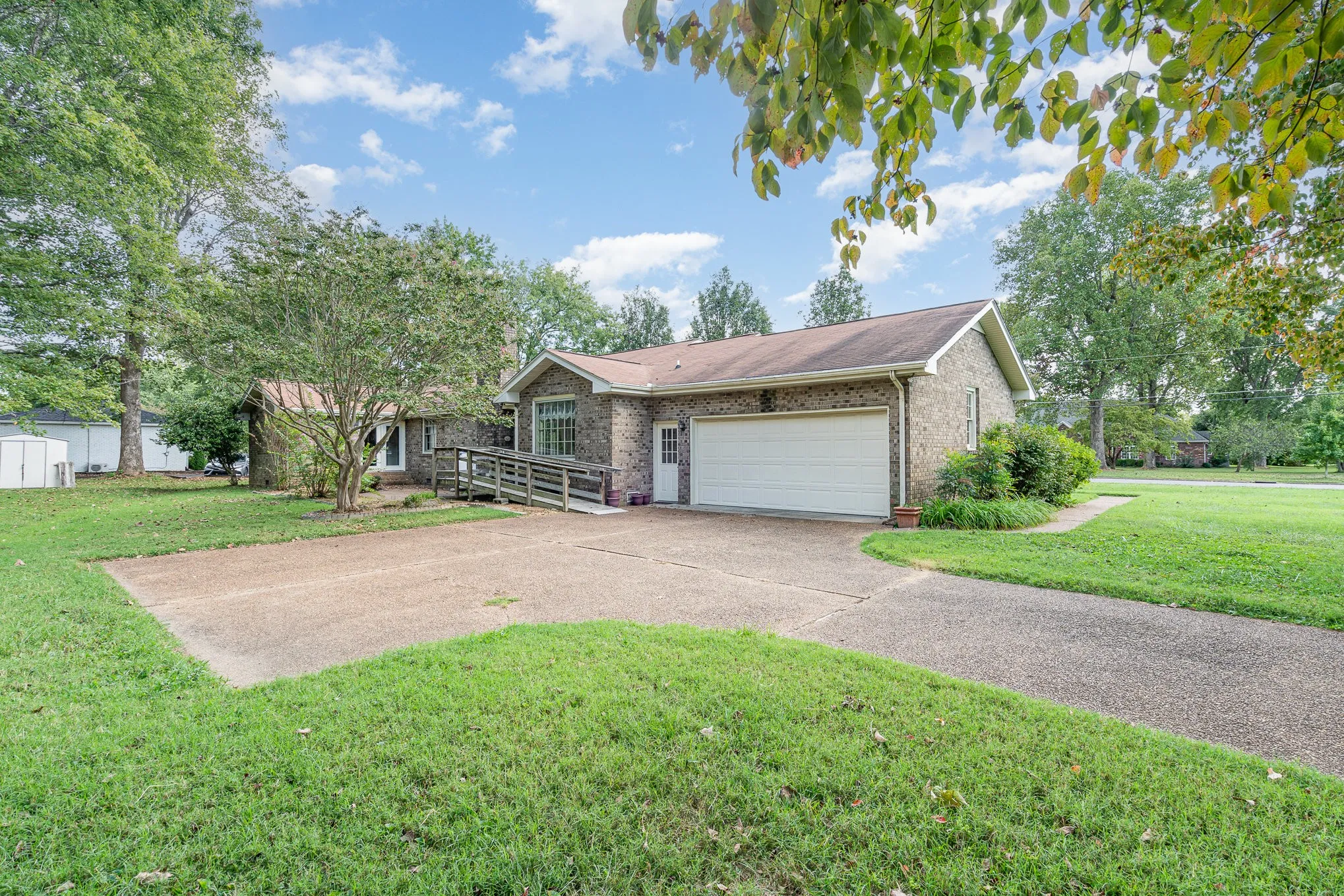 BRAND NEW ROOF 11/2024!!!! Charming brick home on a spacious corner lot in a well-established, peaceful neighborhood with no HOA fees. This one-level residence features 3 bedrooms, 2 bathrooms, a cozy den with a fireplace, and a large living room that opens to a dining area. Enjoy outdoor relaxation on the inviting front porch. The property also offers a two-car garage, a convenient storage shed, and a durable concrete driveway. Nestled on a quiet street with no through traffic. Sold AS-IS (with new roof), presenting a fantastic opportunity for customization and personal touches.