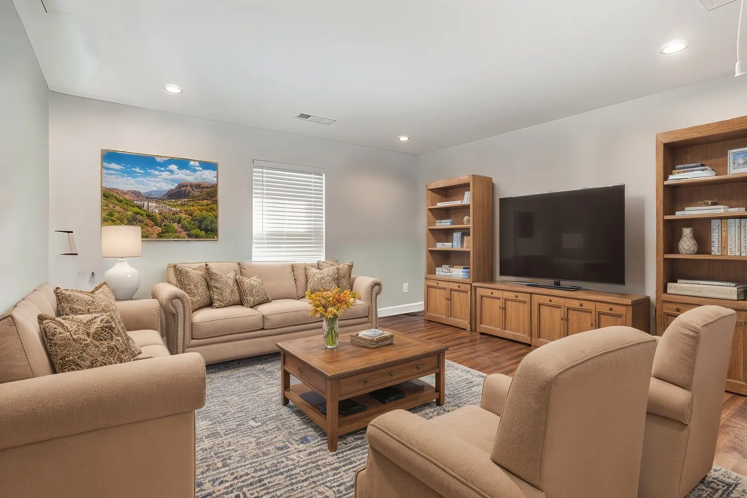 Situated on a corner lot, this 4 bedroom home features spacious living areas with stylish new light fixtures and modern kitchen lighting. New wide plank flooring adds warmth throughout. Enjoy the walk-in pantry, luxurious tile shower, efficient tankless water heater, and insulated garage. Entertain easily with included TVs in living and bonus rooms. Fenced backyard offers a perfect retreat. Just 10 minutes from schools and nestled in a tranquil suburb, this delightful property blends convenience with peaceful living. Your dream home awaits!