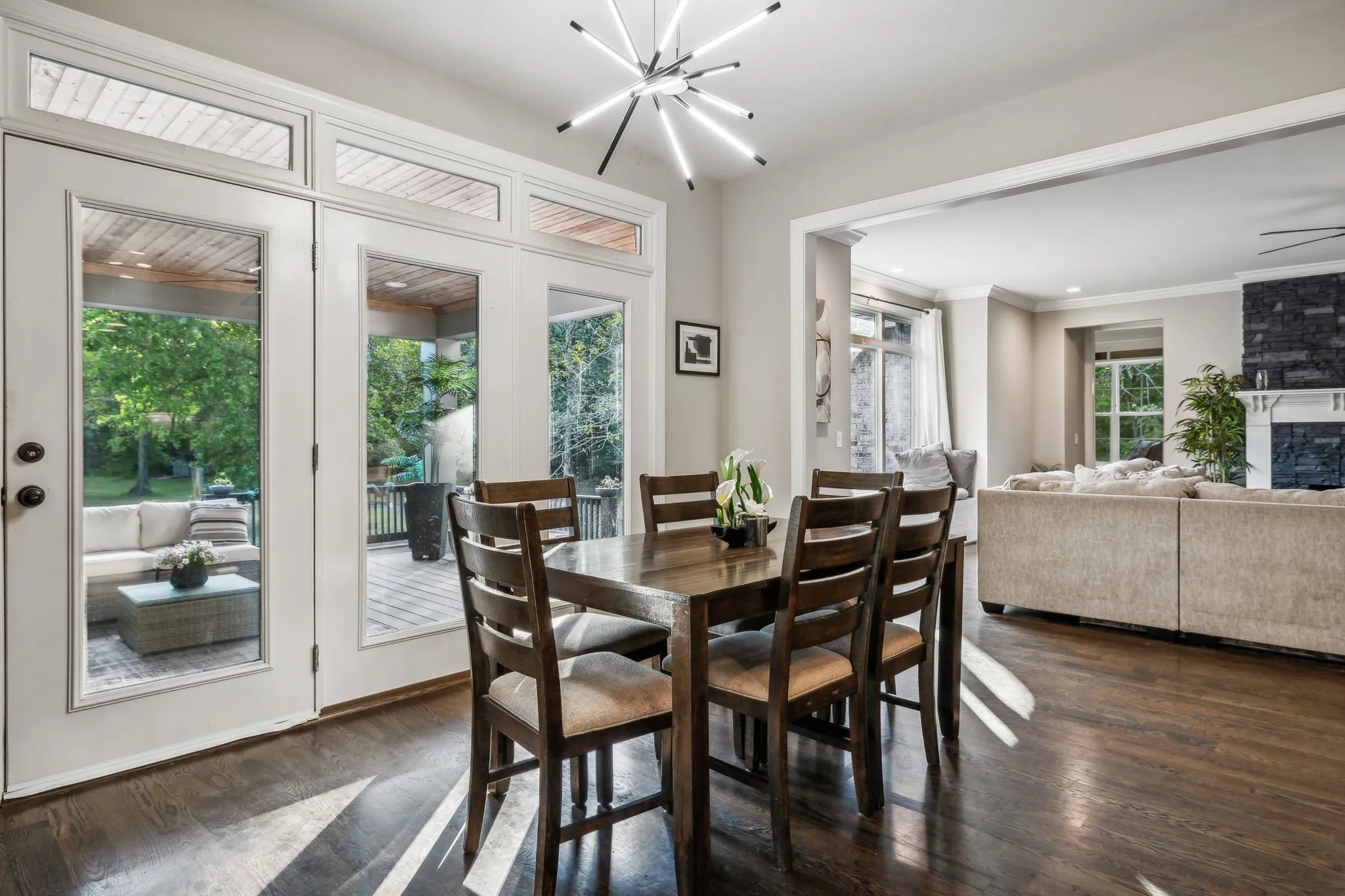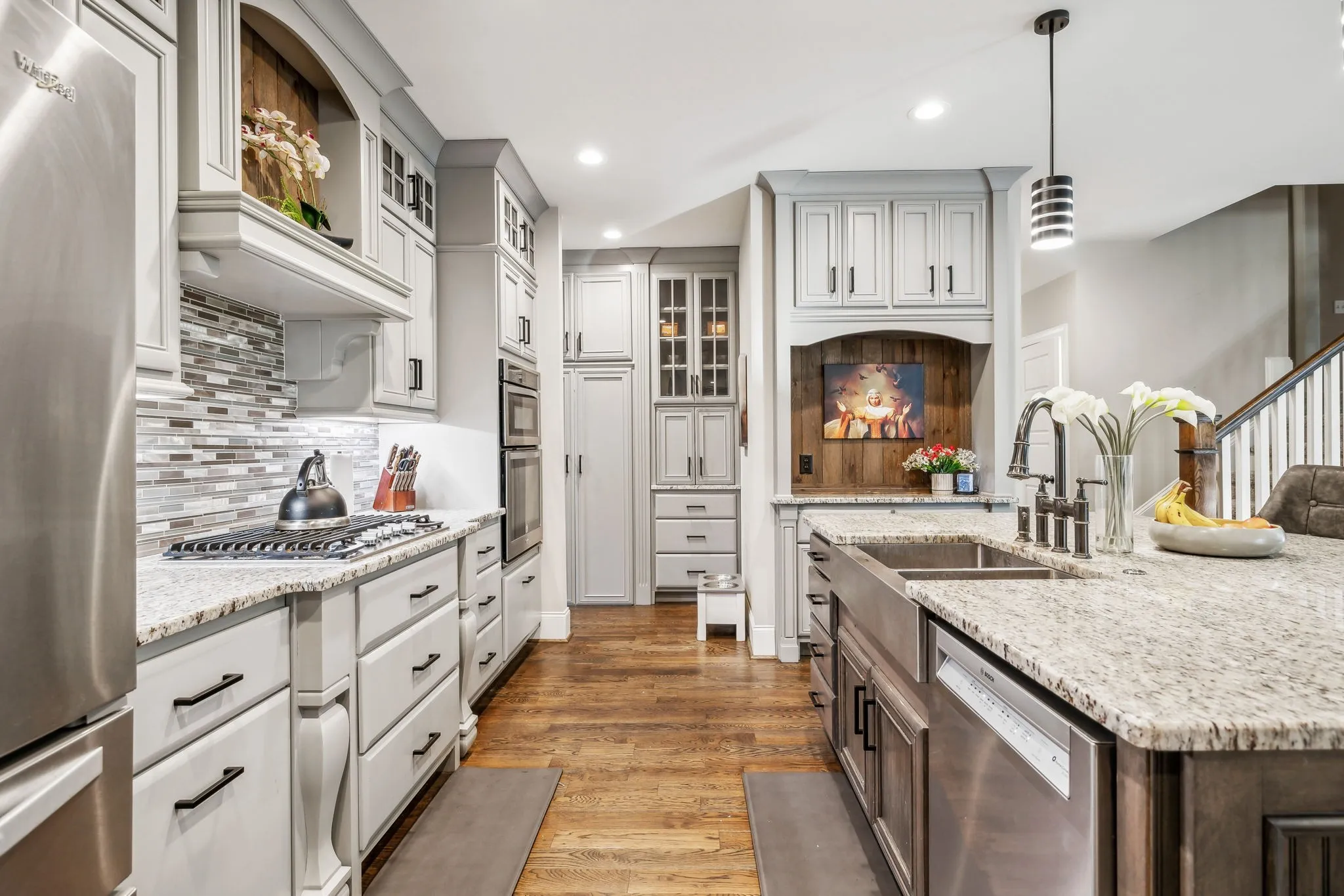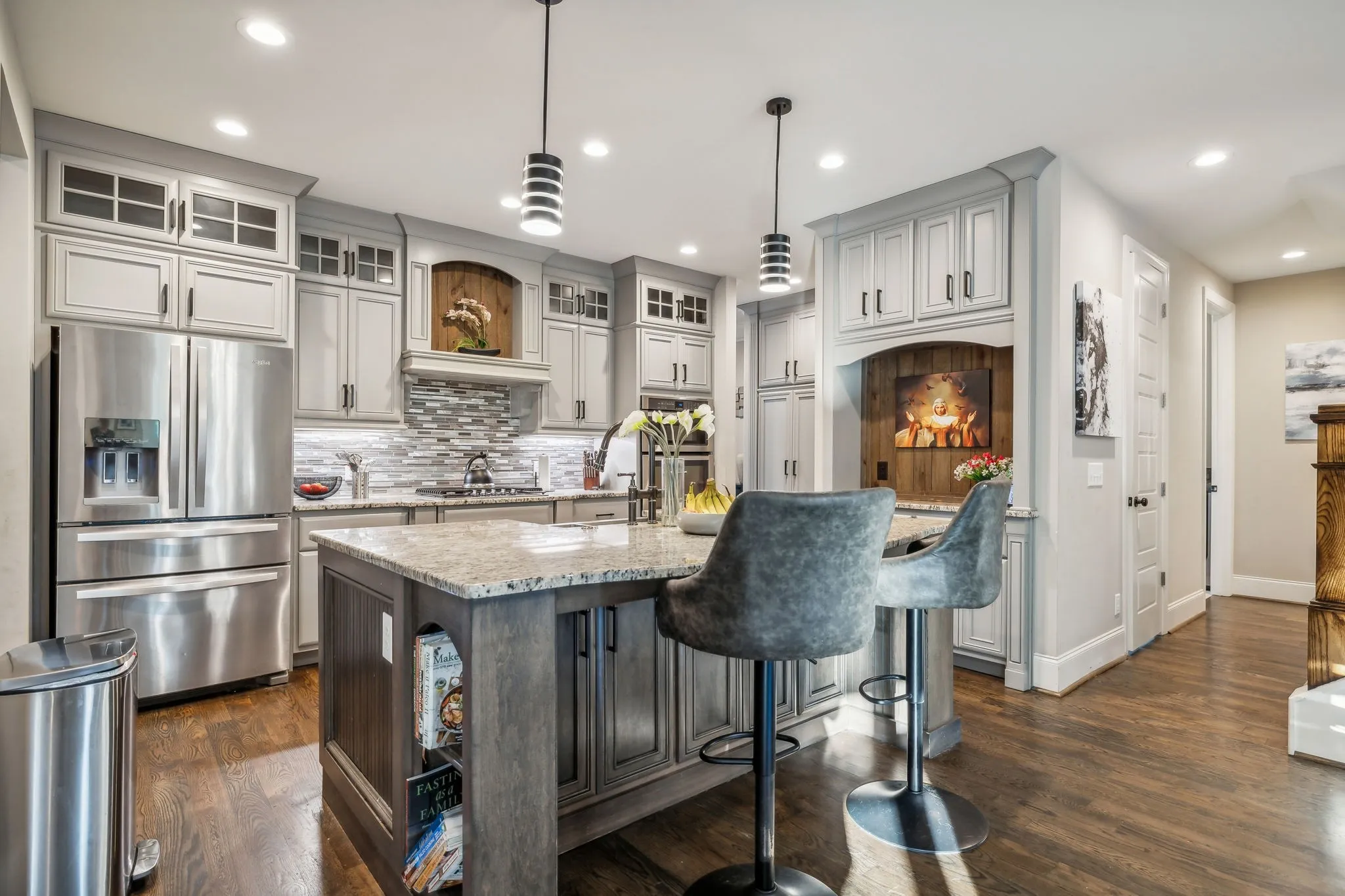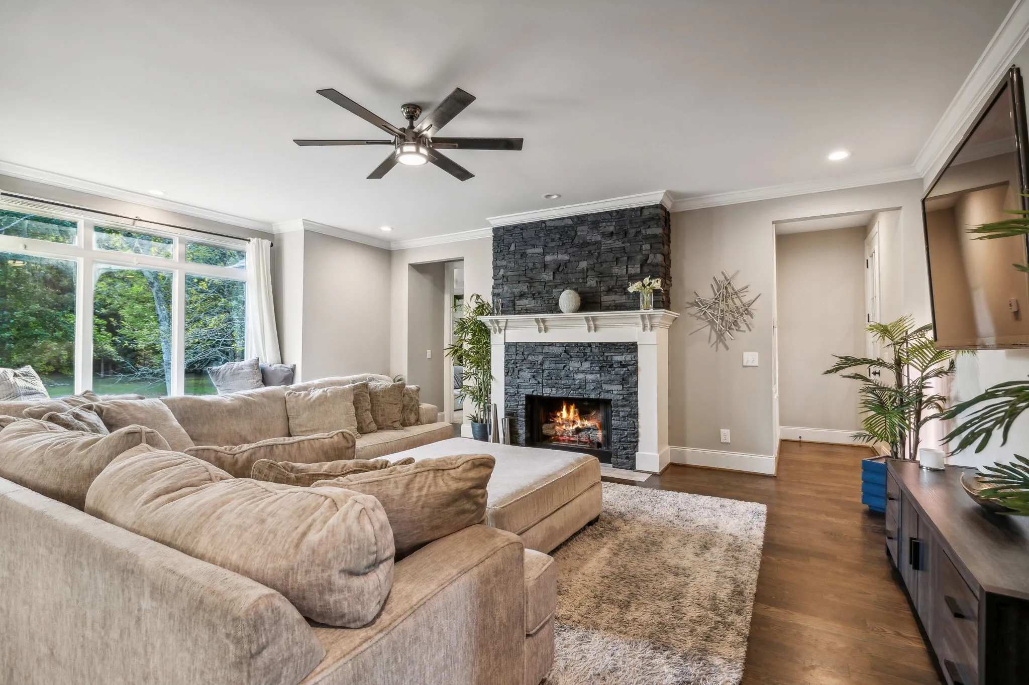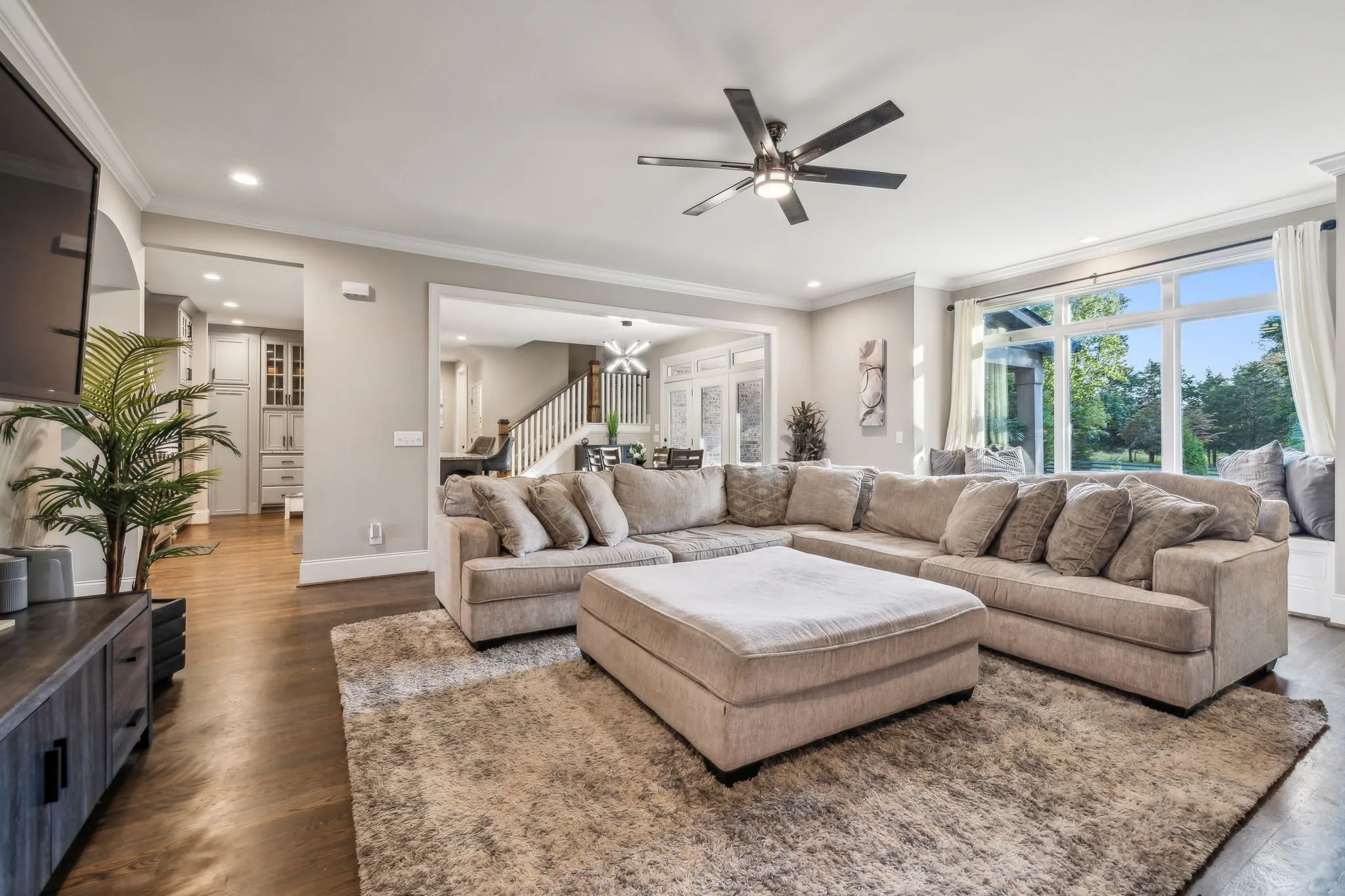 Experience luxury living in this beautiful custom home, set on 3.2 tranquil wooded acres, just -minutes from Providence. The impressive kitchen features premium cabinetry, stunning granite countertops & a spacious island with serving bar, along with a large walk-in pantry & an adjacent butler’s pantry with an extra refrigerator. The open floor plan connects to the Great room, formal dining area, and a sophisticated study. Main level primary bedroom offers a view of a picturesque waterfall and wooded backyard, with a generous walk-in closet & a spa-like bathroom featuring a lavish shower. Upstairs, discover two bedrooms each with private baths, an office, a spacious den with a wet bar, and a bonus rec room over the garage. Additional highlights include composite decking, a back-up generator, tankless water heater, water softener, outdoor lighting, gated driveway, invisible dog fence, and a security system. Convenient to Nashville and airport.