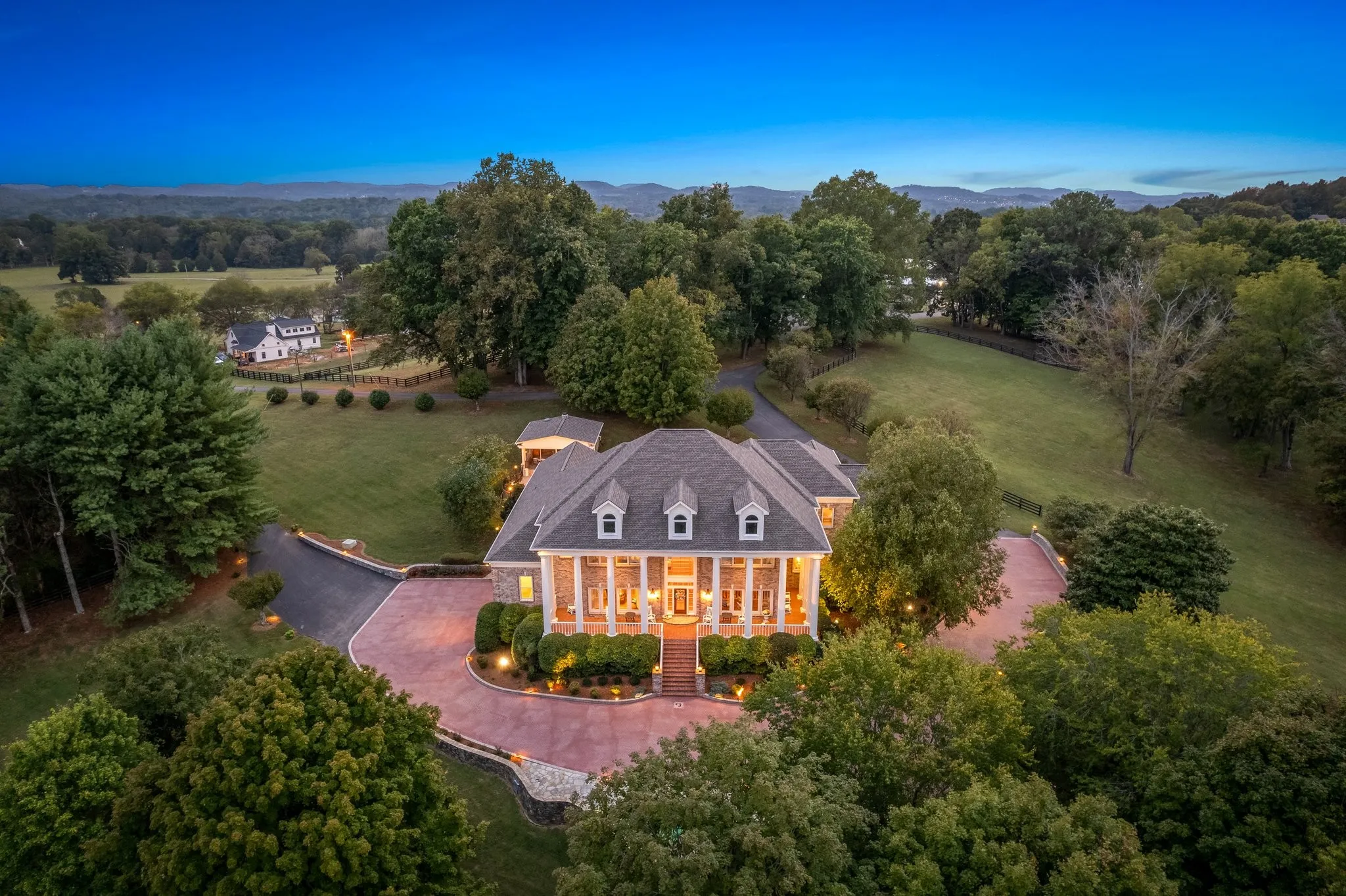 This unique estate features a 9,000+/- square foot home built by country music legend George Jones, situated on nearly 25 acres in a prime location, just 15 minutes from historic downtown Franklin and 30 minutes from downtown Nashville. The expansive home sits privately on a wooded knoll at the heart of the property, featuring 4 bedrooms and 7.5 bathrooms with a gorgeous outdoor patio, swimming pool and pool house. In addition to a guest house, farm has multiple buildings combining for several thousand square feet that could be used for a variety of purposes such as shop work, hobbies, equipment storage, office space, event hosting and livestock accommodation.
