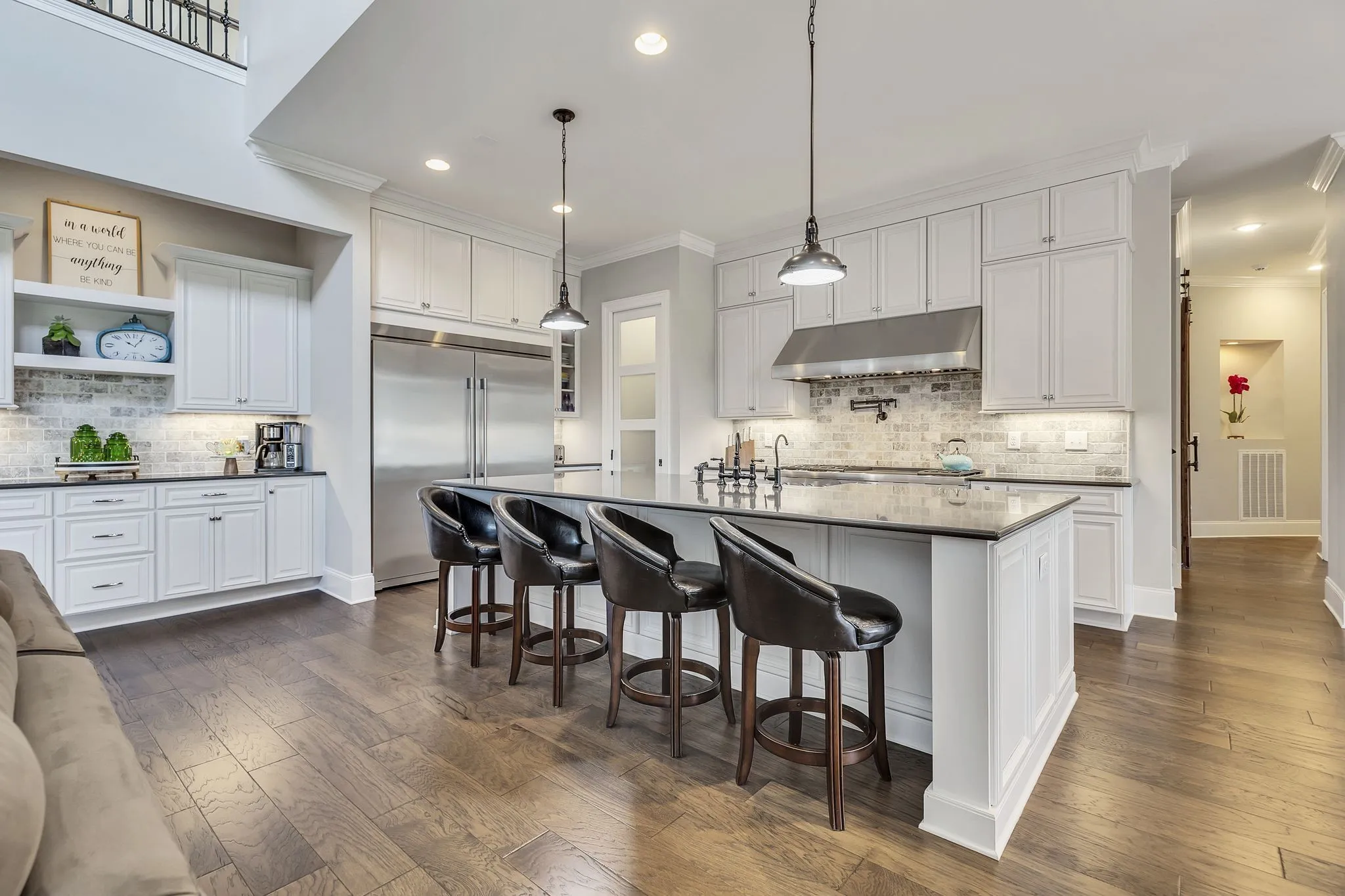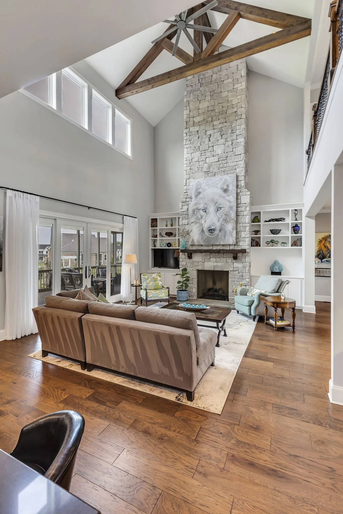 Welcome to this stunning Custom Farmhouse, perfectly nestled on a 1.07-acre level lot, fully equipped with irrigation & a fenced yard for ultimate privacy. Step inside to be greeted by soaring ceilings adorned with exposed wood beams that beautifully frame the space. The heart of the home is the breathtaking two-story stacked stone fireplace, flanked by built-in bookcases, creating a cozy yet grand focal point in the living area. Bathed in natural light, this home features a dedicated study complete with a wet bar, ideal for working from home or enjoying a quiet evening cocktail. Two spacious ensuite bedrooms are conveniently located on the main floor, including the luxurious owner’s suite, which boasts a spa-like bath & a custom walk-in closet designed to impress. Prepare to be amazed by one of the largest kitchens you’ve ever seen, overflowing with cabinet & counter space & fitted with top-end appliances, making it a chef’s dream. Perfect home for extended family stays or a parent!