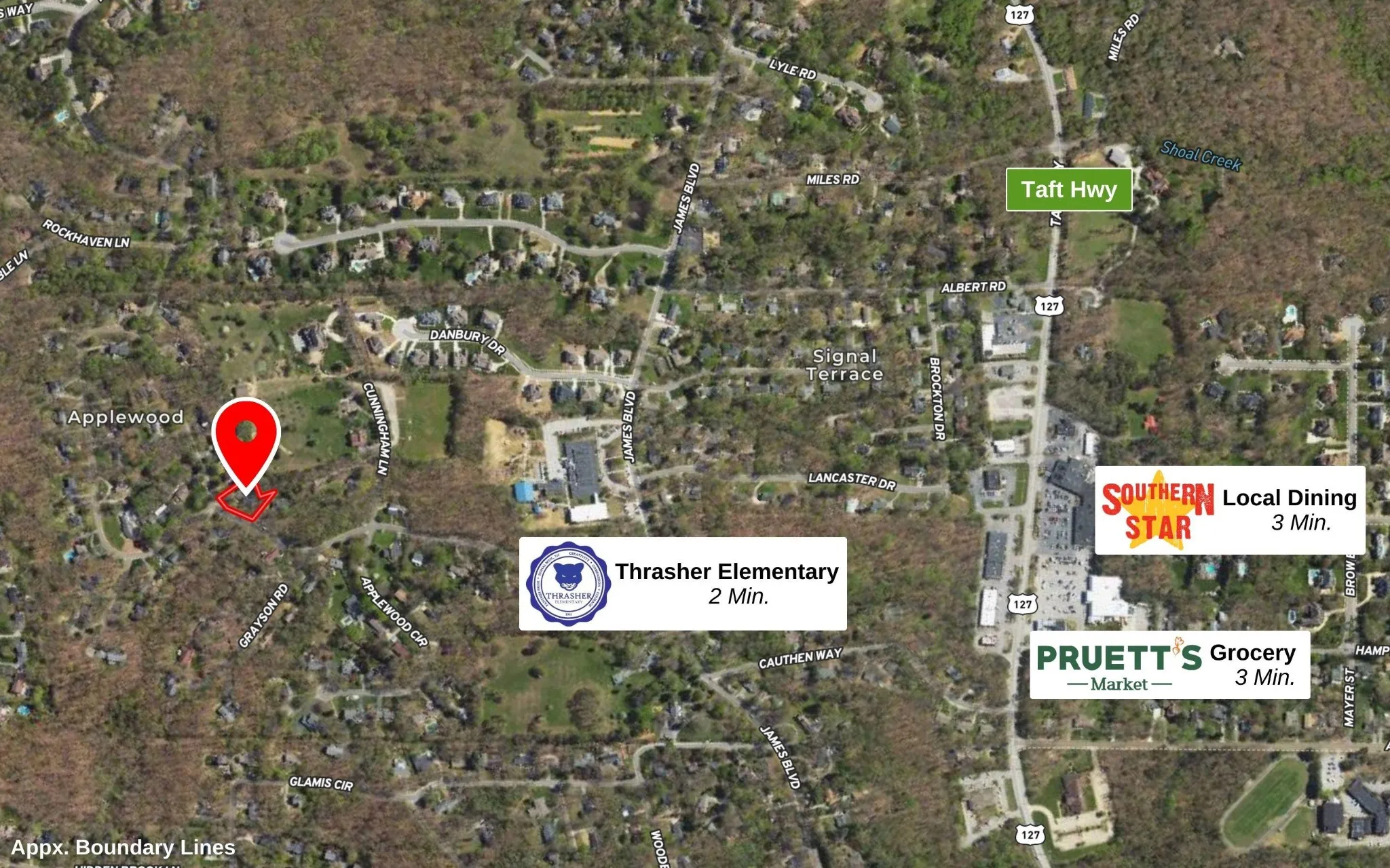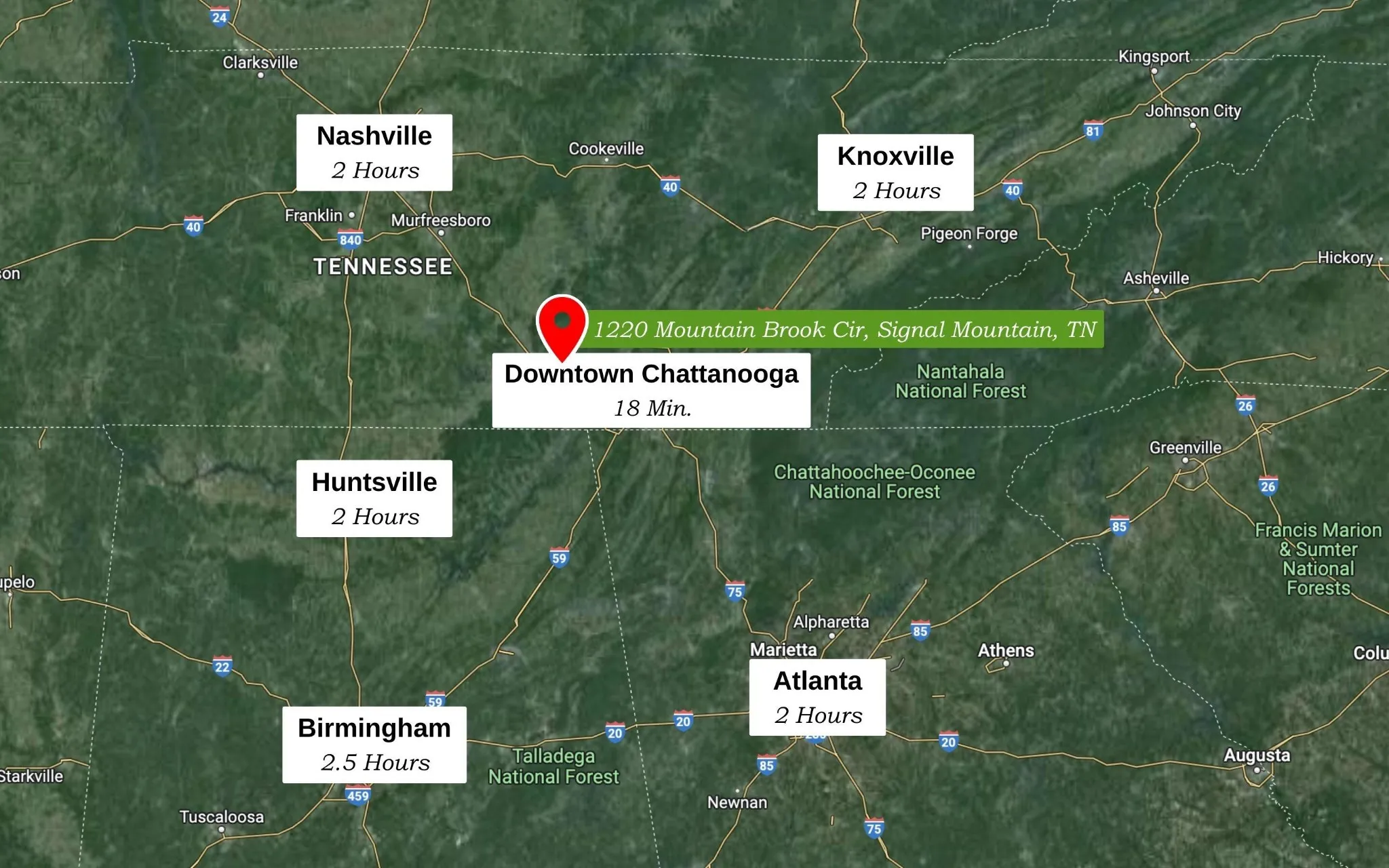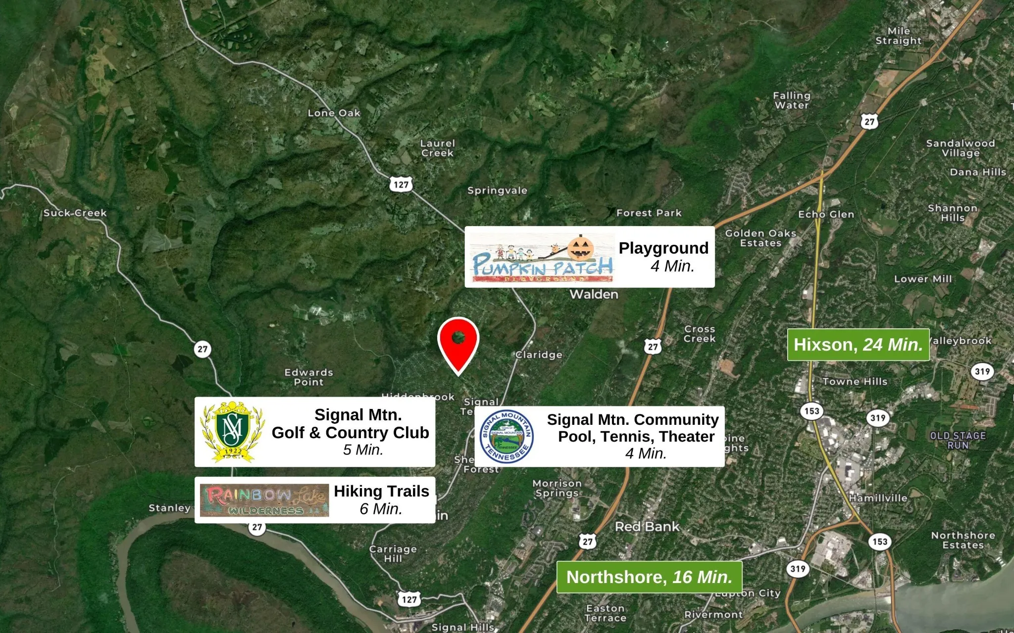 +"Directions": "From Downtown Chattanooga: Take US 27 N. Exit toward Signal Mountain. Take US 127 N up the mountain. Left on Cauthen Way. Right on James Blvd. Left on Grayson Rd. Keep right onto Mountain Brook Circle. Property is on the right."