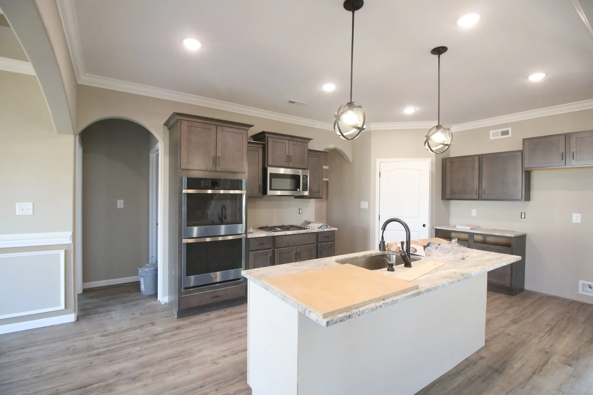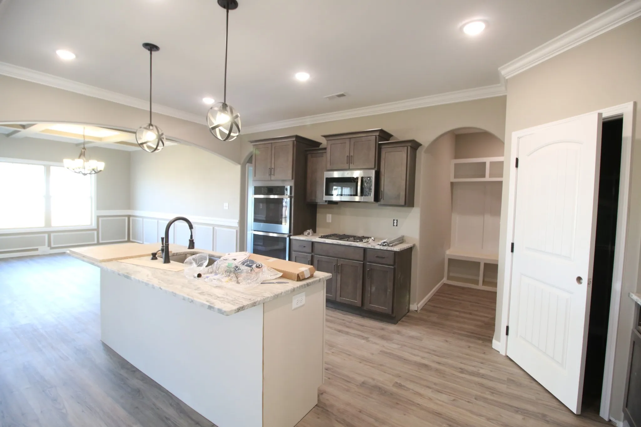 3 Car Garage & 6 Bedrooms!!! Spacious Entry Foyer w/ Wood Flooring! Large Living Rm w/ a Natural Gas Stone FP & Floating Mantle! Open Kitchen Features a Huge Island w/ a Bar-top, Double Oven, Gas Cooktop, Granite Tops, Huge Walk-in Pantry w/ a Decorative Door & Lots of Cabinet Space! Spacious Formal Dining Rm w/ Wainscoting & a Coffered Ceiling! Primary Suite on Main Level & Features a Double Tray Ceiling, LG Tile Shower w/ a Bench & Glass Window, Soaking Tub, Double Vanity w/ Cosmetic Counter, Huge Walk-in Closet, Linen Closet & a Toilet Closet! Spacious Guest Room Downstairs w/ a WIC & Full Bathroom Across the Hall! Large Laundry Rm w/ a Laundry Chute! Mud Rm Off the Garage w/ a LG Hall-tree! Upstairs Features 4 Large Guest Rooms ALL w/ Walk-in Closets, 2 Full Bathrooms BOTH w/ Double Vanities, Lots of Attic Storage & a Laundry Chute! SPC Wood Flooring Throughout Main Areas, Tile in all Wet Areas, Crown Molding, Custom Trim, TWO Hot Water Heaters & a Large Covered Patio! Corner Lot!