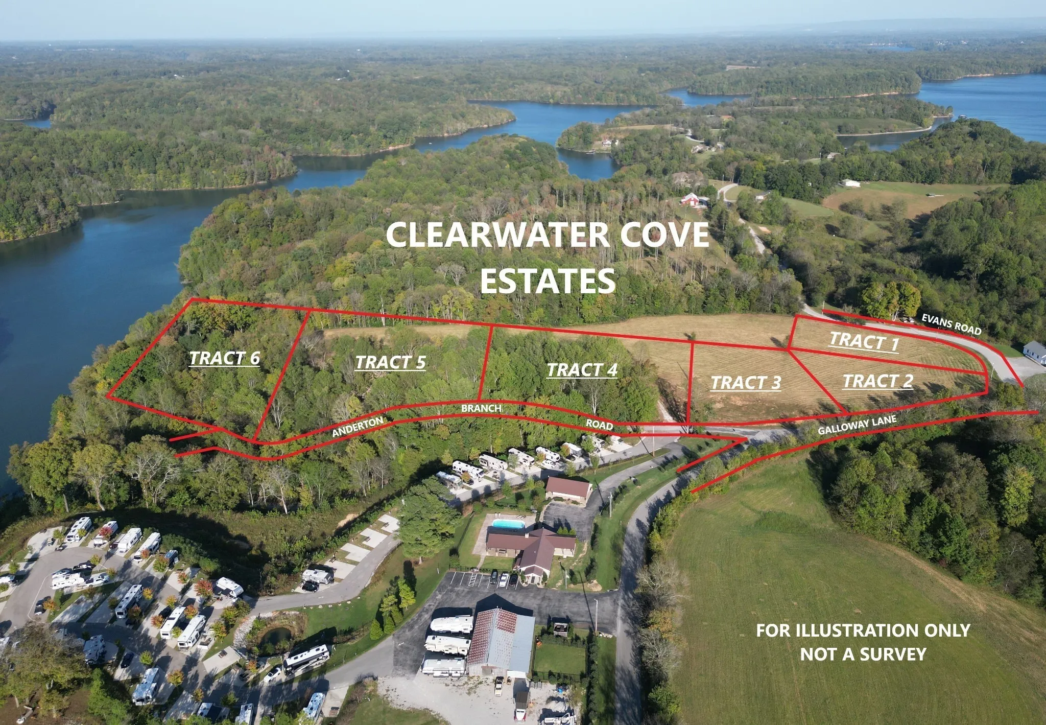 FOR SALE AT AUCTION Saturday, November 23rd @ 10am. Clearwater Cove Estates. 6 residential buildings lots (***1 Lakefront***) with approved with approved soils for septic systems. Lot 4 = 2.132 Acres. 353′ frontage on Anderdon Branch Rd. Approved for 4BR septic system. City water/Power at road. *IDEAL FOR BARNDOMINIUMS OR SHOP HOUSES* Some restrictions. Live onsite auction with online bidding available. 10% down day of sale, balance on or before Dec. 31st.