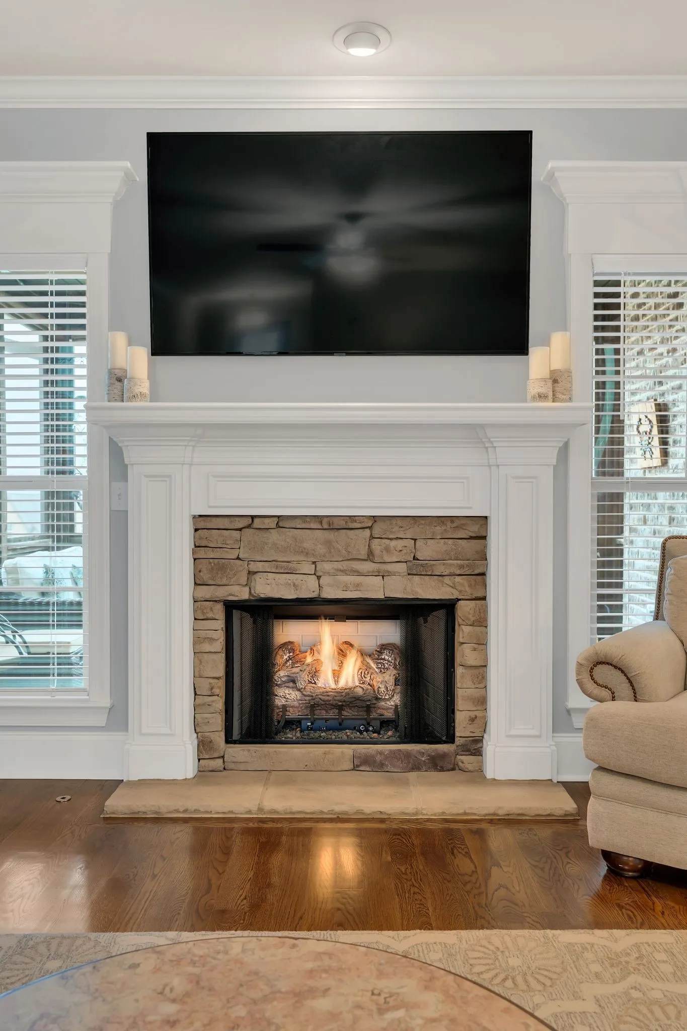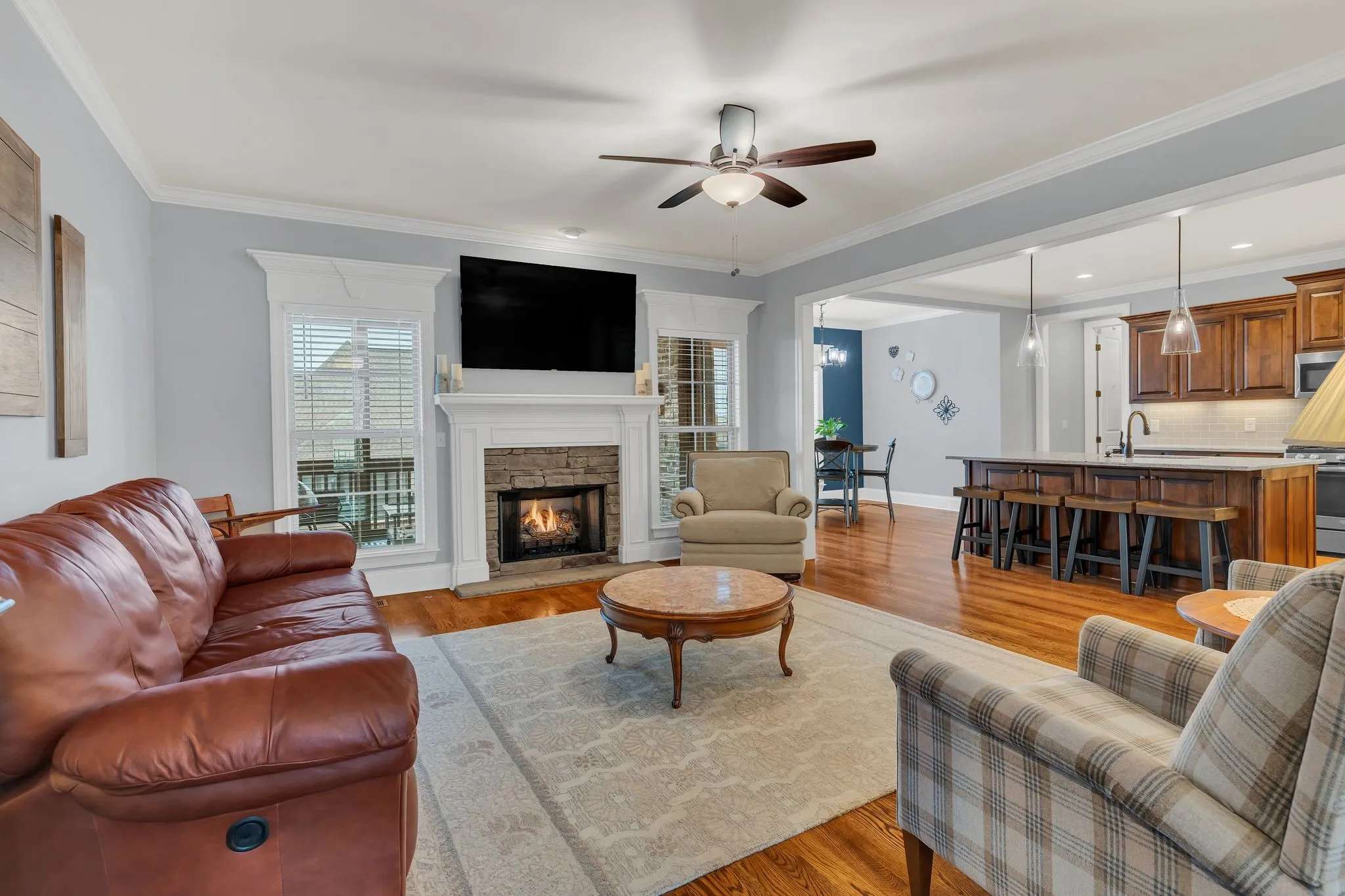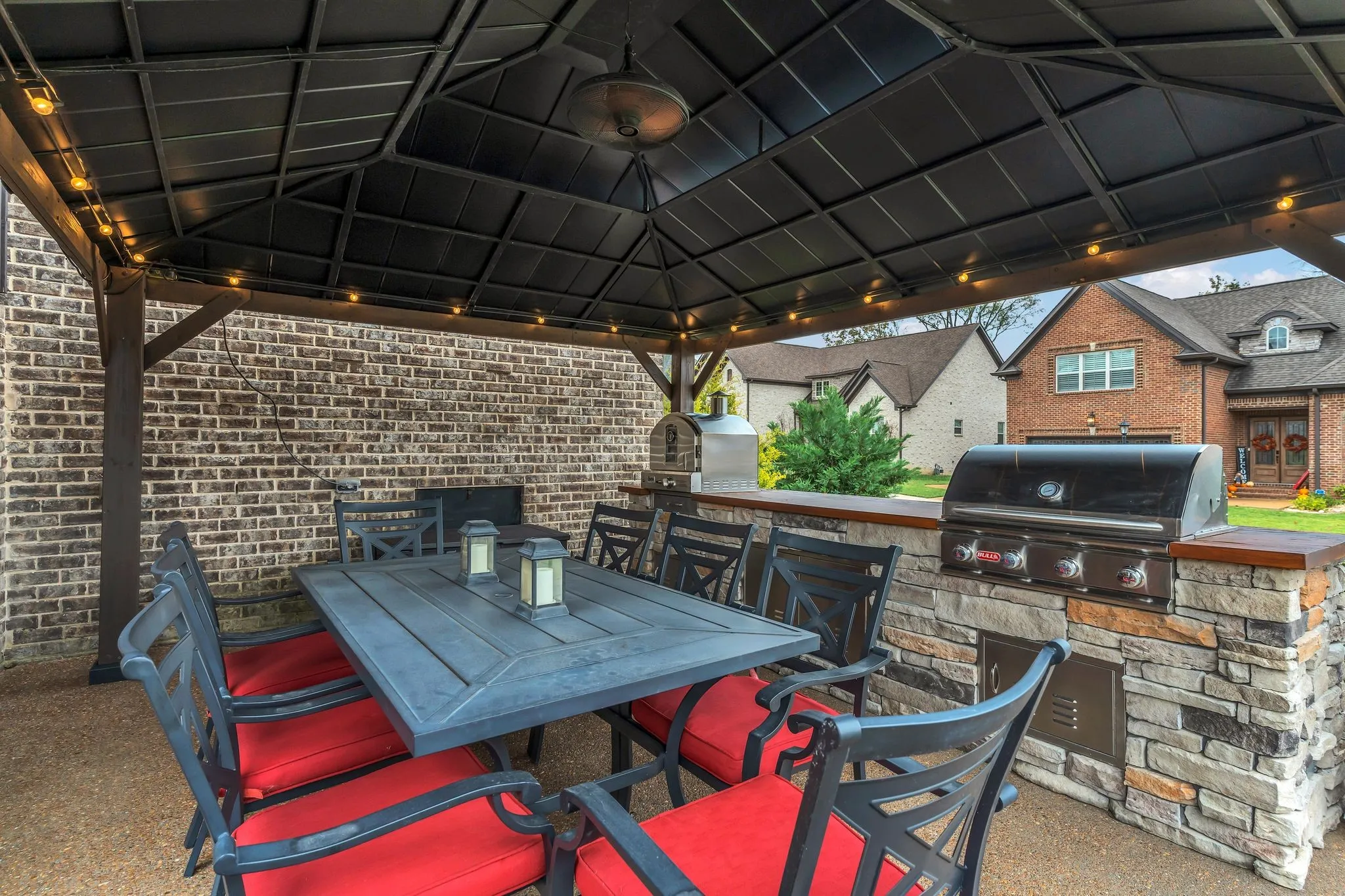 Better than new construction! This all-brick & stone home was built by Universal Builders. This home has been well cared for: the owners are non-smokers and do not have pets. Freshly painted living areas. This spacious 4-bedroom, 31/2-bath home is in the highly desired Stonehollow neighborhood. The living room has a gas fireplace & opens to the kitchen. Hardwood floors in the foyer, hallway, living room, kitchen, & dining room. Features include outdoor living space, a screened porch, an outdoor kitchen with a gas grill, & a pizza oven under a beautiful gazebo on an extended patio. The kitchen has granite countertops, extra under-cabinet storage in the island, & extra room in the kitchen pantry for snacks & small appliances. The dining area showcases wainscoting trim with a coffered ceiling and flows into the kitchen. Walk-in attic with over 300 square feet of floored attic space. Walking distance to school.