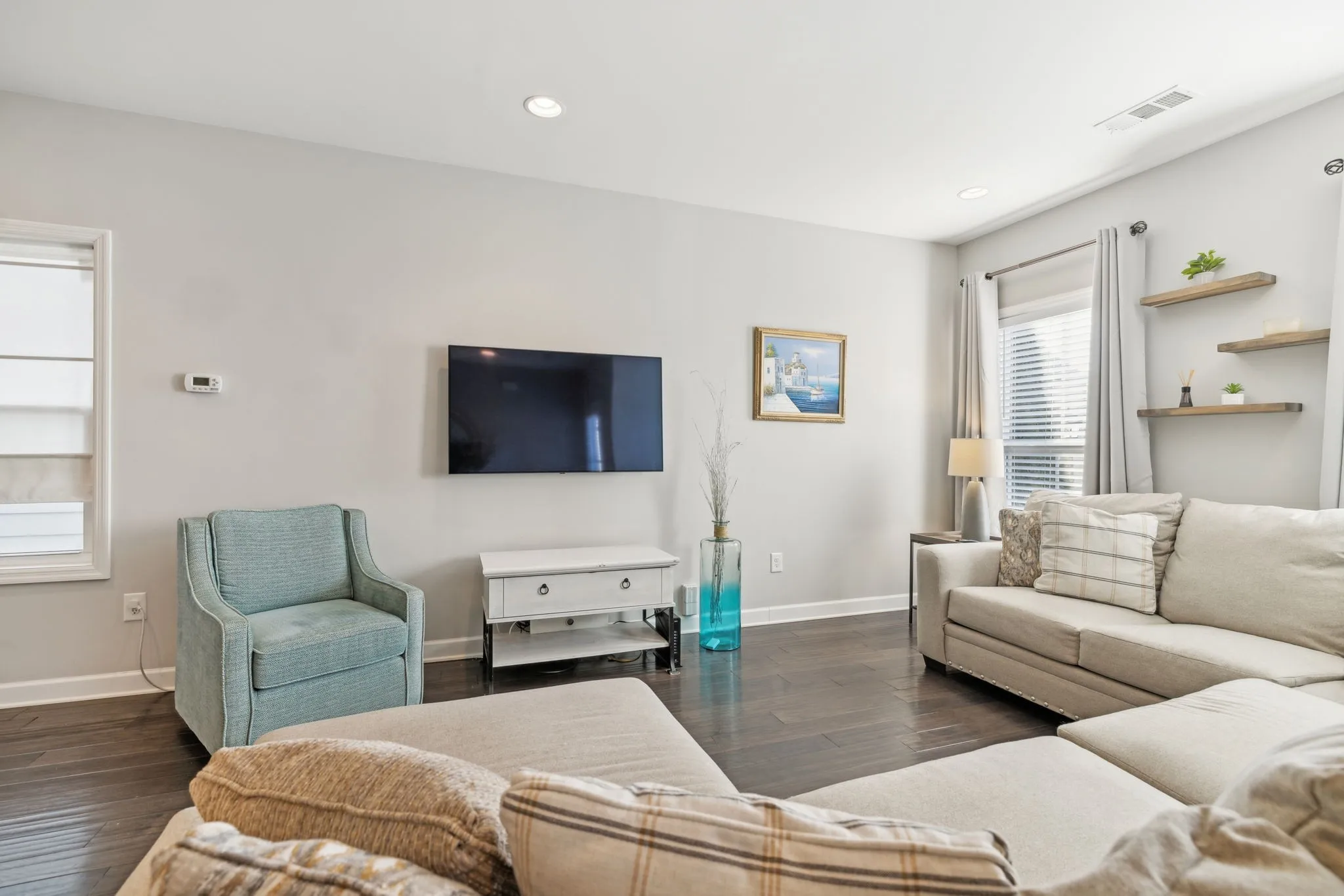 Beautiful and bright living space as you enter with hardwood floors throughout home. Spacious kitchen with large island with granite tops, tile backsplash, under cabinet lights. All appliance remain including washer and dryer. GARAGE w/ storage!!! Laundry is conveniently located upstairs next to the primary bedroom. Large primary en suite w/lg walk in shower and dbl vanities. Second bed with private bath. Flex space up with built in bookcase. Located min to grocery and all Bellevue has to offer including Percy Warner Park. HOA includes lawn, irrigation and trash.