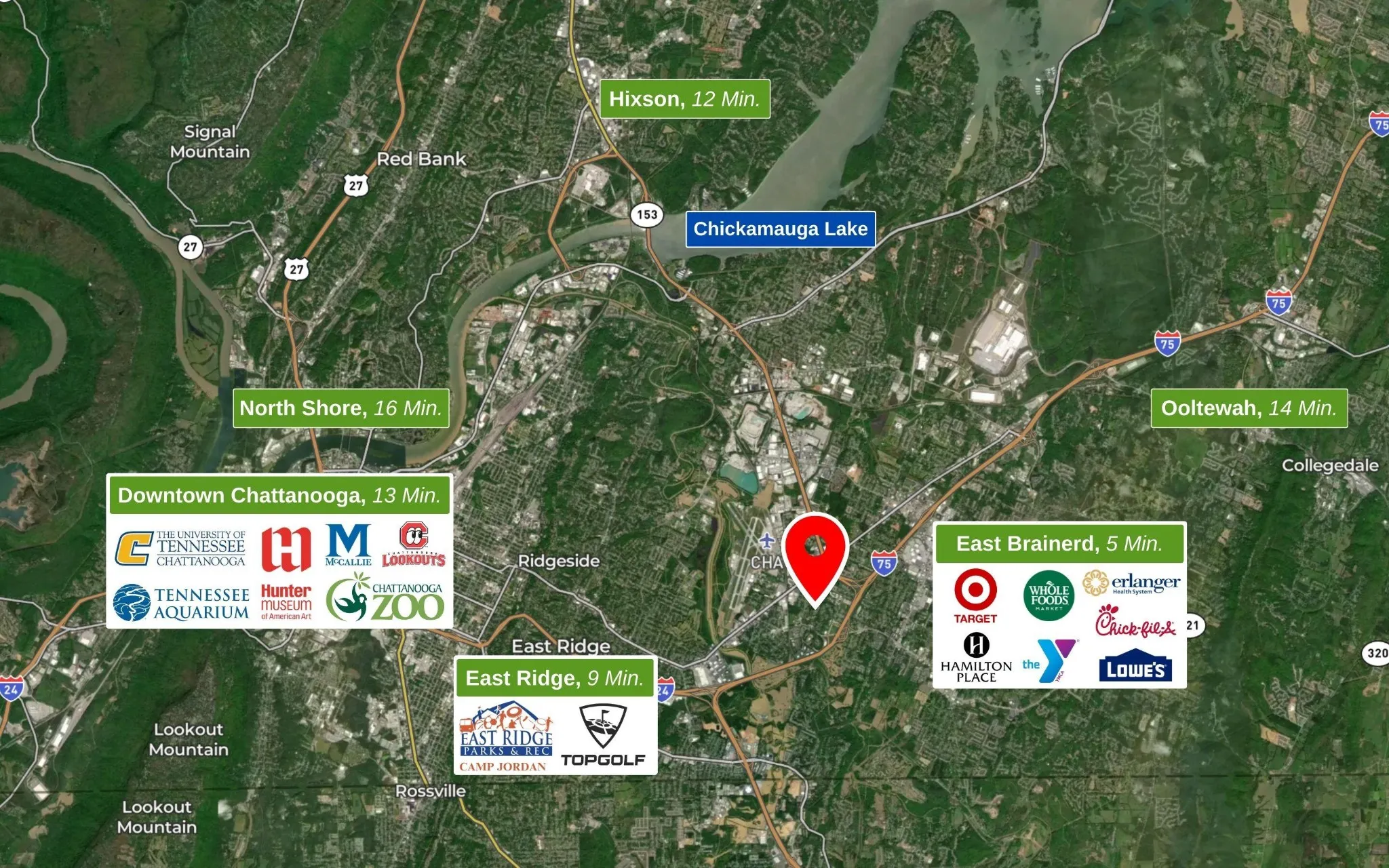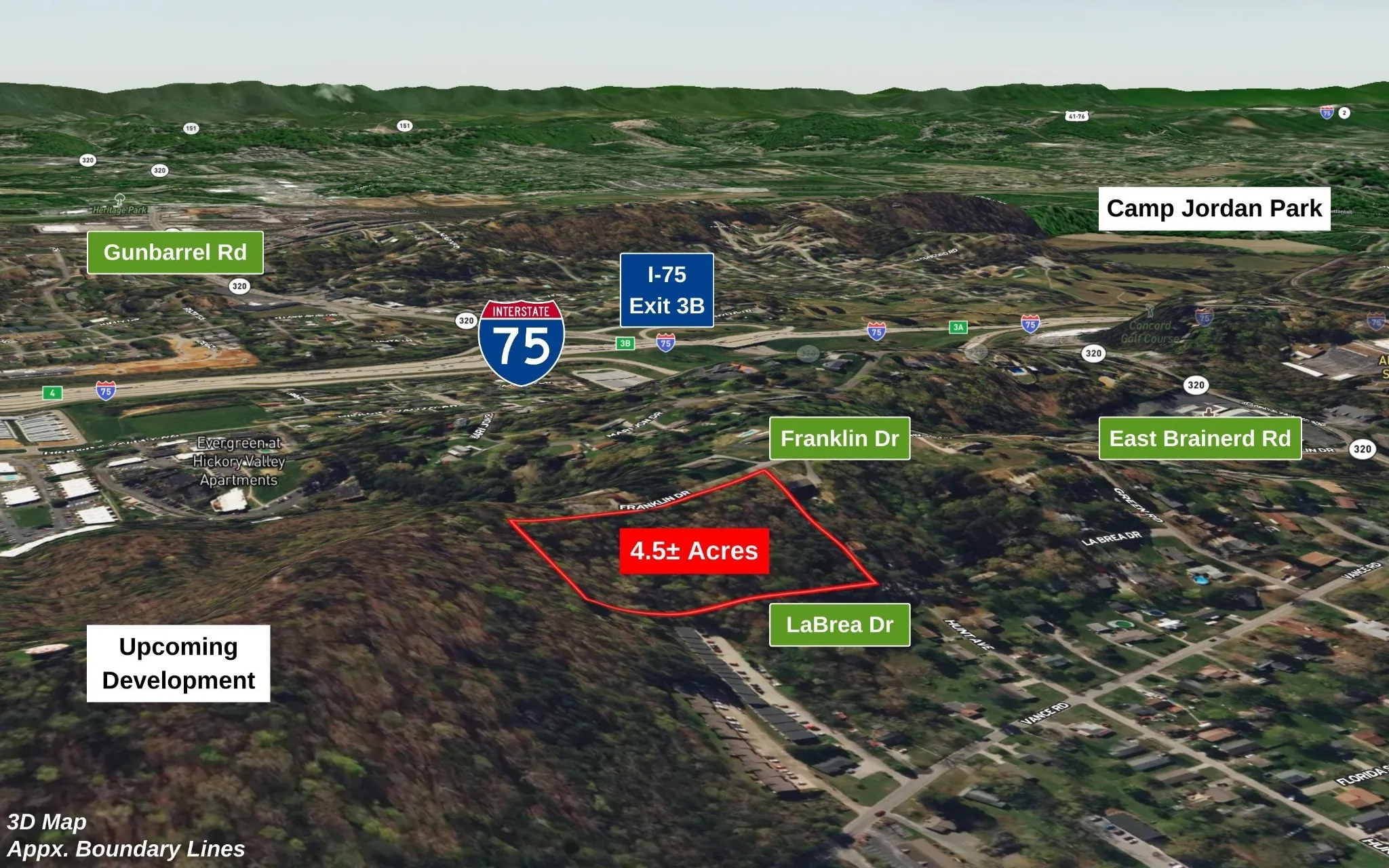 - Directions: From Downtown Chattanooga: Take I-24 East. Exit 185B onto I-75 North. Exit 3B onto SR-320 West, East Brainerd Rd. R on Vance. R on Green Dr. L on LaBrea Dr. Property on the right at end of road. Also accessible on Franklin Drive.