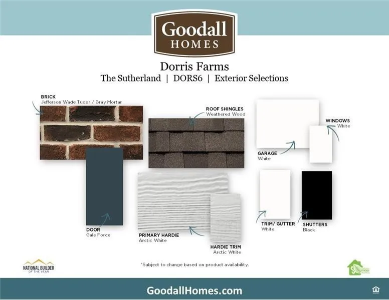 +"PublicRemarks": "The Brand-New Sutherland floorplan MUST SEE HOME! 4 Bedrooms 3 Baths Owners Suite on the 1st floor. Large Loft on 2nd floor, Covered Rear Patio, Hardwood Stairs, Separate Tub and Shower in Owners Bath! Located on a premium homesite with lots of upgraded options! We offer a 1-, 2- & 10-year warranty. Estimated completion in November. Dorris Farm is our newest Goodall community in White House. Come out to learn more about our first homes in Dorris Farm and ask about our !!Incentive Of $6,500 Towards Closing Cost!!! when working with preferred lender and title."