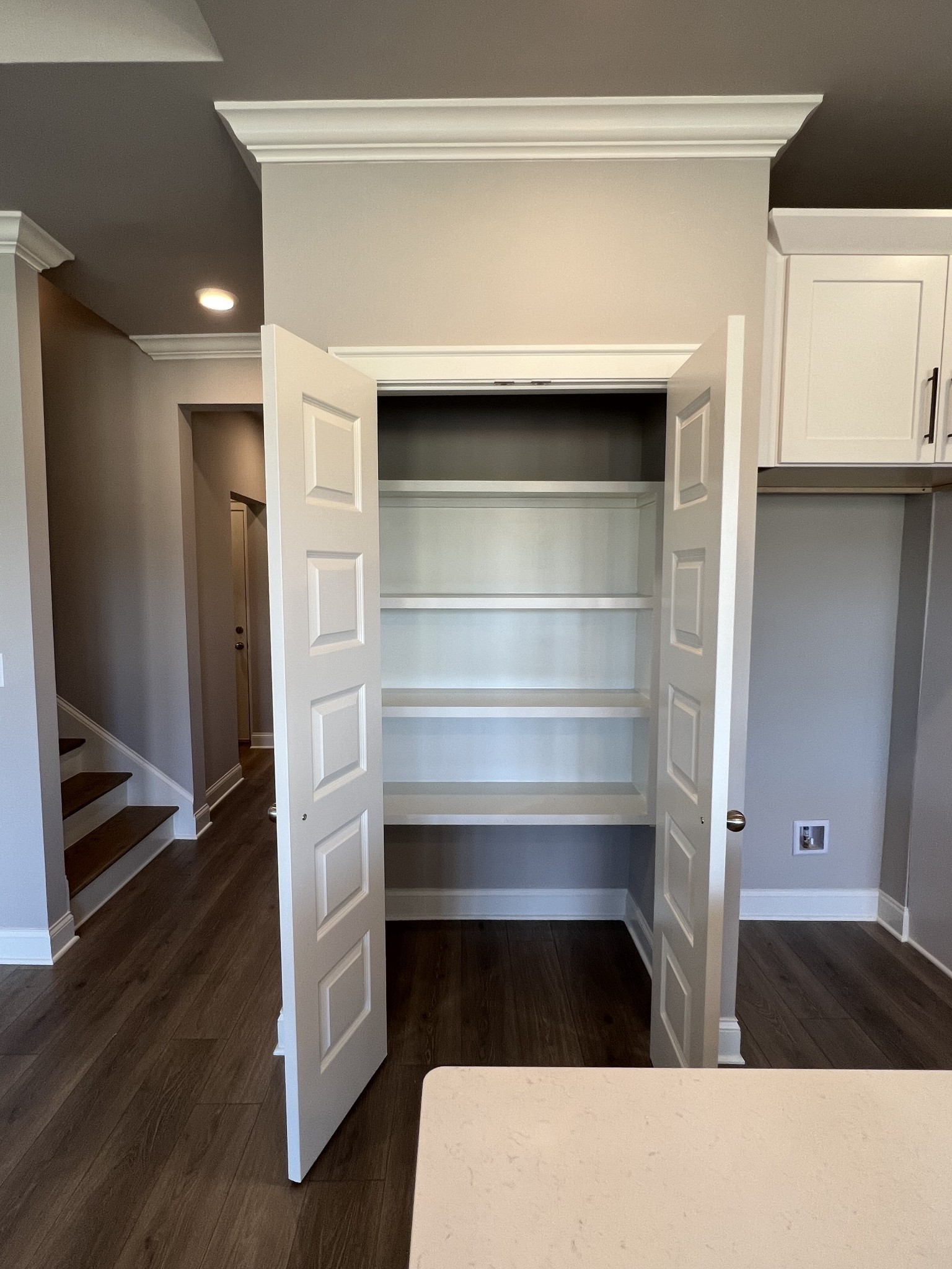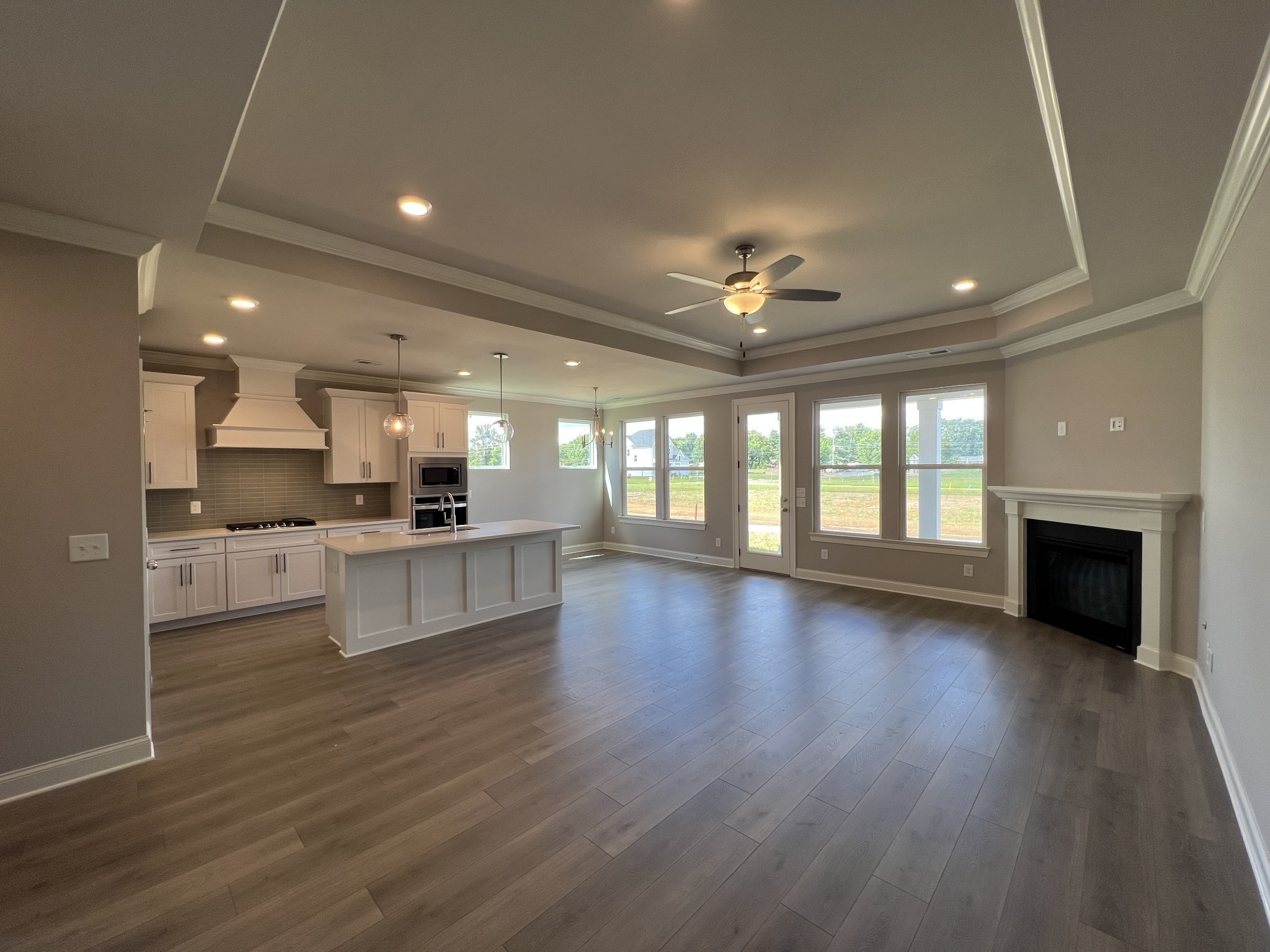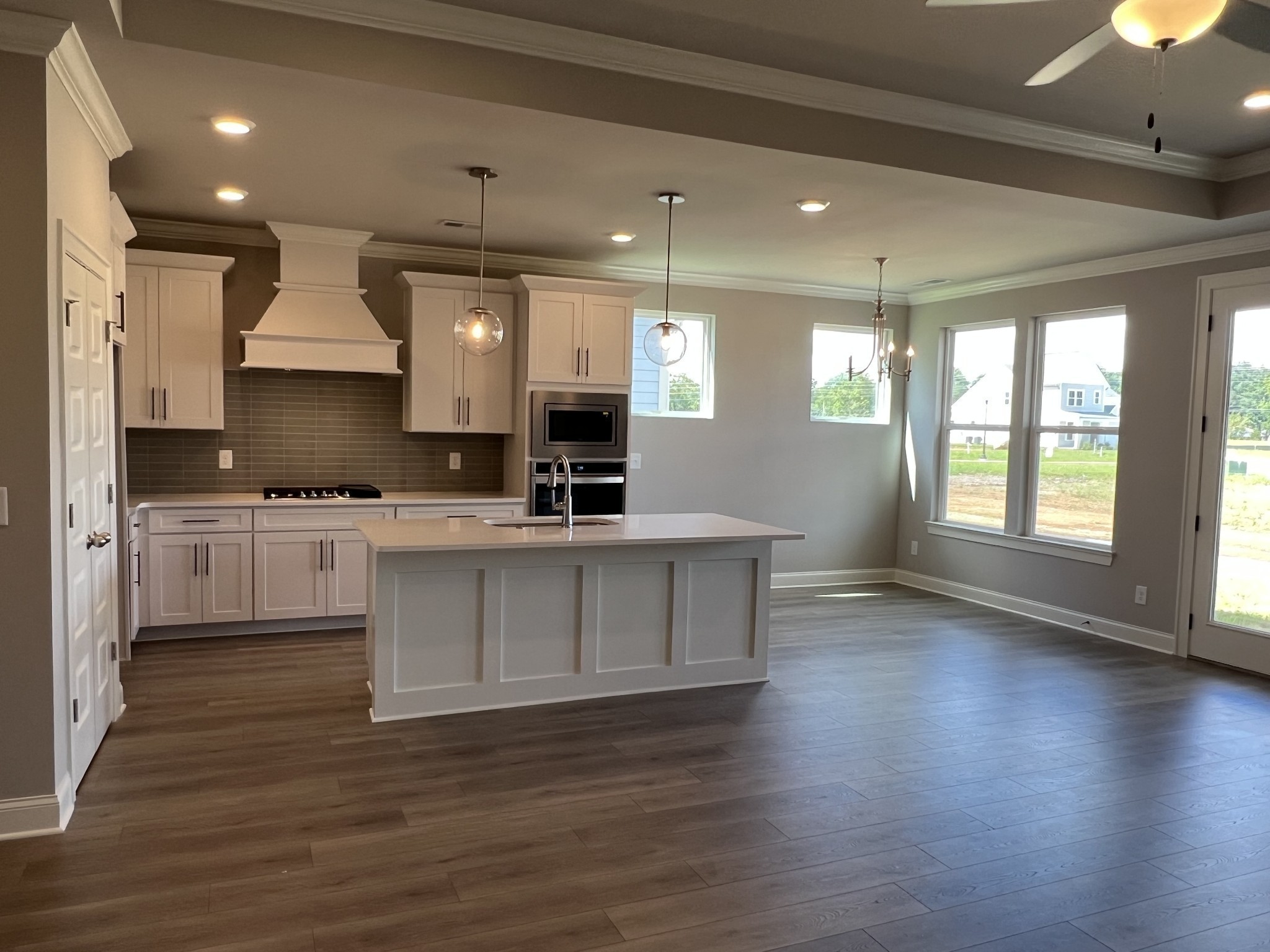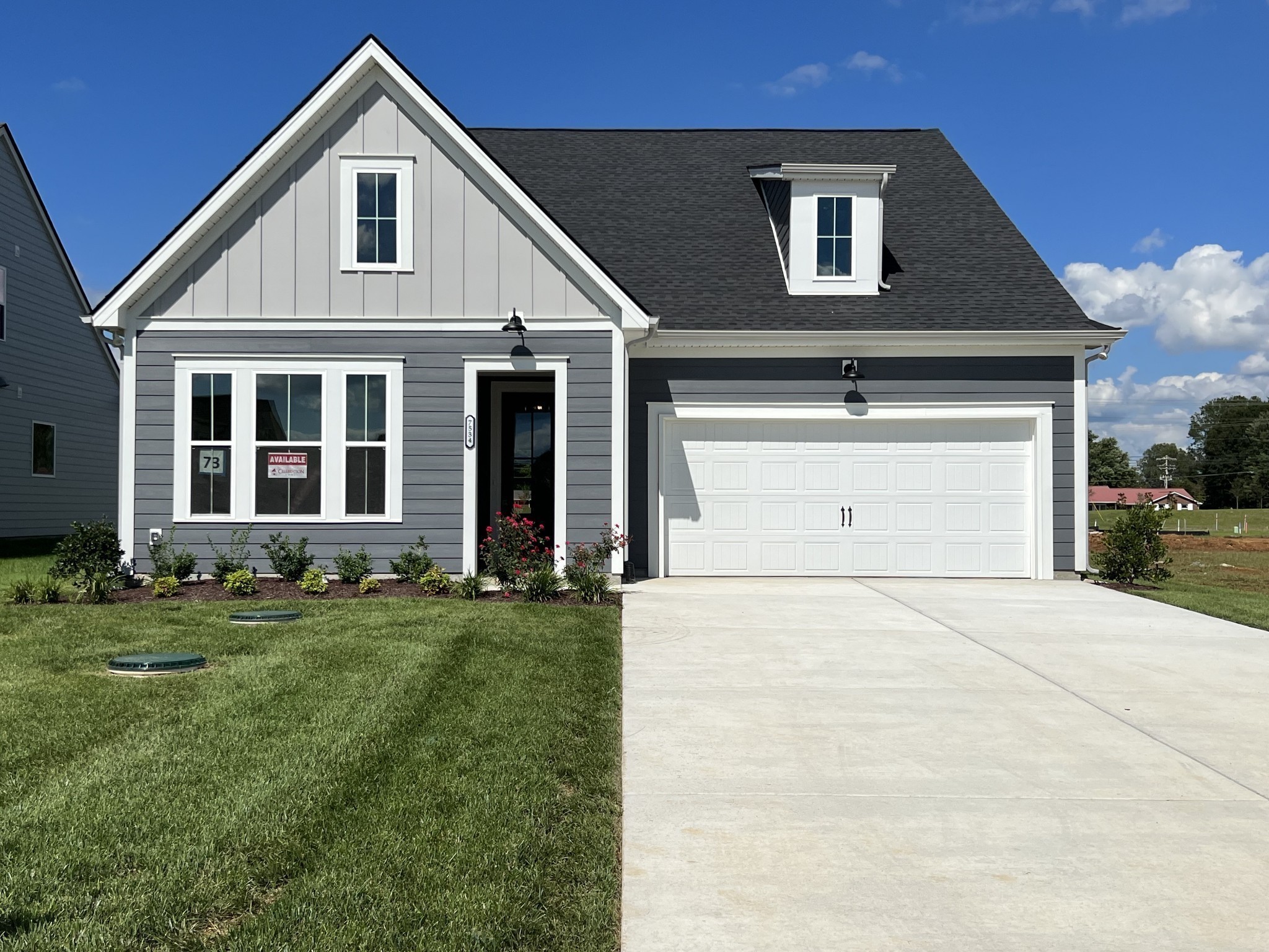 Move-in Ready! Celebration Homes Designer one story with bonus room upstairs. 3 bedrooms on first floor with a study/flex room, 2 baths, 8′ exterior doors, doorbell camera, soft close cabinetry, trim built pantry shelving, bench with hooks drop station, painted garage, EV wiring, decorative carriage garage doors, open kitchen with island, chimney hood over cooktop, trash drawer in island, wall oven, wall microwave, gas cooktop. Great room has tray ceiling and fireplace included. This home includes a covered back patio.