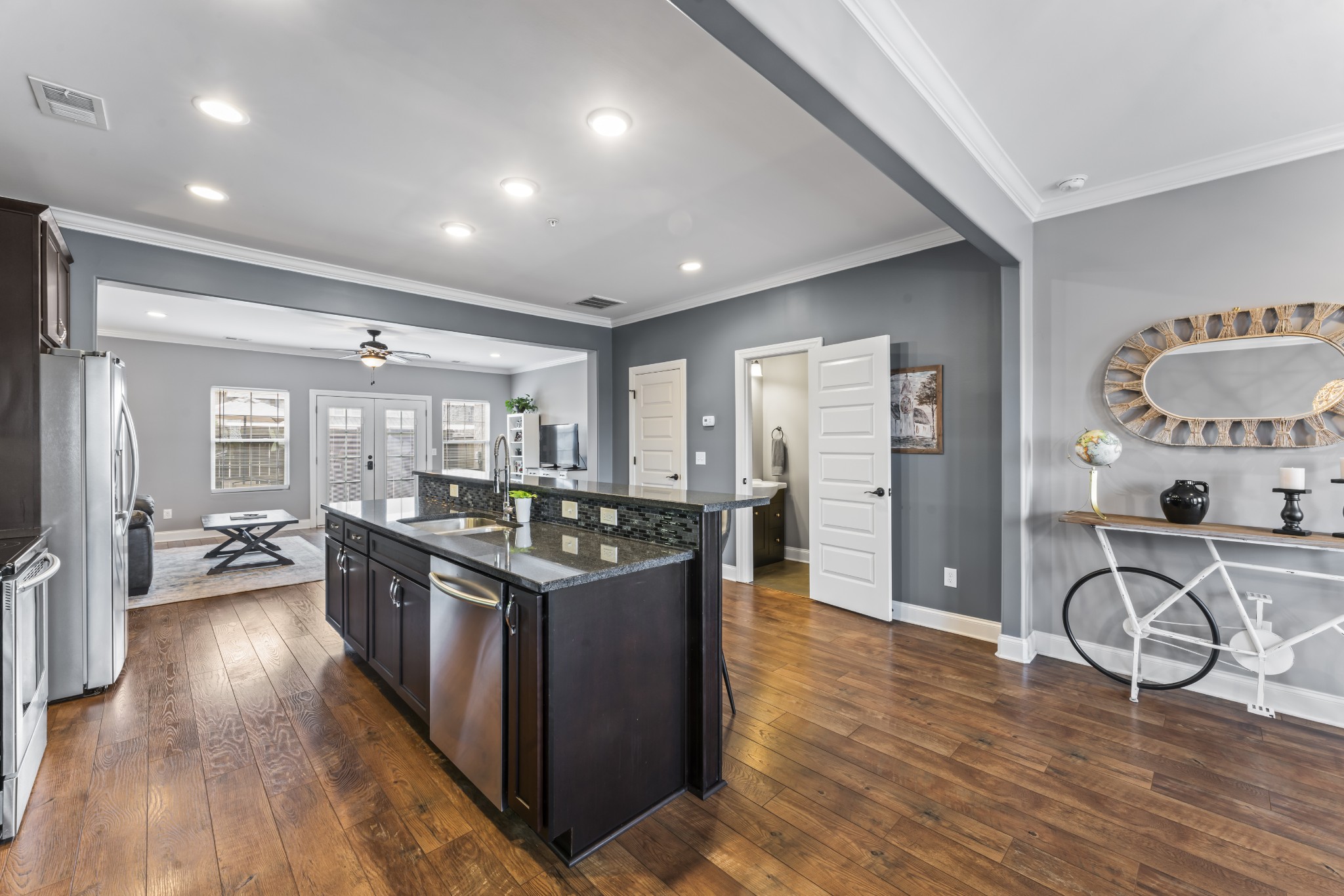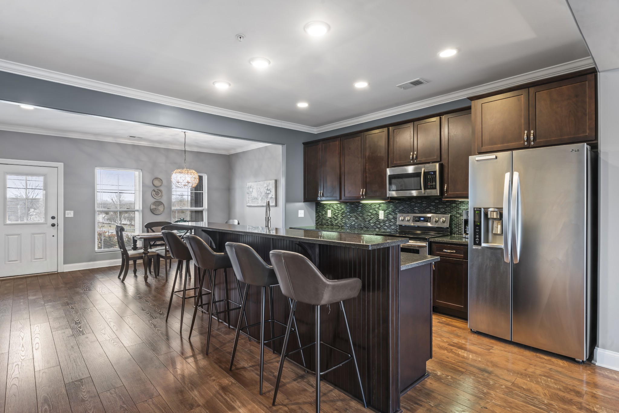 Rare opportunity for the perfect townhome in this gated community. Open floor plan, granite counters, hardwood throughout the main floor. Tile backsplash & stainless steel appliances in kitchen with extra seating at the island bar. Private patio includes extra storage.