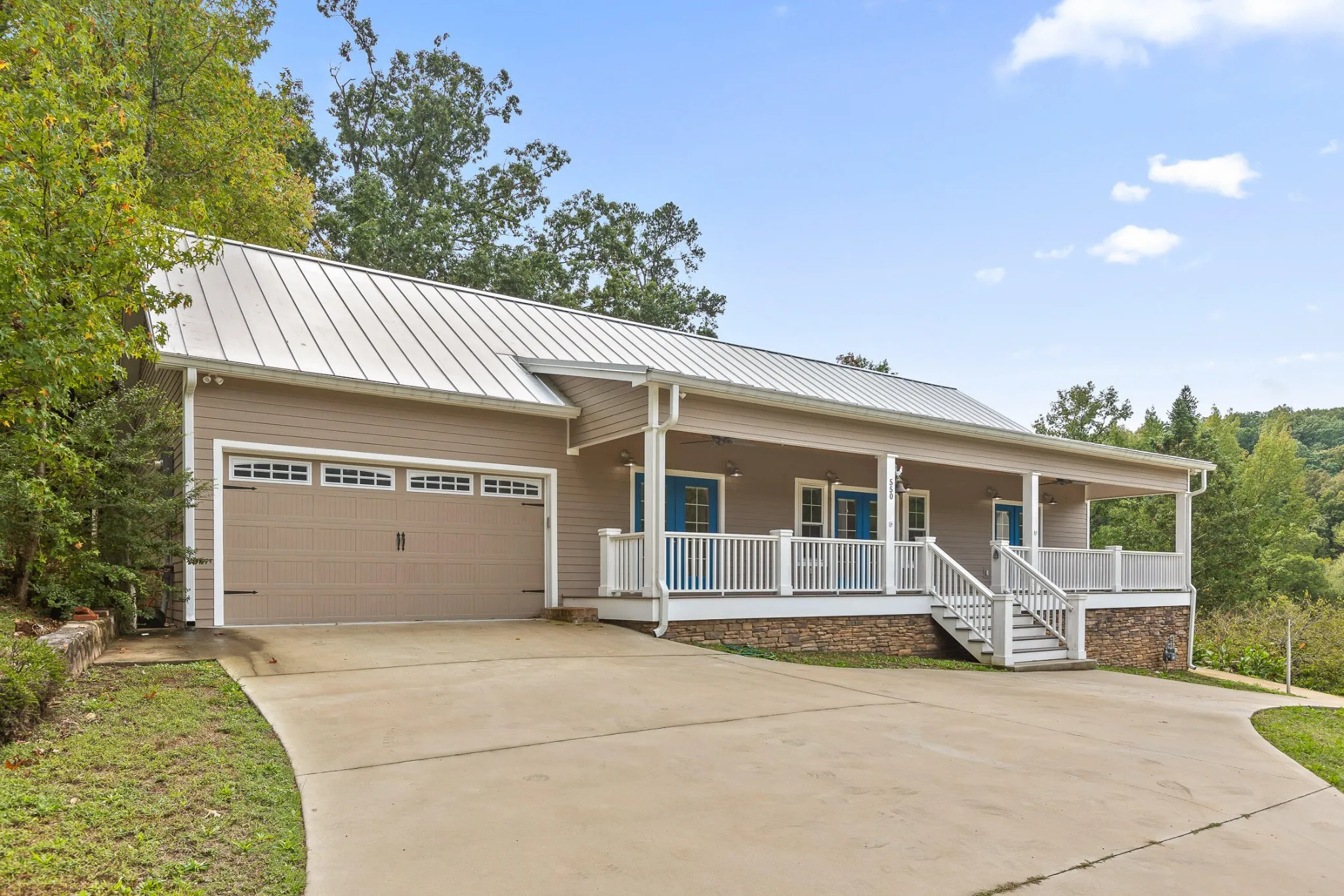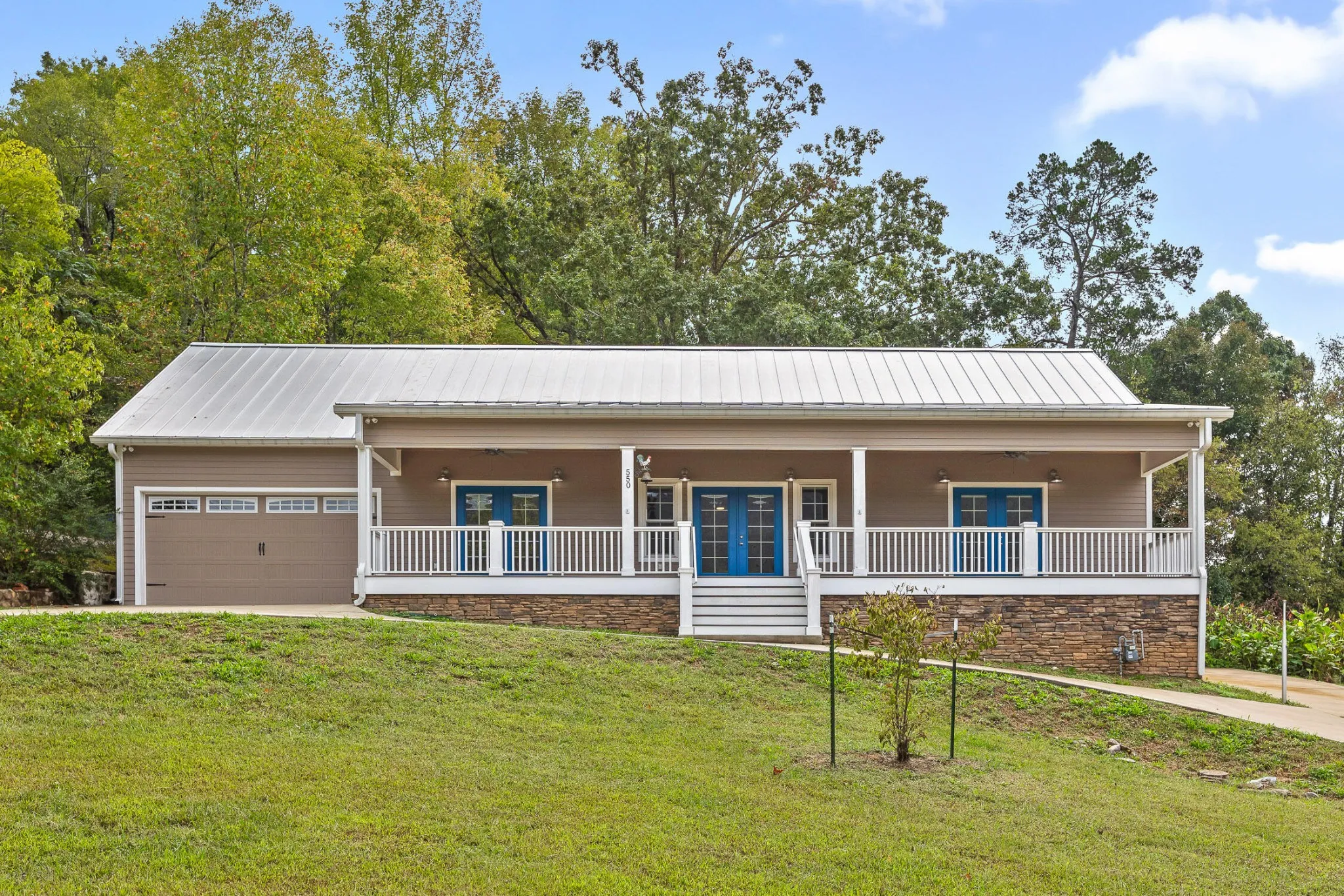 This charming custom built two-bedroom, two bath home, built in 2021, is situated on nearly an acre of land in Red Bank. 550 Tall Timber Trail, offers modern living with a touch of tranquility. The open-concept design features a spacious floor plan with living area, dining and kitchen. All filled with natural light. A contemporary kitchen with custom cabinets, stainless steel appliances, quartz countertops and a walk in pantry that you dream about. The primary bedroom offers comfort, privacy, space and access to the front porch. The second bedroom provides ample space and loads of flexibility for guests. Both of the bathrooms are spacious with each offering a walk in tub. A flex space that joins with the guest bath offers a built in murphy bed allowing for additional guest space or home office. Enjoy the expansive outdoor space with plenty of room for gardening, entertaining, or simply relaxing. The home offers a large covered front porch perfect for rocking chairs and views of Signal Mountain and the back screen porch is the perfect place to enjoy dinner outside. All of this complete with a detached garage perfect for additional storage or all your hobbies! This move-in ready home combines convenience with peaceful surroundings, just minutes from downtown Chattanooga.