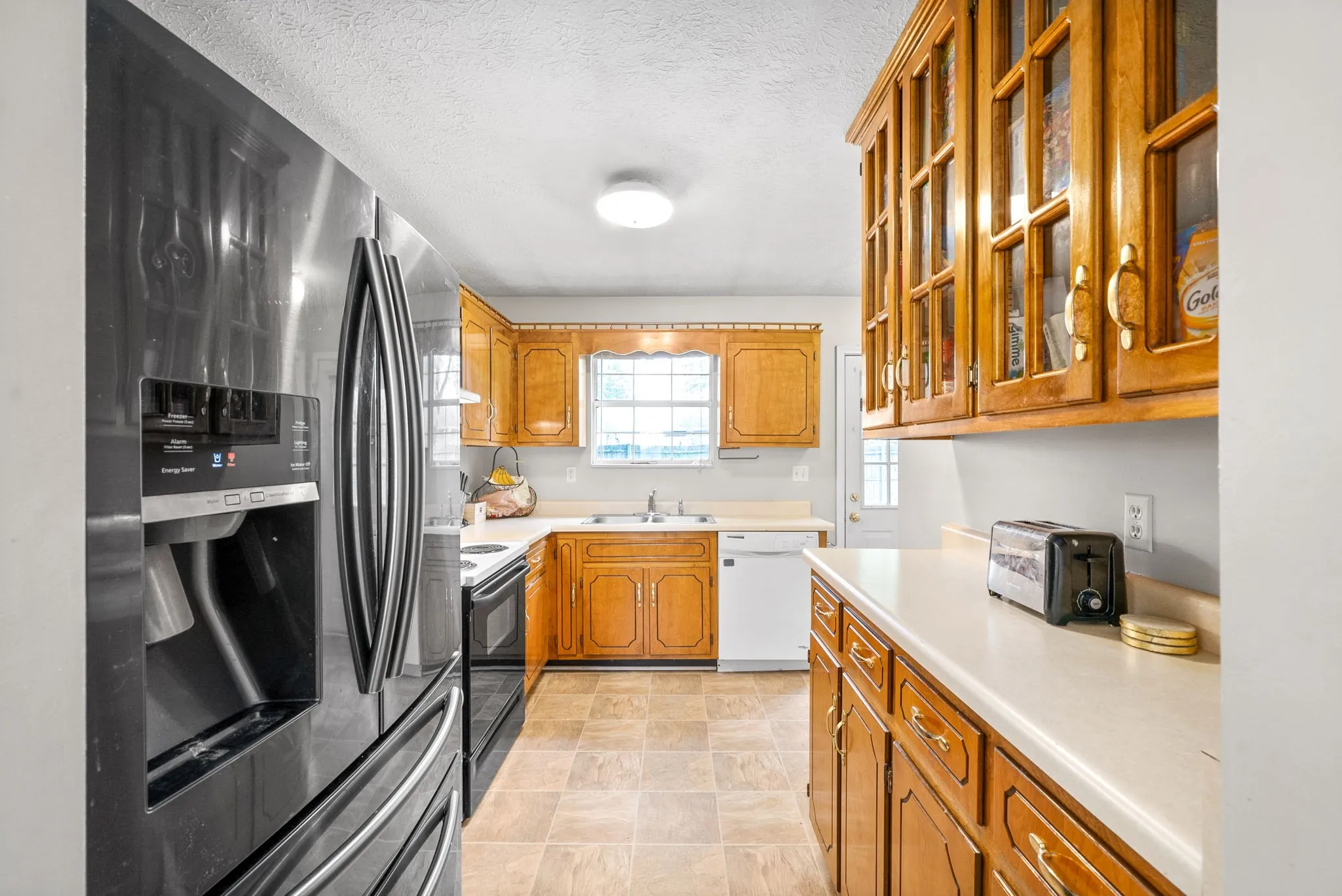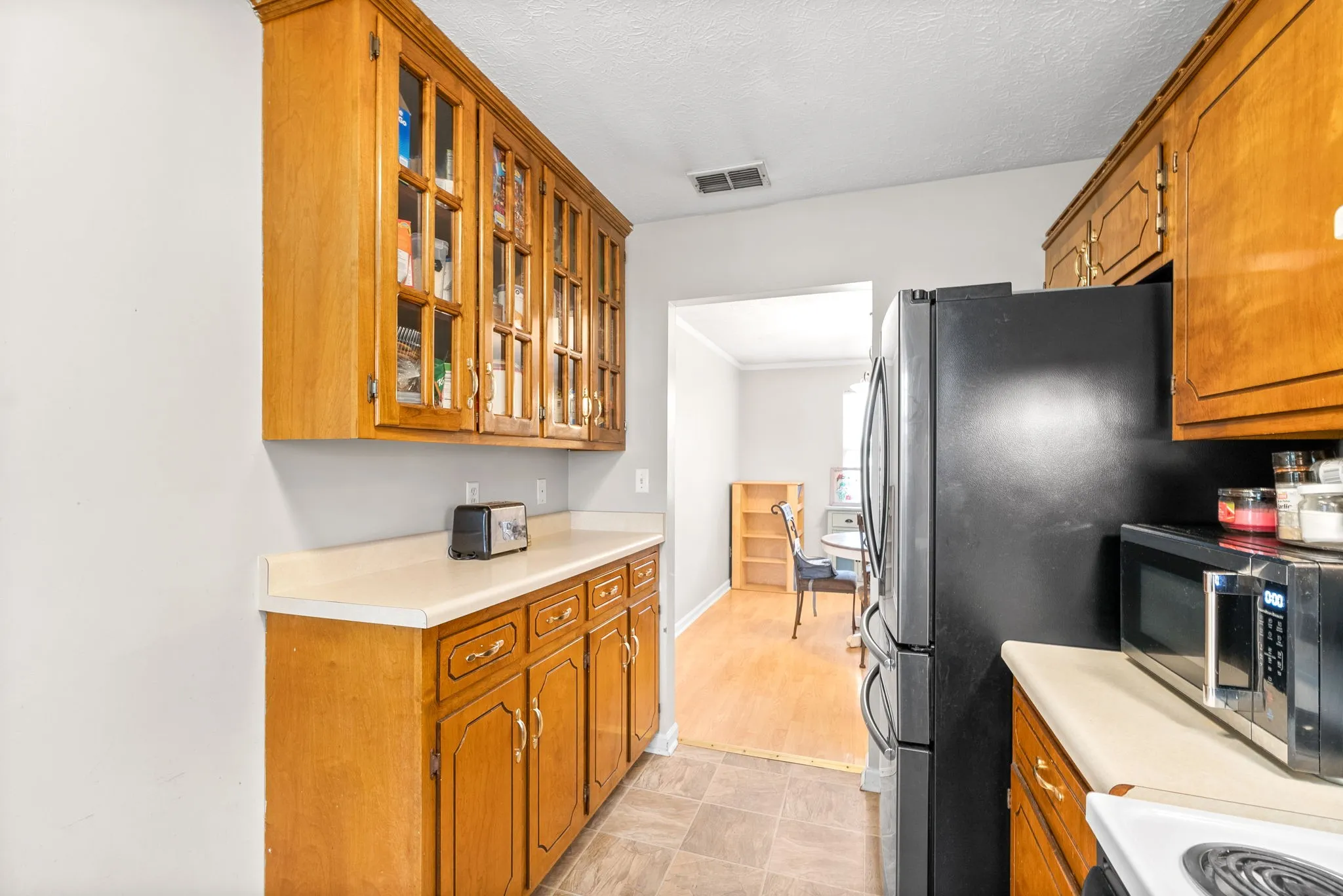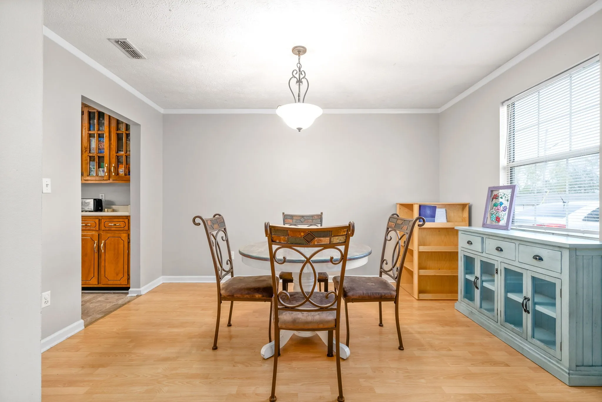 This Great Ranch home is freshly painted a Neutral Color Palette Throughout pairing perfectly with a Golden Wood Flooring that travels through the Expansive Living and Dining Areas. The Impeccable wood flooring continues down the hallway where you are met by THREE Impressive Bedrooms. The Generous Master is complete with New Plush Carpet, Extra Large Closet and Full Bathroom. Secondary Bedrooms include ample closet space and impressive amount of space! Saving the Best for Last, this Country Kitchen offers an abundance of counter and cabinet space. The Honey Wood Coloring of the cabinetry truly is a statement piece in the kitchen with a mix of closed and glass cabinet doors on the upper cabinets. This amount of kitchen is a rare find! Completed with a fenced yard, storage shed and garage.