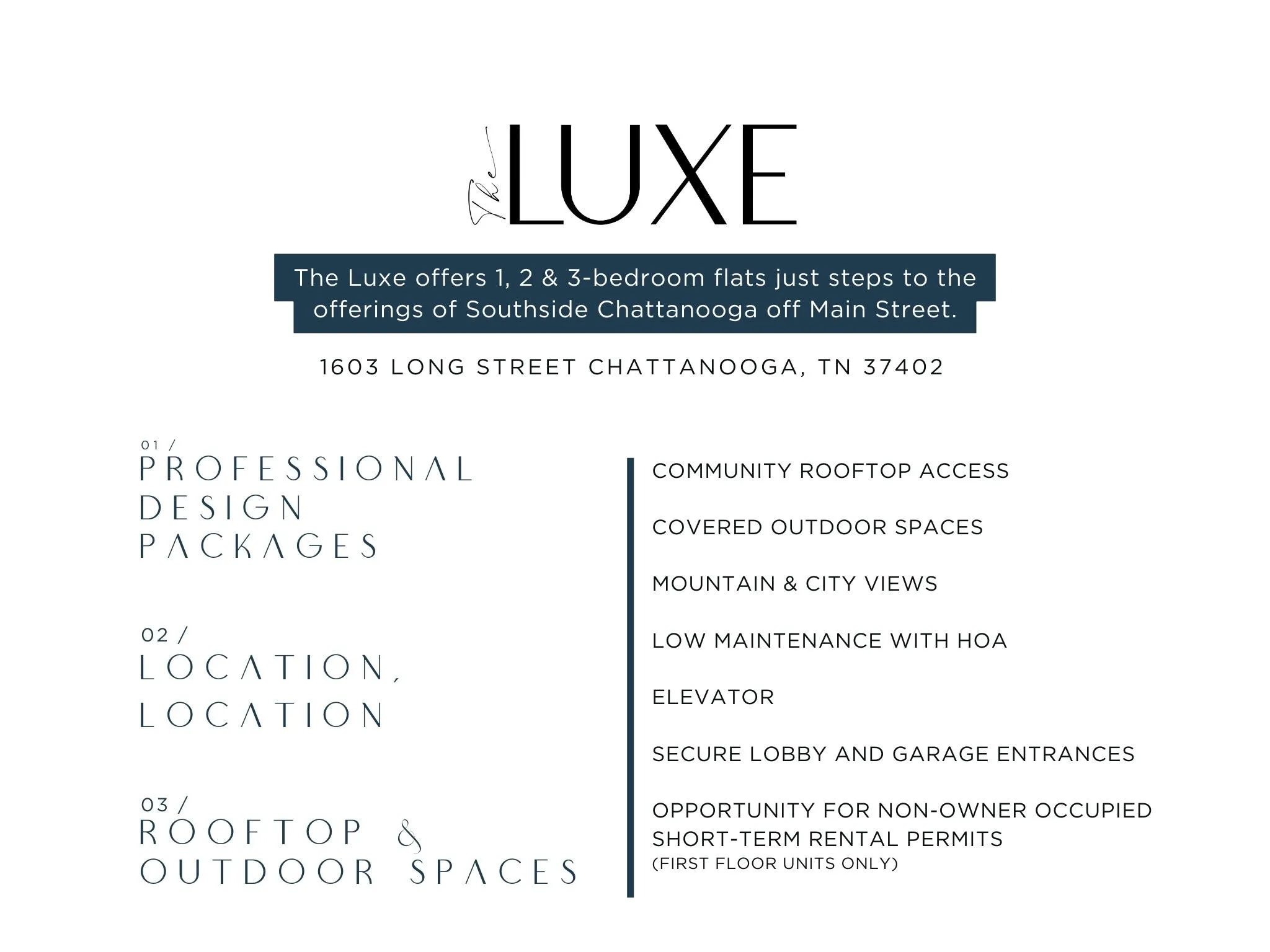 The Luxe is a newly constructed condominium community at 1603 Long Street in Chattanooga’s Southside Historic District. With 1, 2, and 3-bedroom condos, living spaces range from 921 sq ft to over 1,900 sq ft. Early residents enjoy the option of selecting from four professionally designed finish packages. The Luxe also offers limited opportunities (including Unit 102) for non-owner-occupied short-term rental permits. Unit 102 is a 2 bedroom, 2 bath first floor unit with 1,032 SF. This impressive building includes a professionally designed lobby entrance with an elevator, a secure parking garage on the first floor, and a community rooftop space with breathtaking mountain and city views. This is the ideal urban address, located steps away from over 40 local dining and entertainment options, medical facilities, and grocery stores like the new Broad Street Food City and Publix. Please note: The photos and renderings are for illustrative purposes only and may not be of this unit.